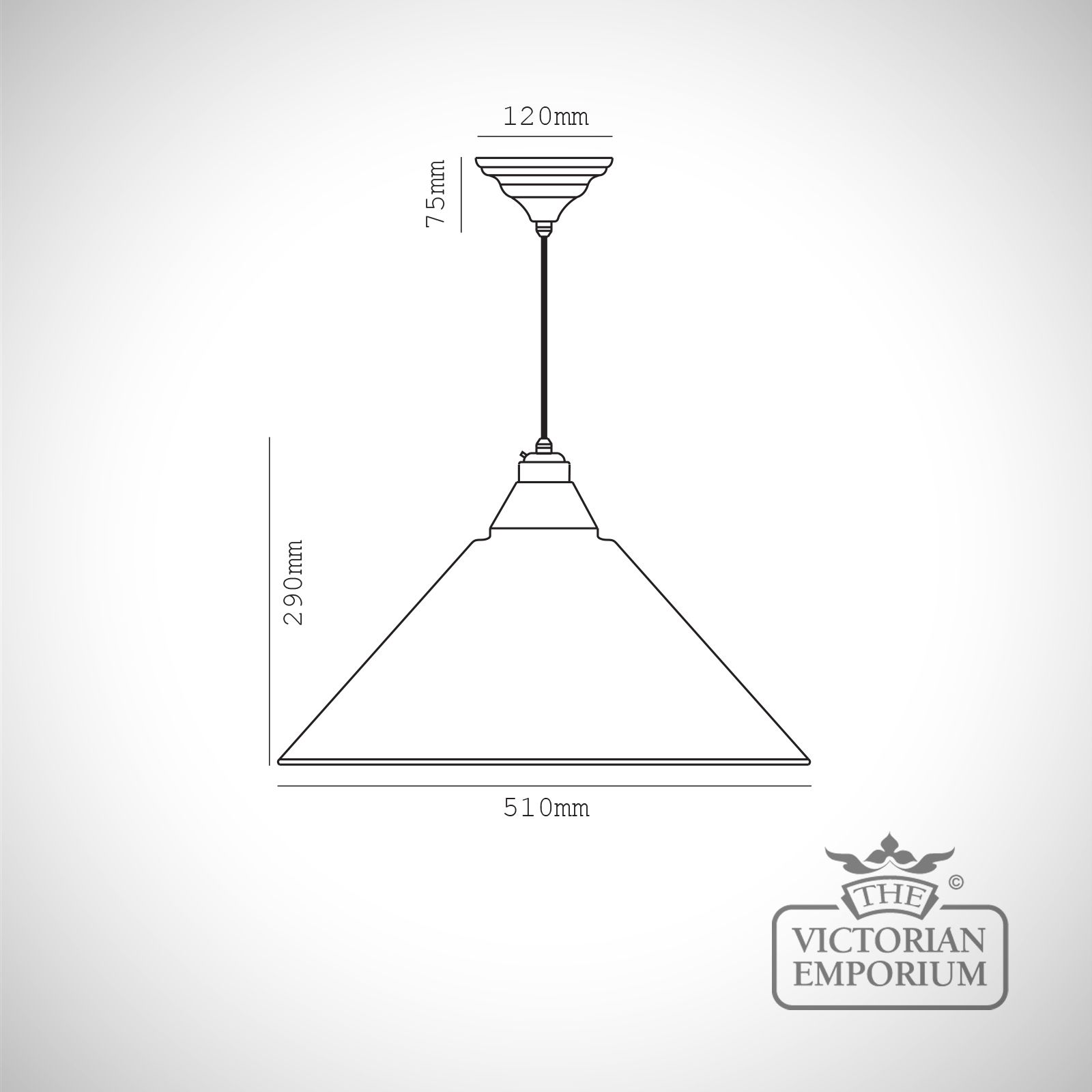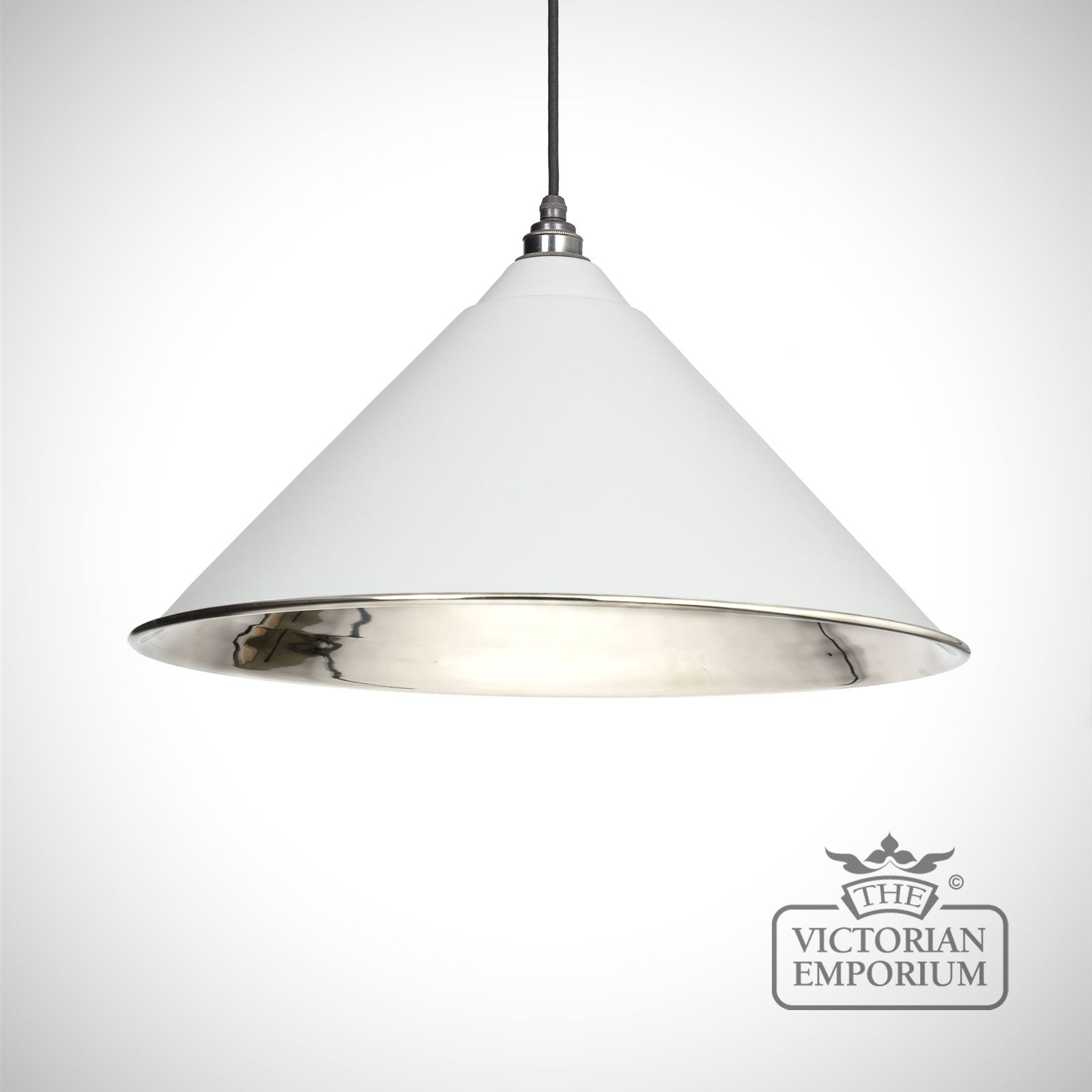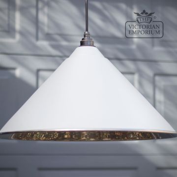 The Hockliffe’s large conical shape creates a less traditional feel in smooth nickel with a light grey exterior, and can be hung as a centre piece or grouped to create a statement