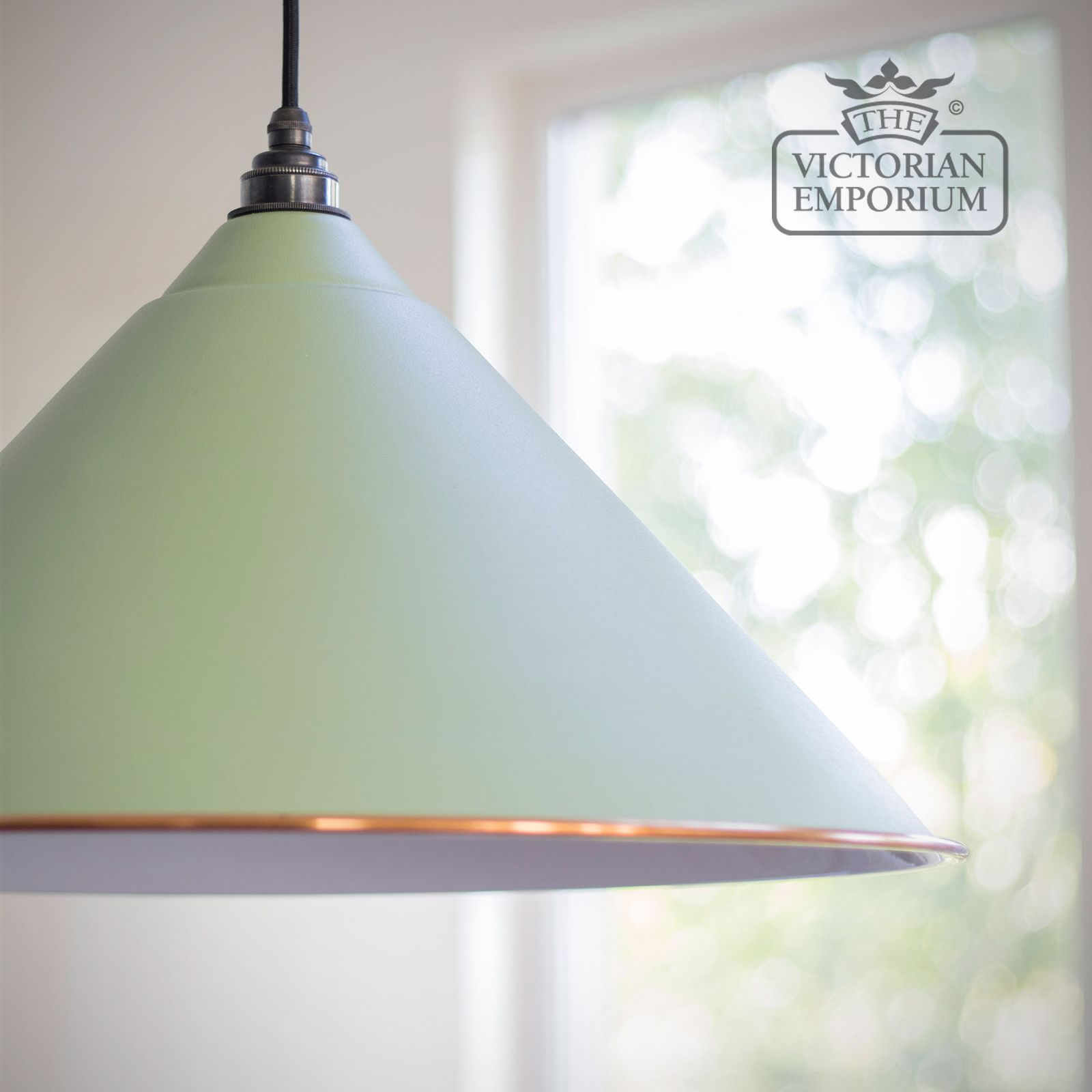 The Hockliffe’s large conical shape creates a more modern feel with Sage Green exterior & White Gloss interior. It can be hung as a centrepiece or grouped to create a statement