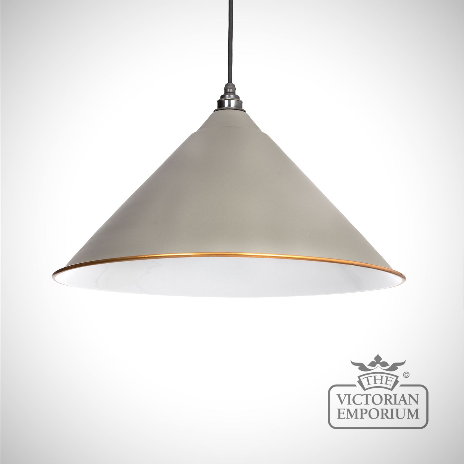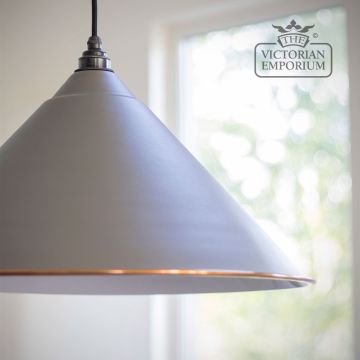 The Hockliffe’s large conical shape creates a more modern feel with Matt Pale Blue exterior & White Gloss interior. It can be hung as a centrepiece or grouped to create a statement