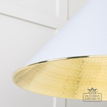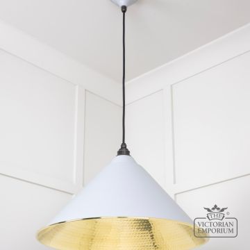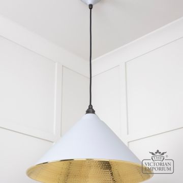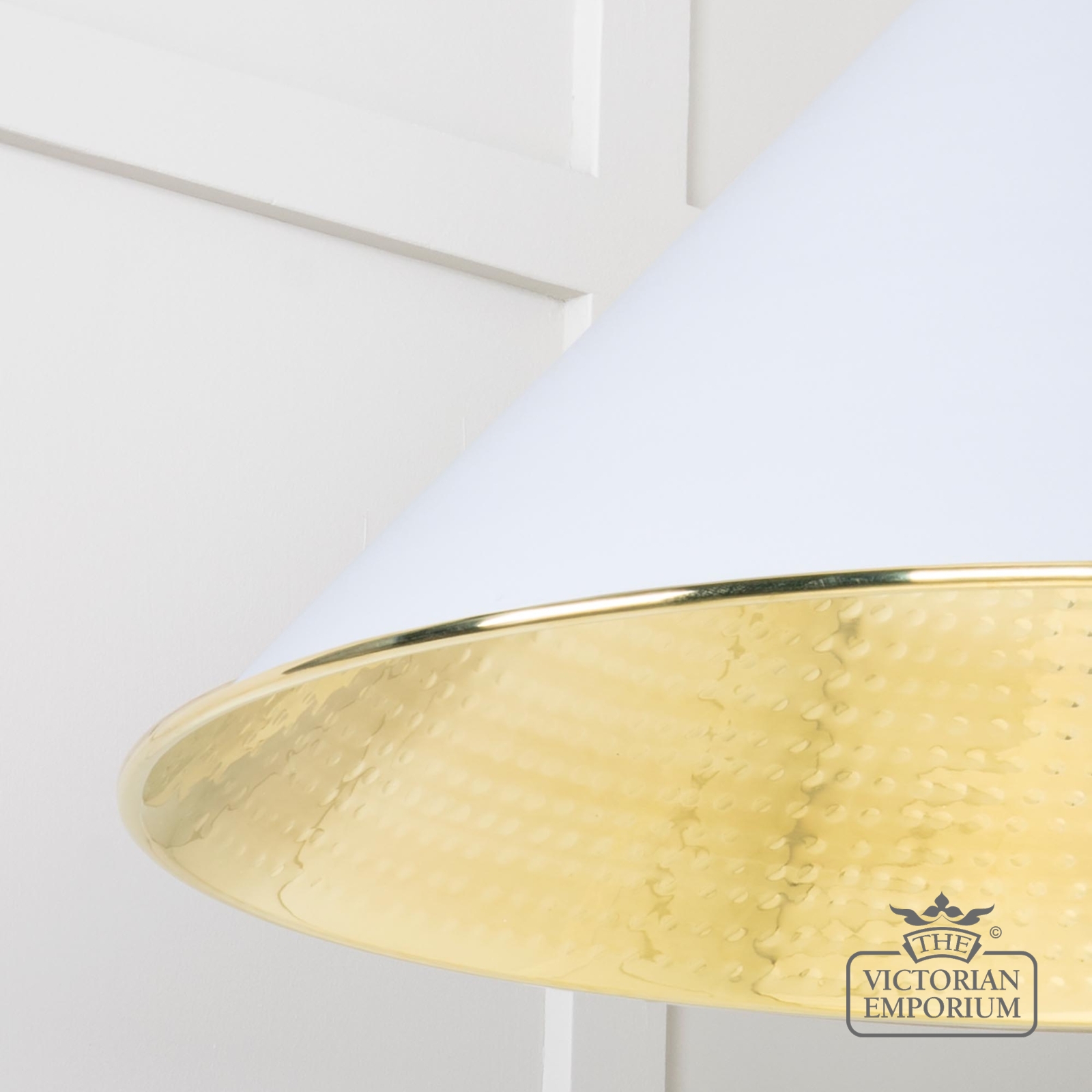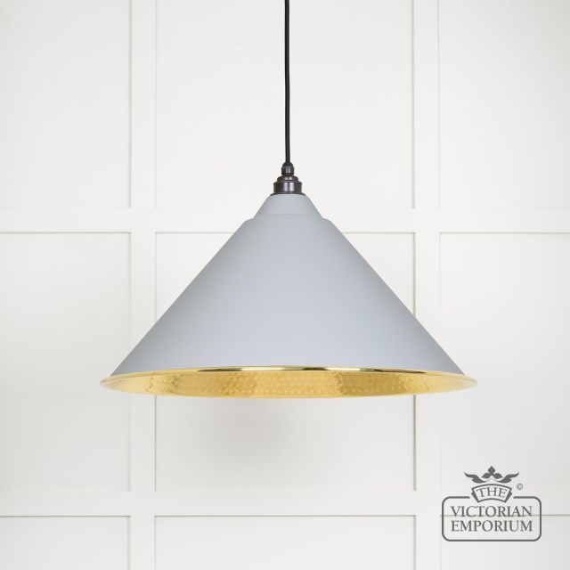 The Hockliffe’s large conical shape creates a more modern feel in traditional brass with a Birch exterior. It can be hung as a centrepiece or grouped to create a statement