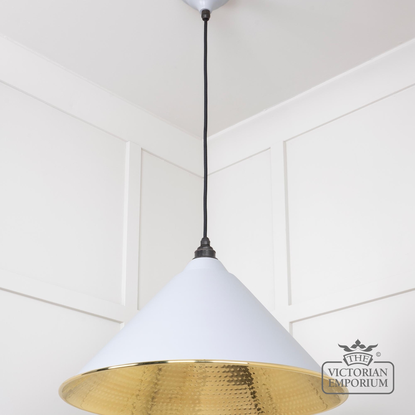 This pendant is hand spun from solid brass and finished in a hammered effect with a black fabric cable