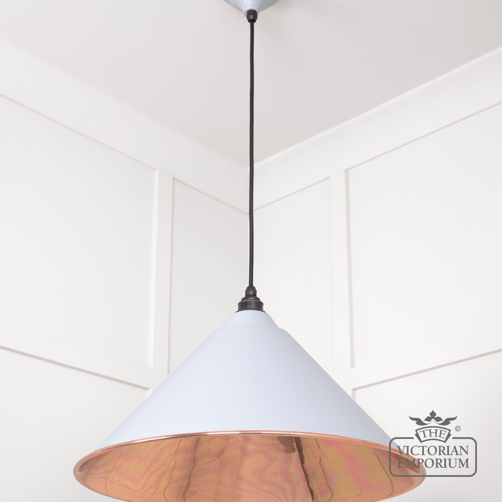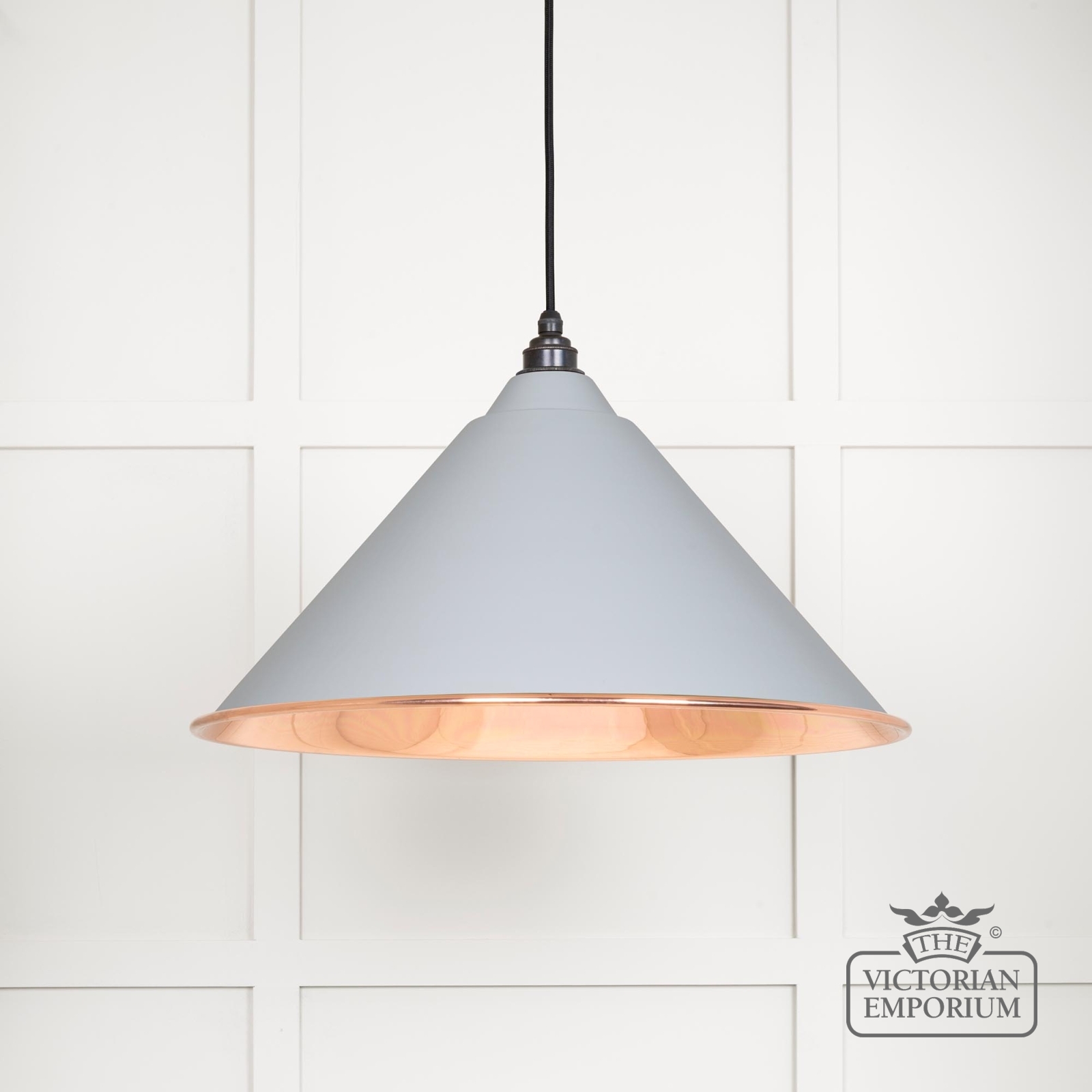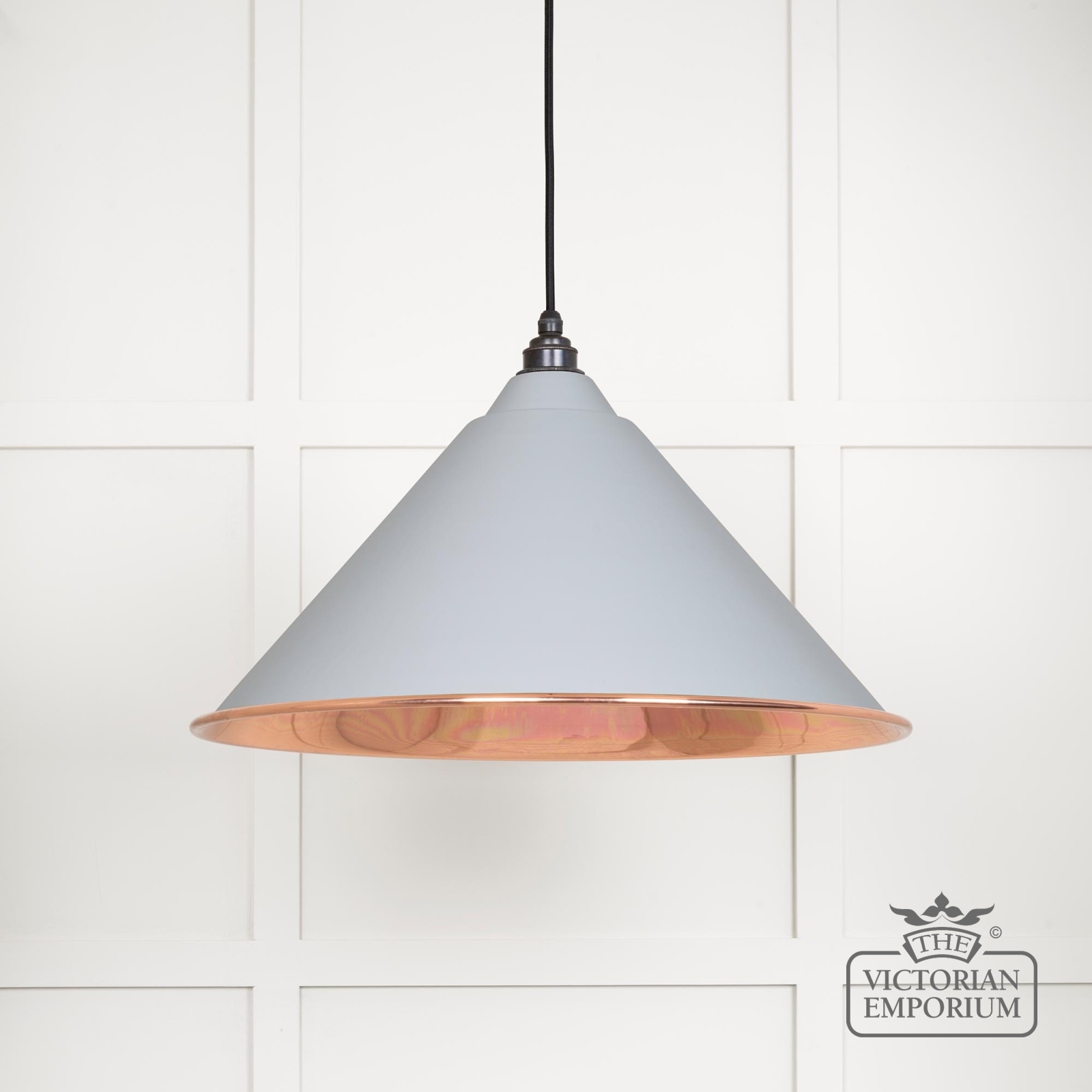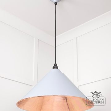The Hockliffe’s conical shape creates a more modern feel in traditional copper with a Birch exterior. It can be hung as a centrepiece or grouped to create a statement