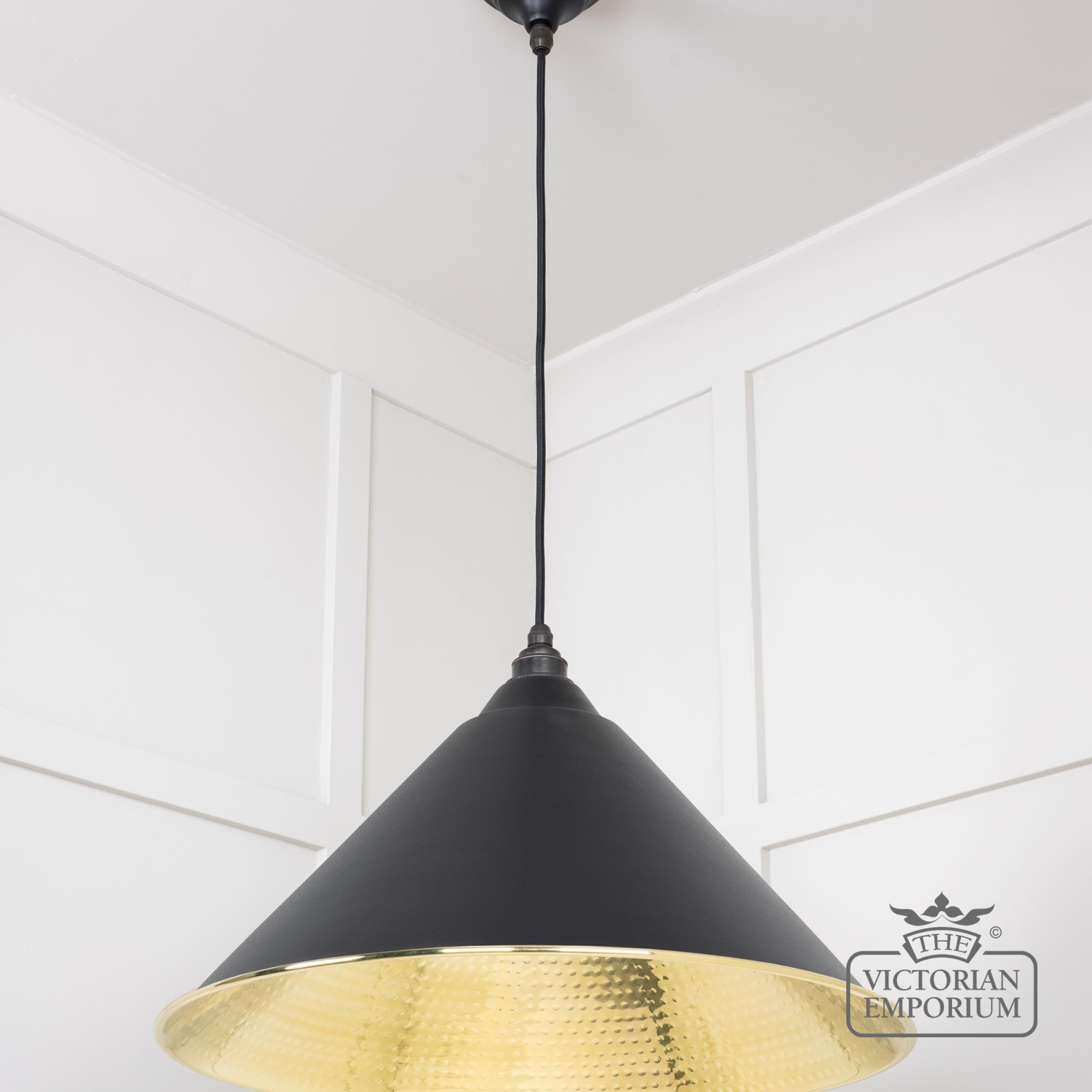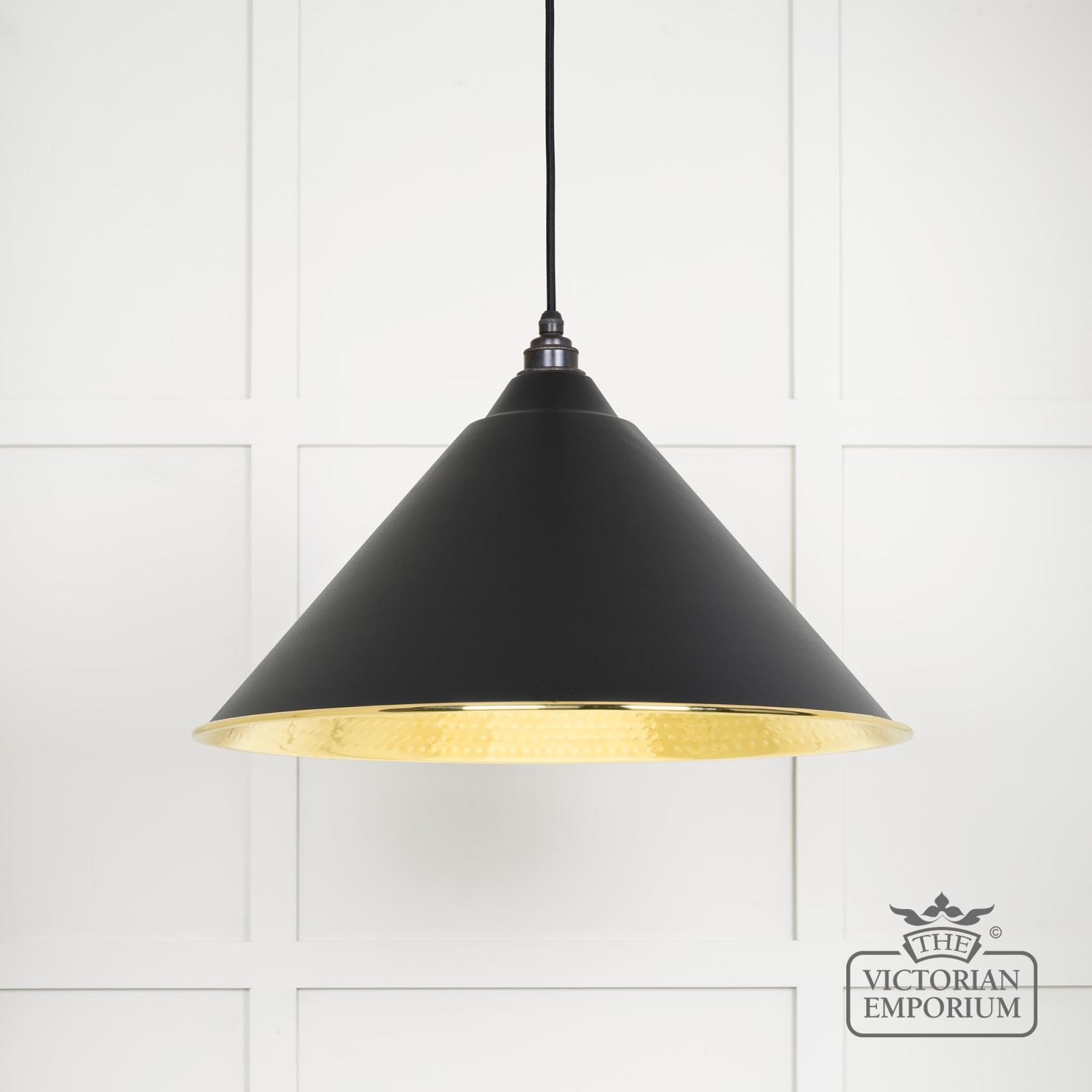 The Hockliffe’s large conical shape creates a more modern feel in traditional brass with a Black exterior. It can be hung as a centrepiece or grouped to create a statement