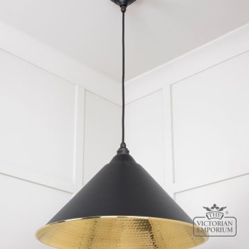 This pendant is hand spun from solid brass and finished in a hammered effect with a black fabric cable