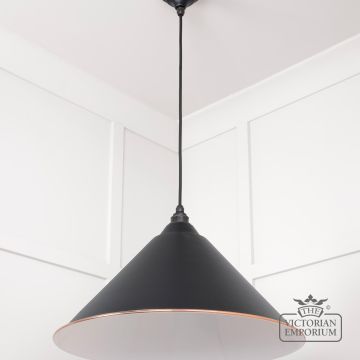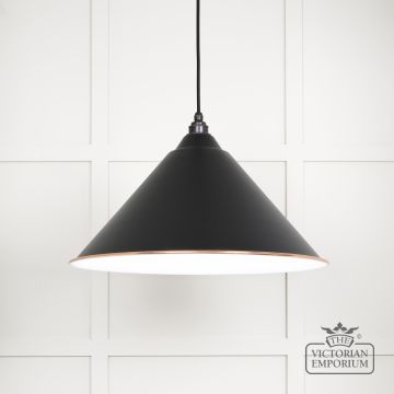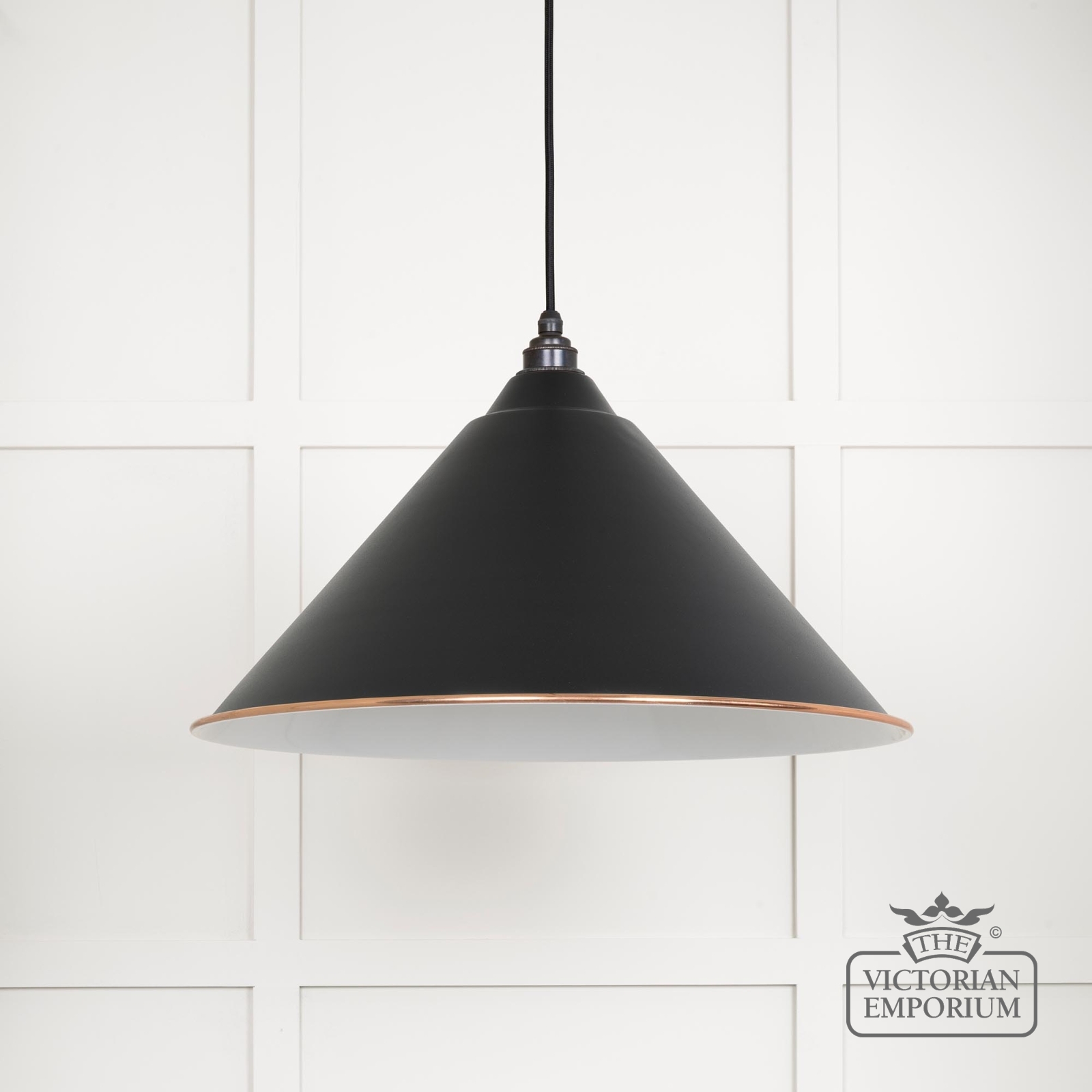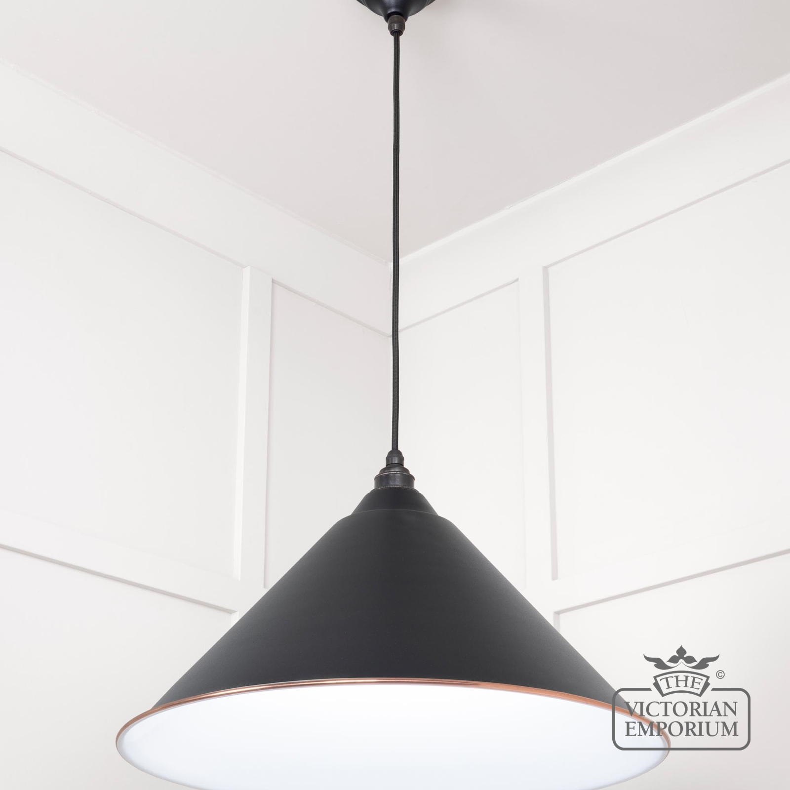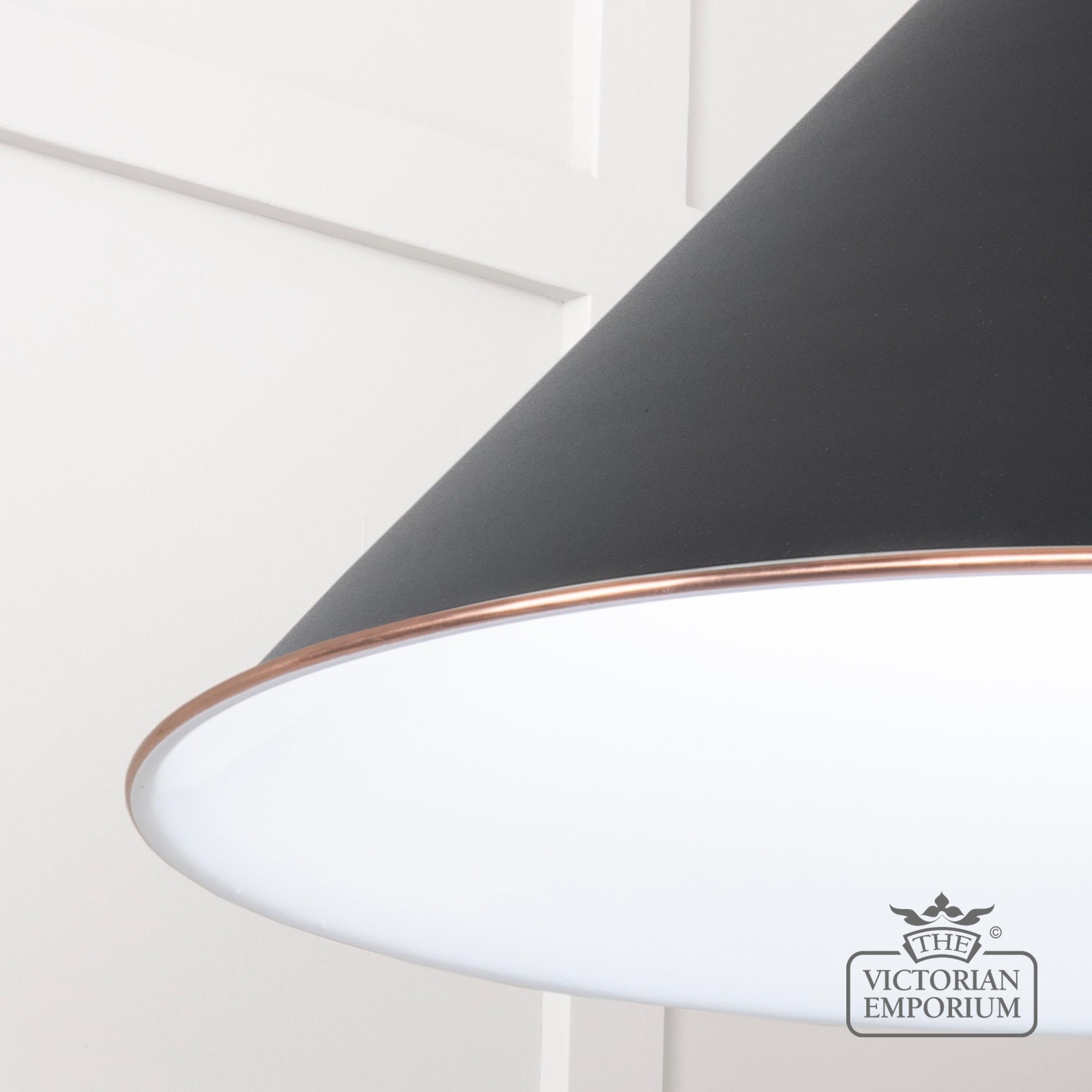 The Hockliffe’s conical shape creates a more modern feel in painted Black exterior and white gloss interior. It can be hung as a centrepiece or grouped to create a statement
