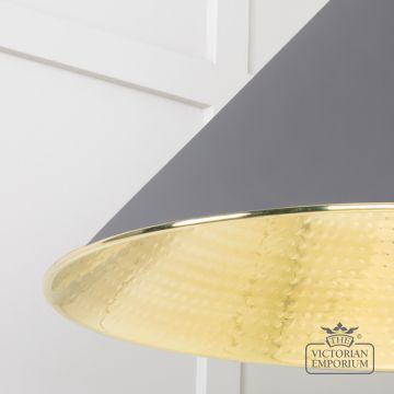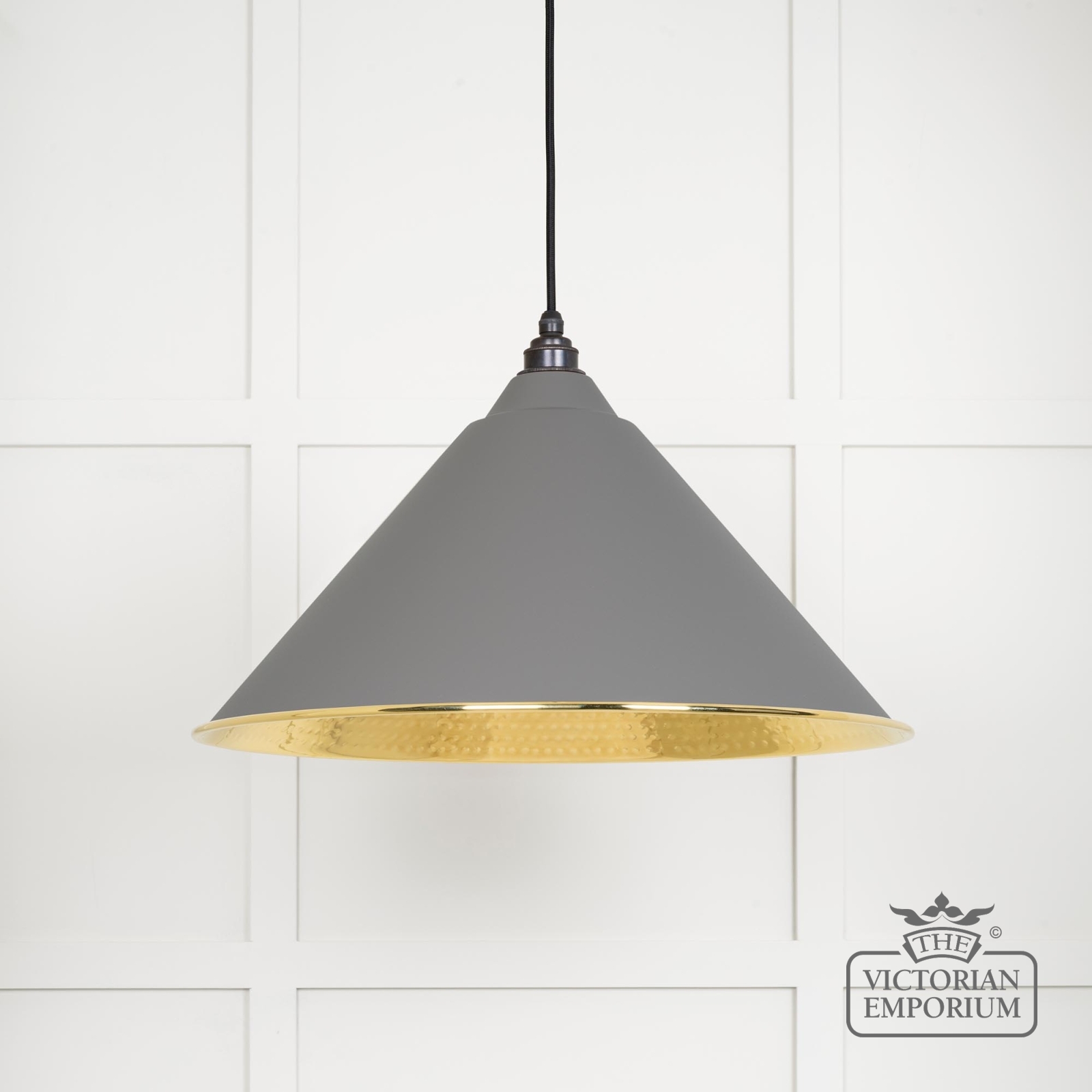 The Hockliffe’s large conical shape creates a more modern feel in traditional brass with a Bluff exterior. It can be hung as a centrepiece or grouped to create a statement