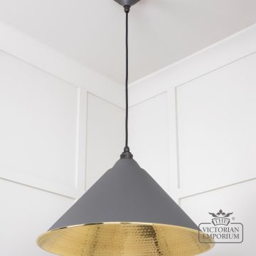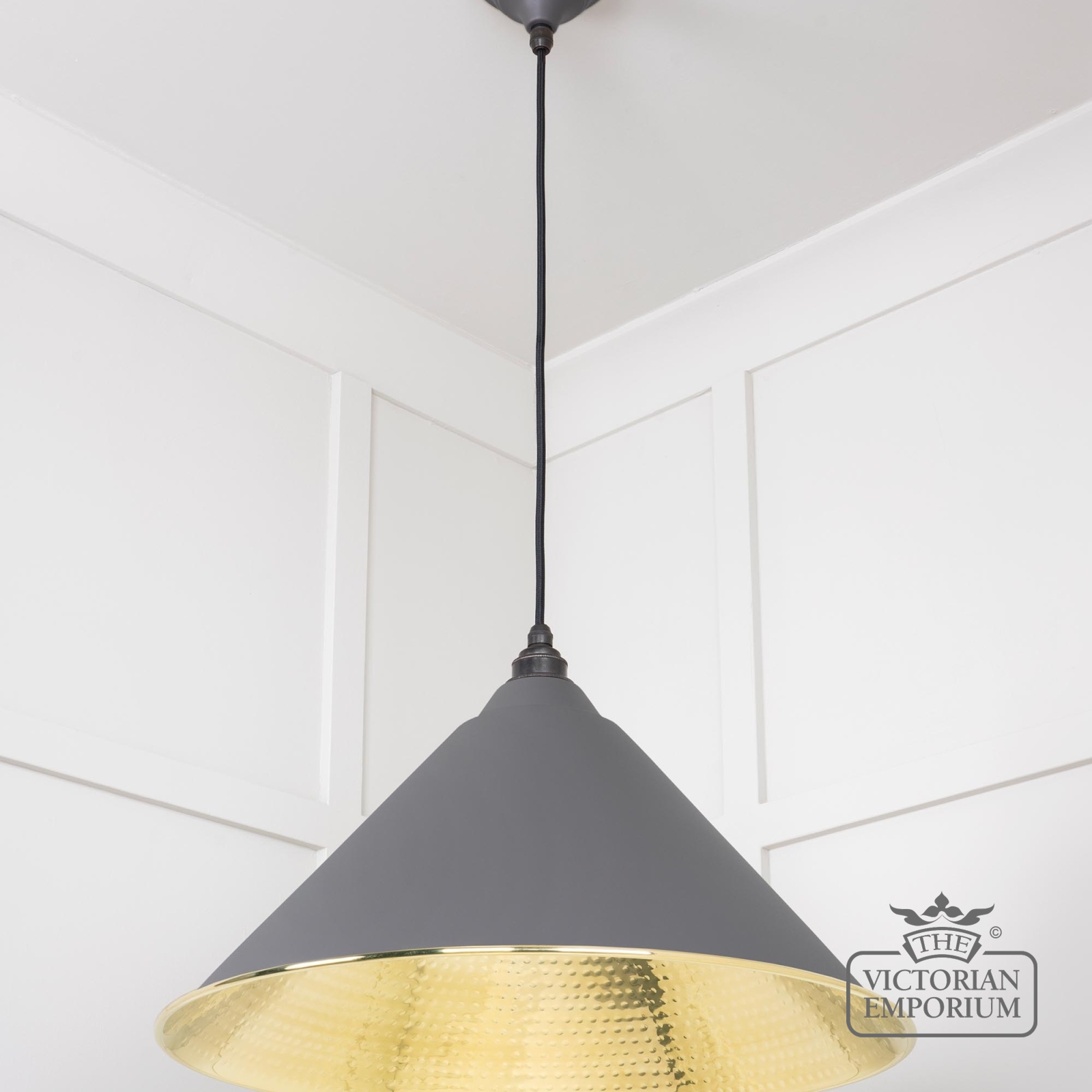 This pendant is hand spun from solid brass and finished in a hammered effect with a black fabric cable