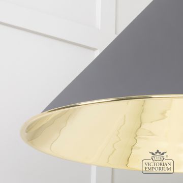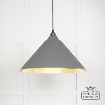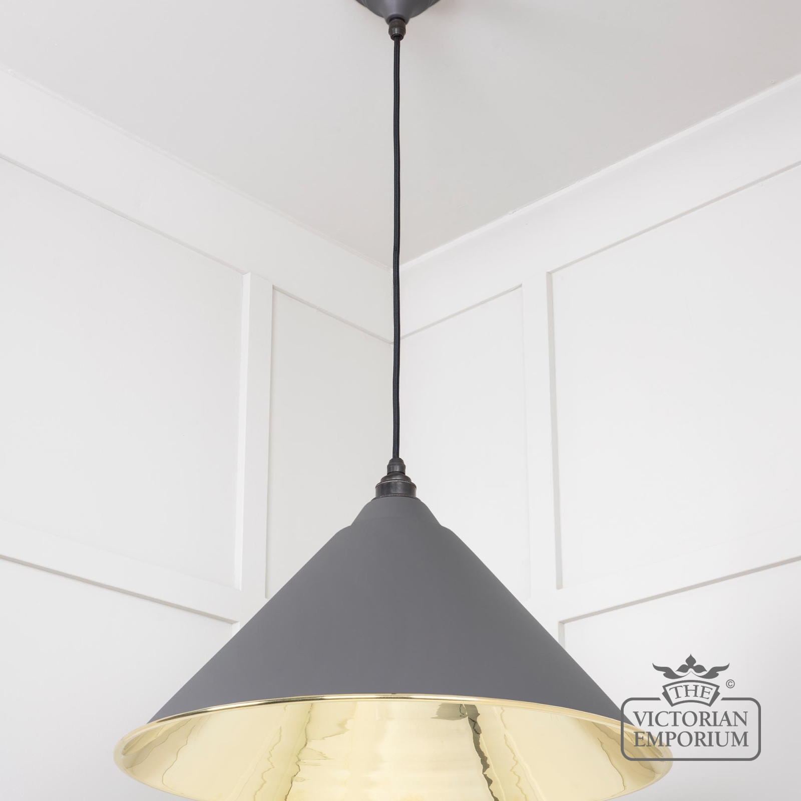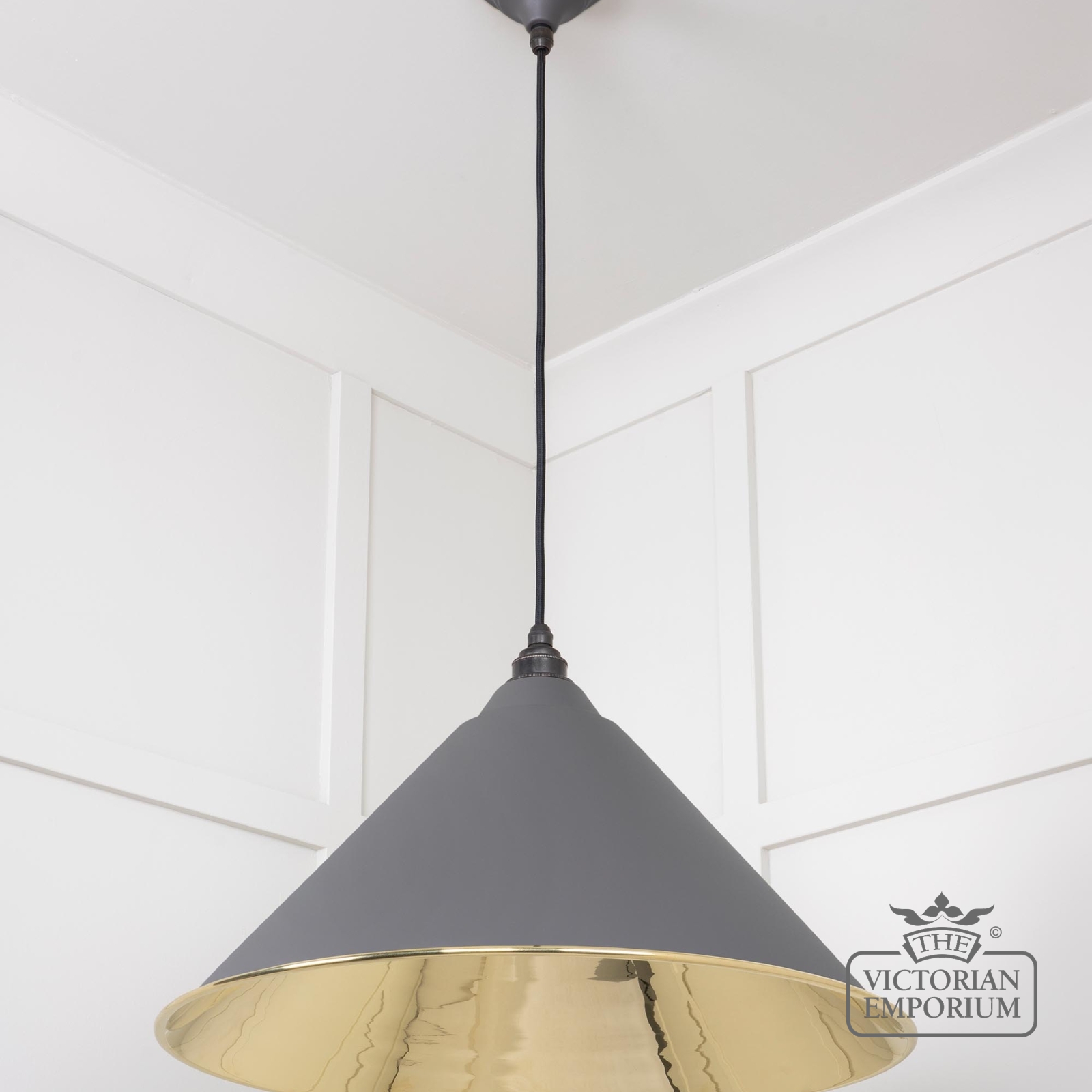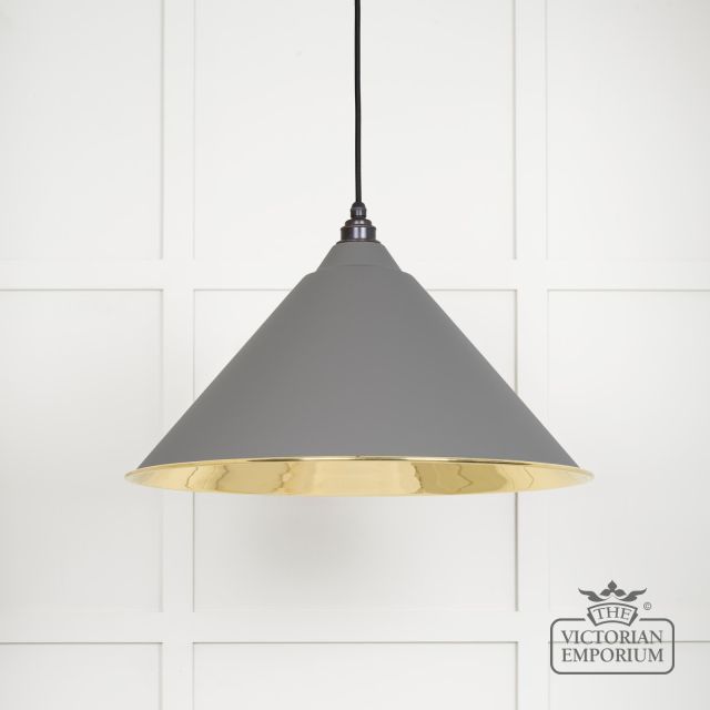 The Hockliffe’s large conical shape creates a more modern feel in traditional brass with a Bluff exterior. It can be hung as a centrepiece or grouped to create a statement