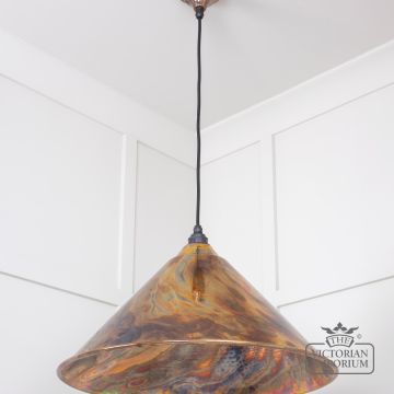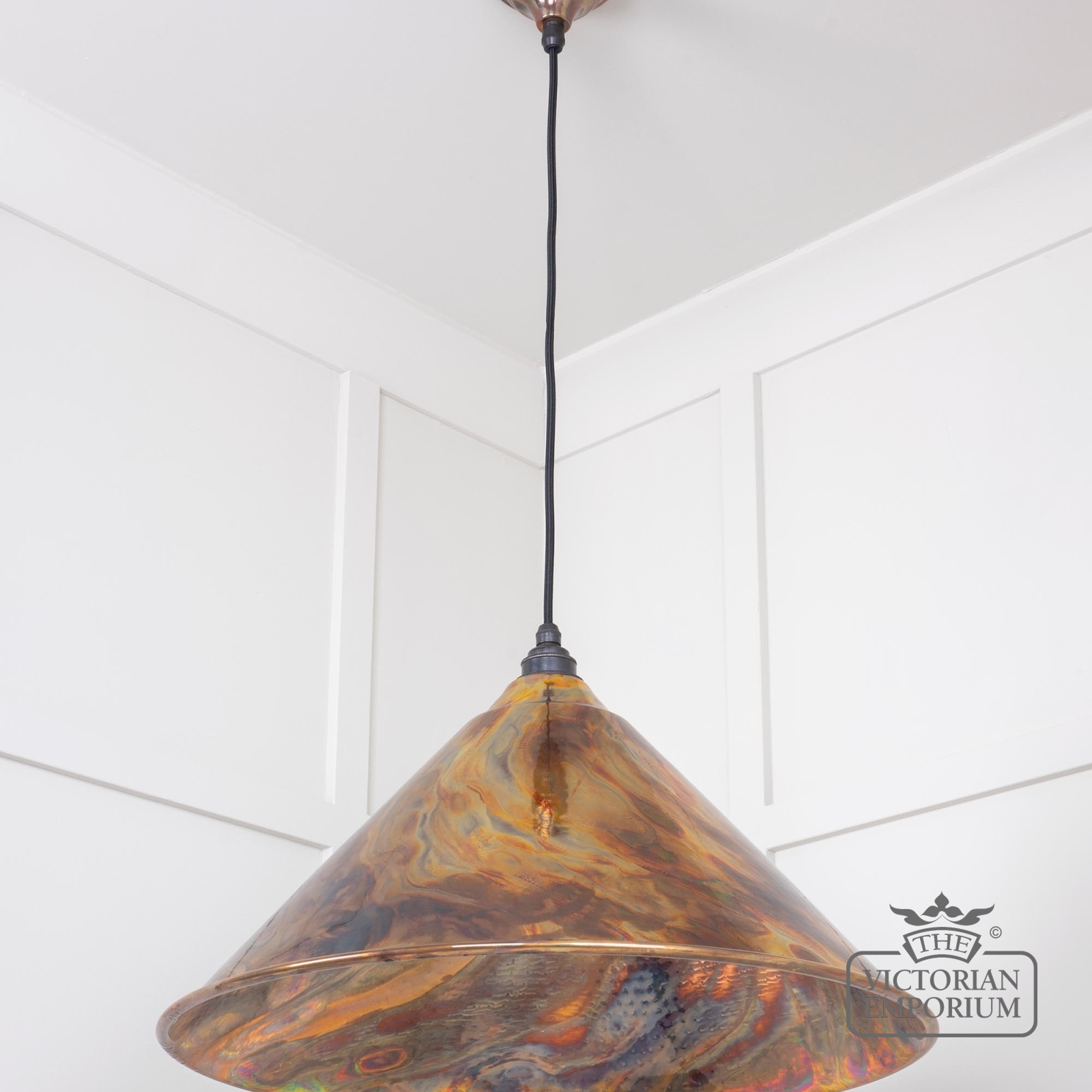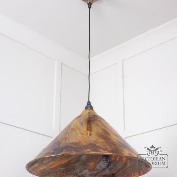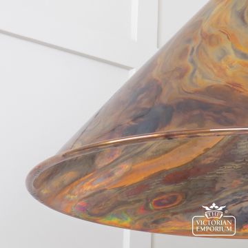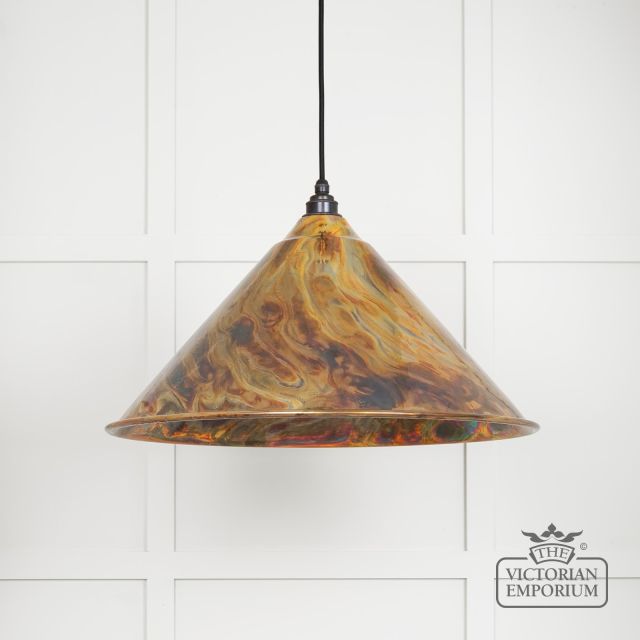 The Hockliffe’s large conical shape creates a more modern feel in a Burnished finish. It can be hung as a centrepiece or grouped to create a statement