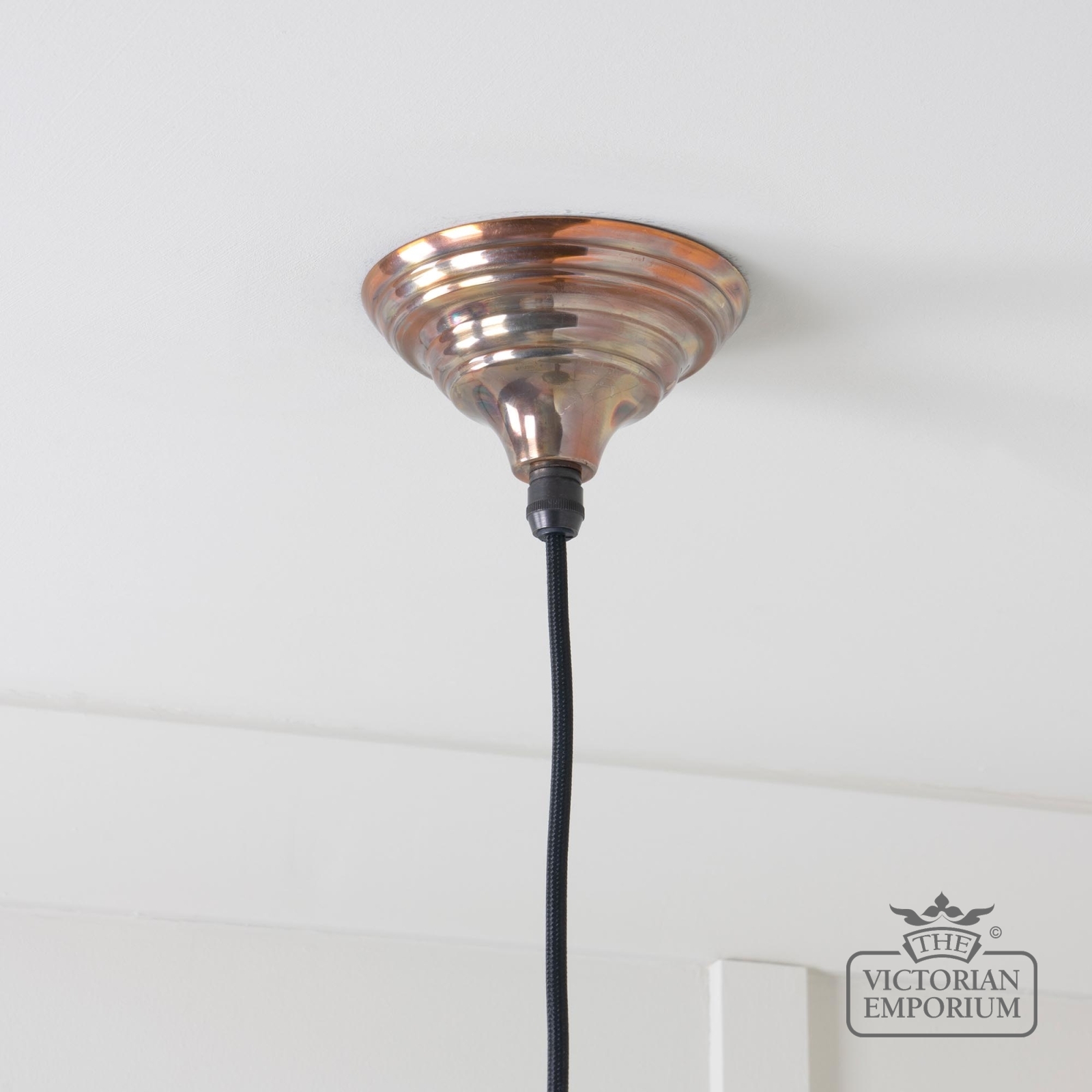 This pendant is hand spun from solid copper and a burnished finish with a black fabric cable