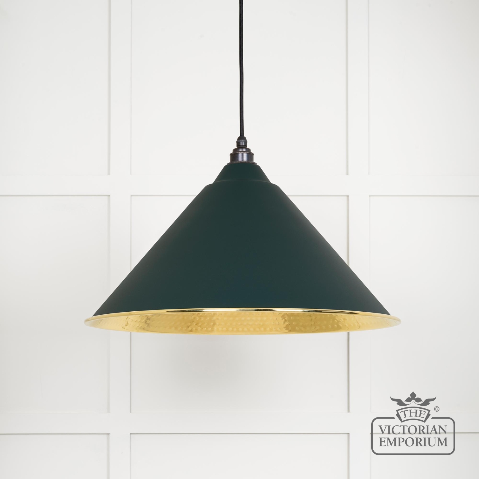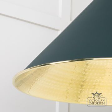 The Hockliffe’s large conical shape creates a more modern feel in traditional brass with a Dingle exterior. Can be hung as a centrepiece or grouped