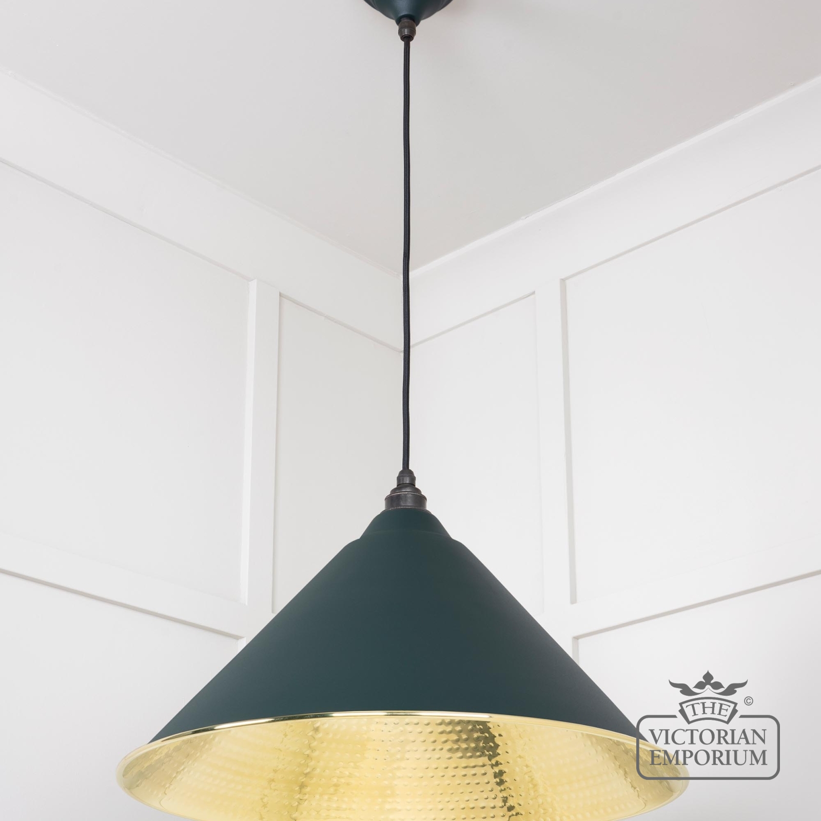 This pendant is hand spun from solid brass and finished in a hammered effect with a black fabric cable