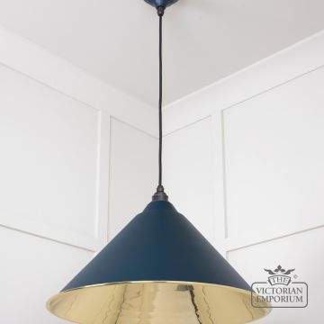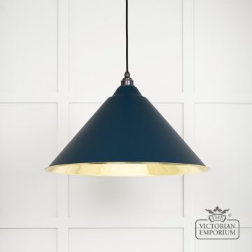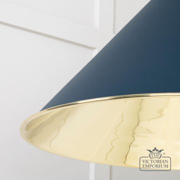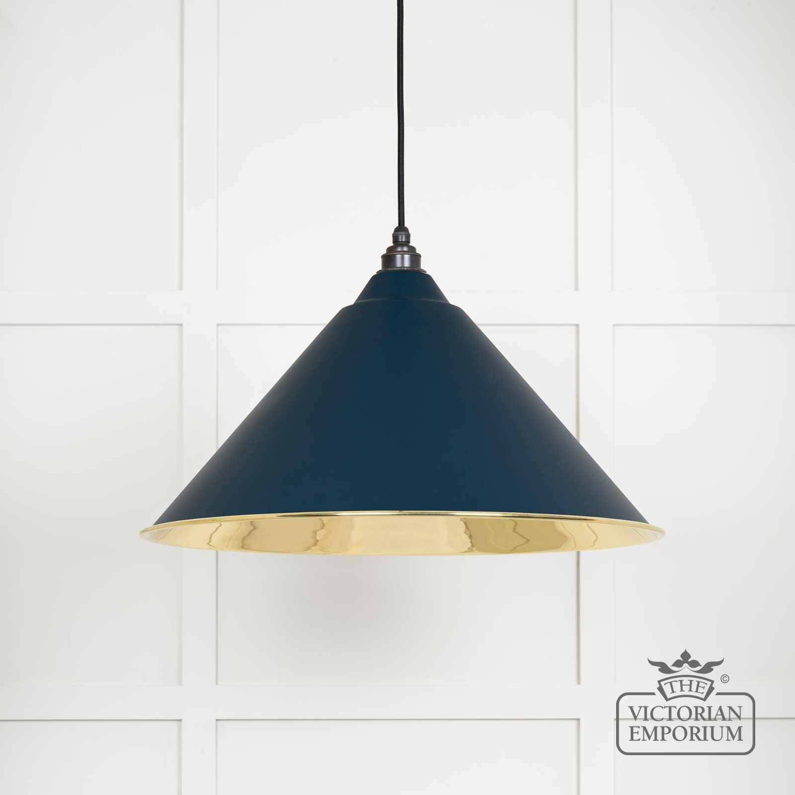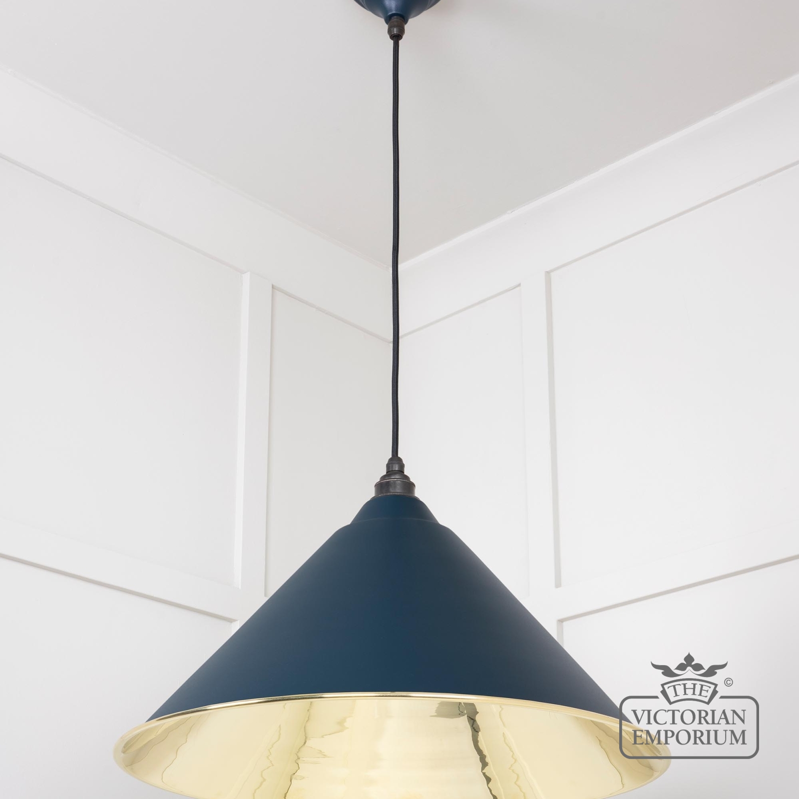 The Hockliffe’s large conical shape creates a more modern feel in traditional brass with a Dusk exterior. It can be hung as a centrepiece or grouped to create a statement