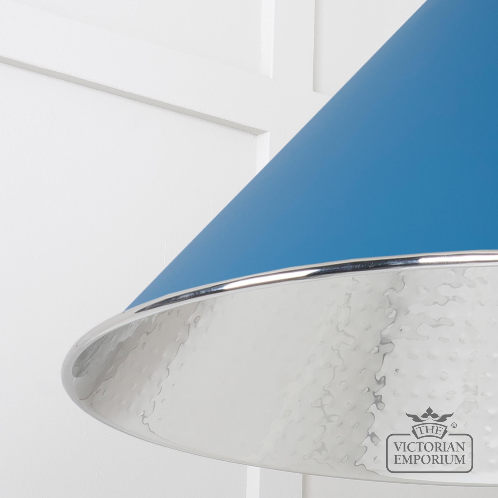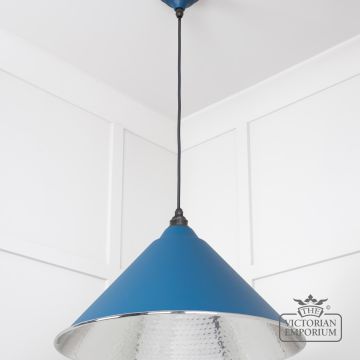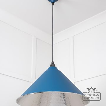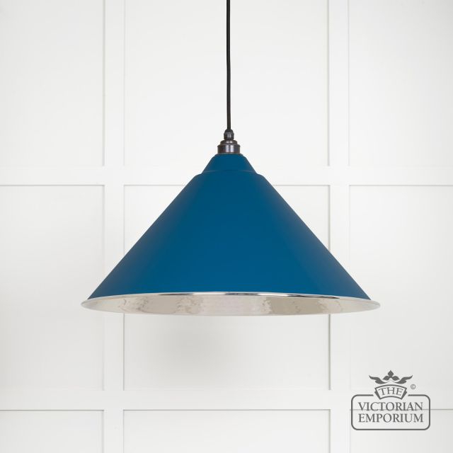 The Hockliffe’s conical shape creates a more modern feel in hammered nickel inside and upstream outside. It can be hung as a centrepiece or grouped to create a statement