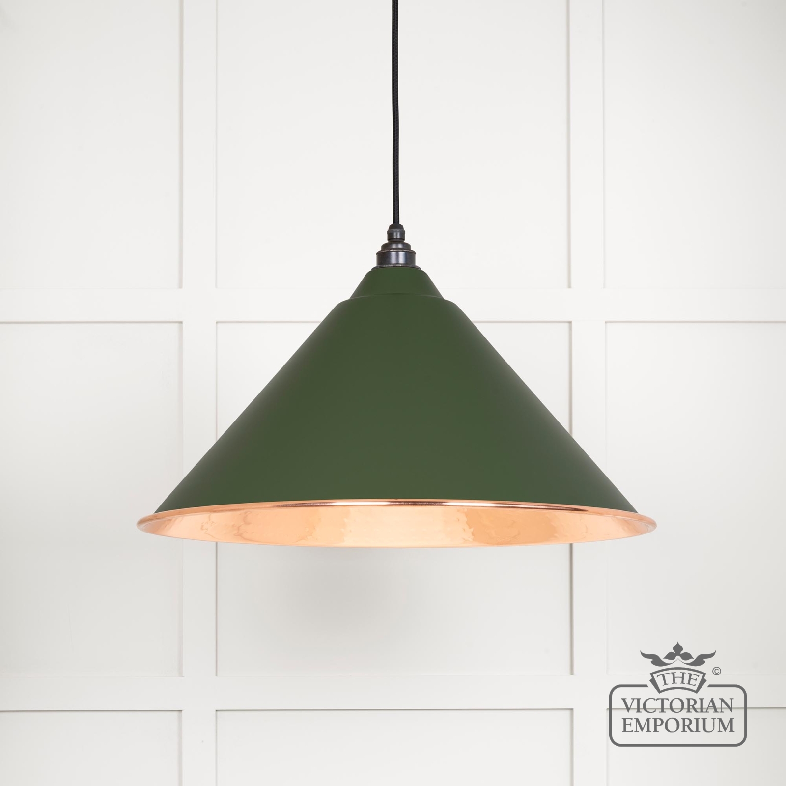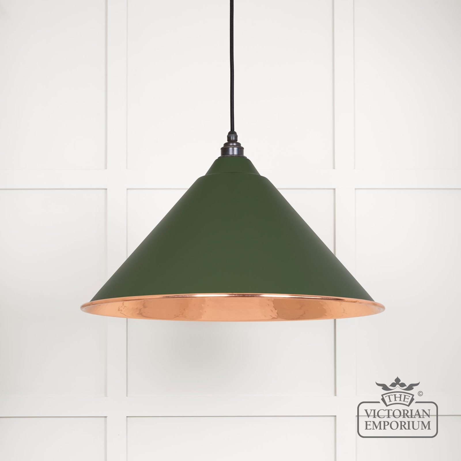 The Hockliffe’s conical shape creates a more modern feel in traditional copper with a Heath exterior. It can be hung as a centrepiece or grouped to create a statement
