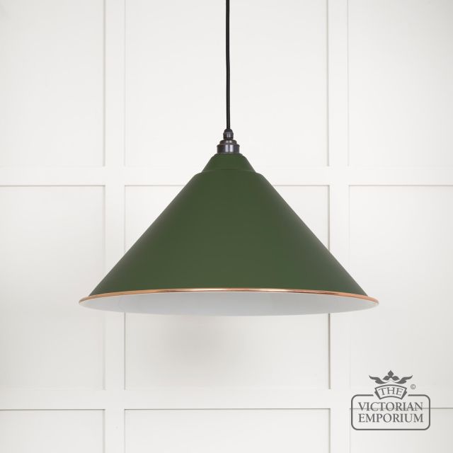 The Hockliffe’s conical shape creates a more modern feel in painted Heath exterior and white gloss interior. It can be hung as a centrepiece or grouped to create a statement
