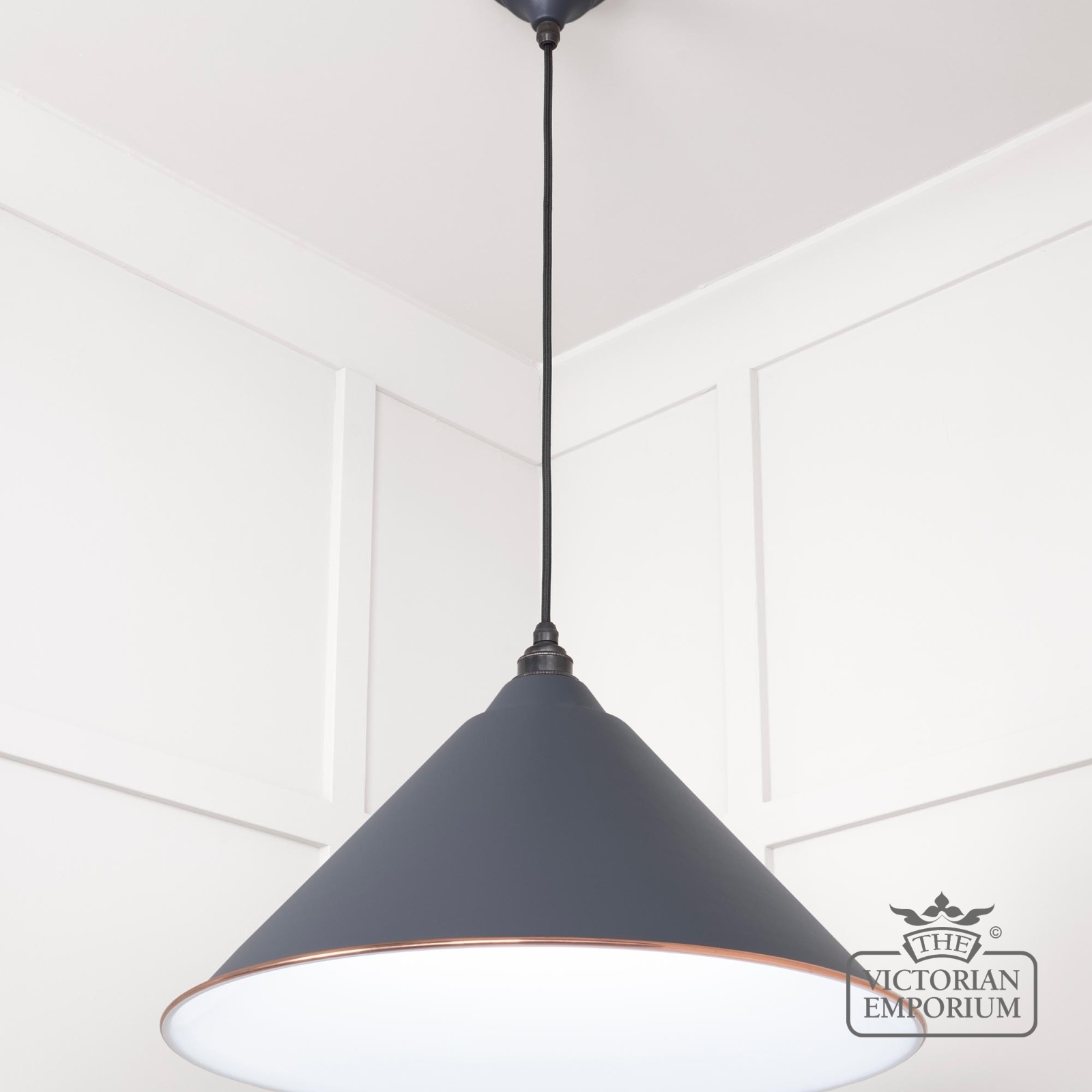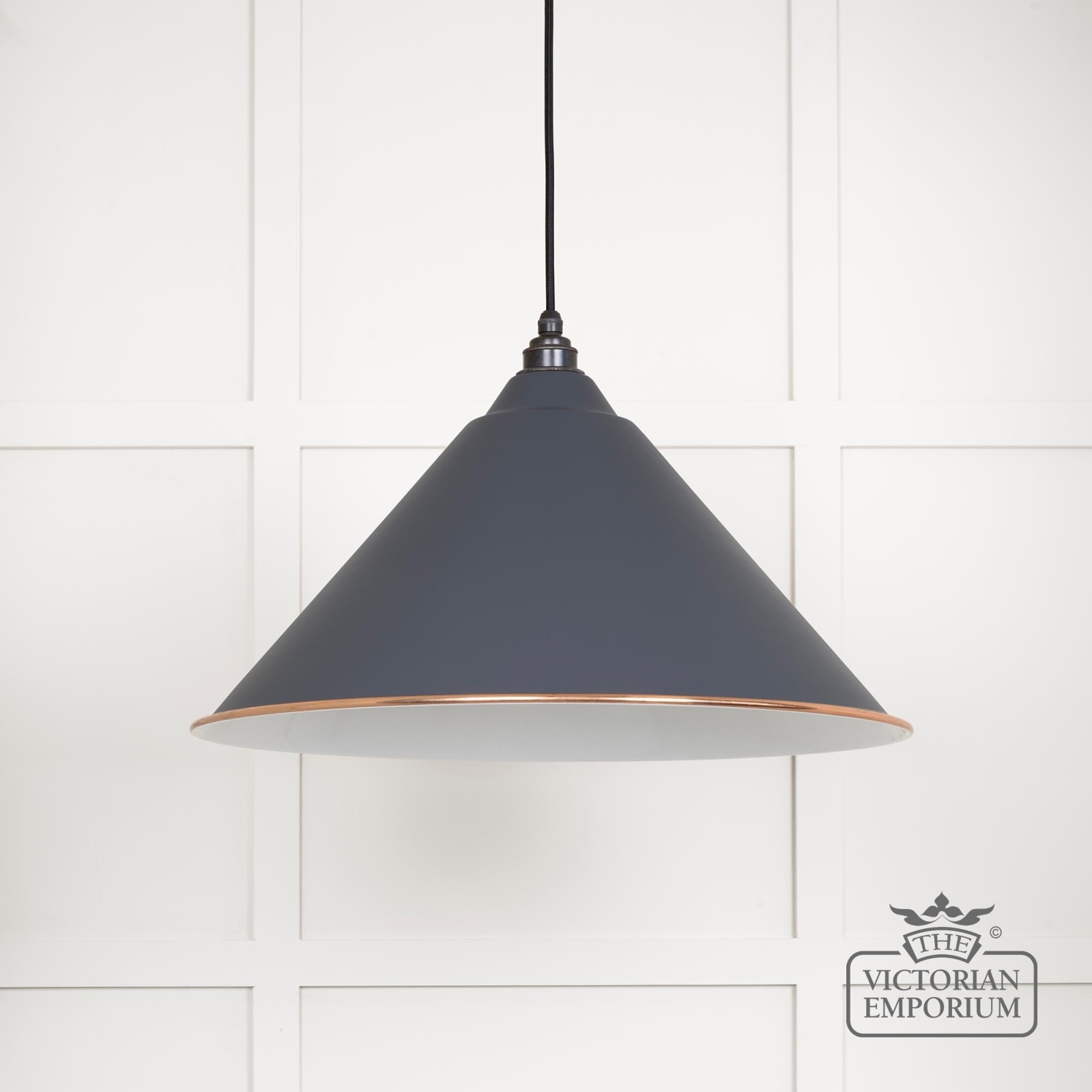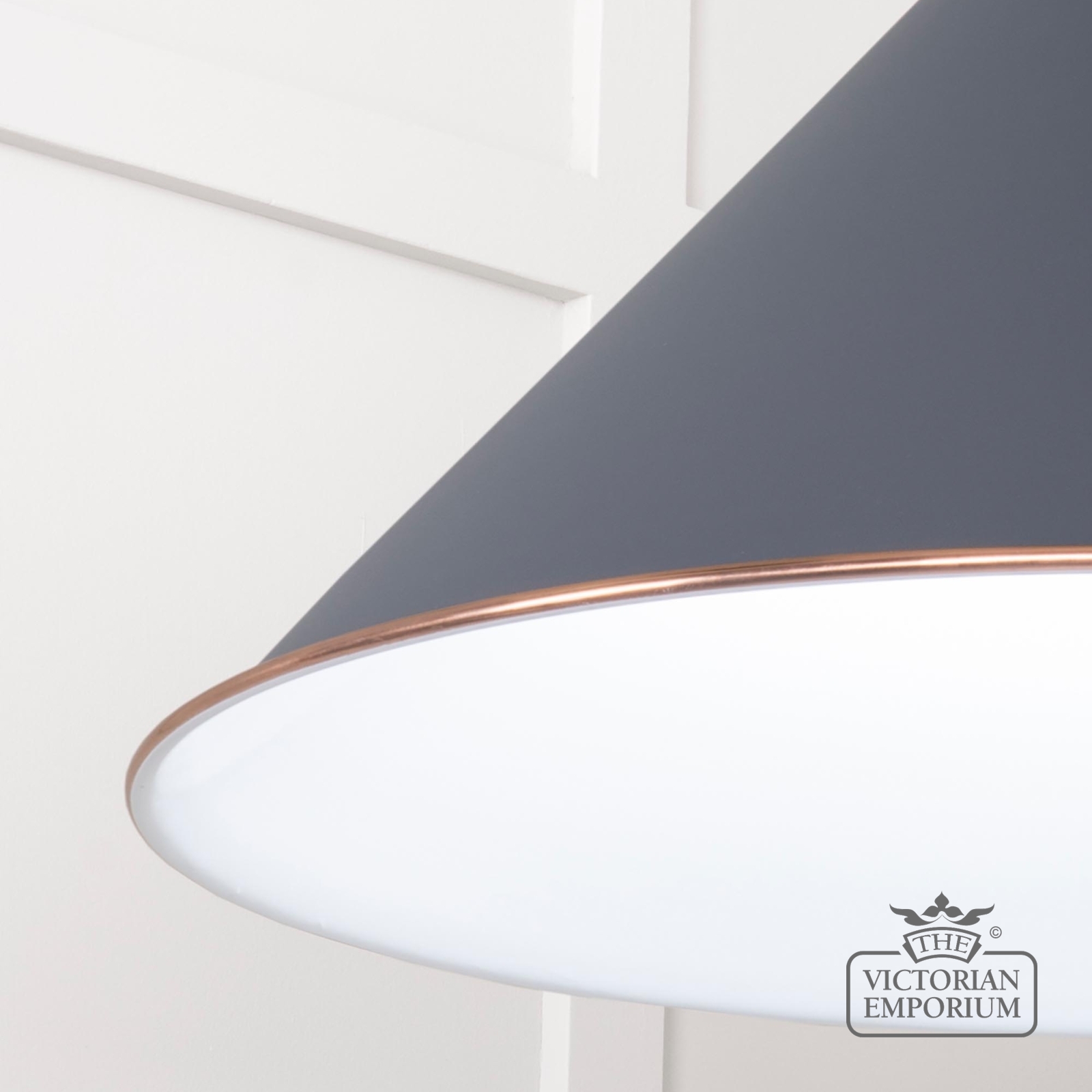 The Hockliffe’s conical shape creates a more modern feel in painted Slate exterior and white gloss interior. It can be hung as a centrepiece or grouped to create a statement