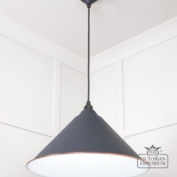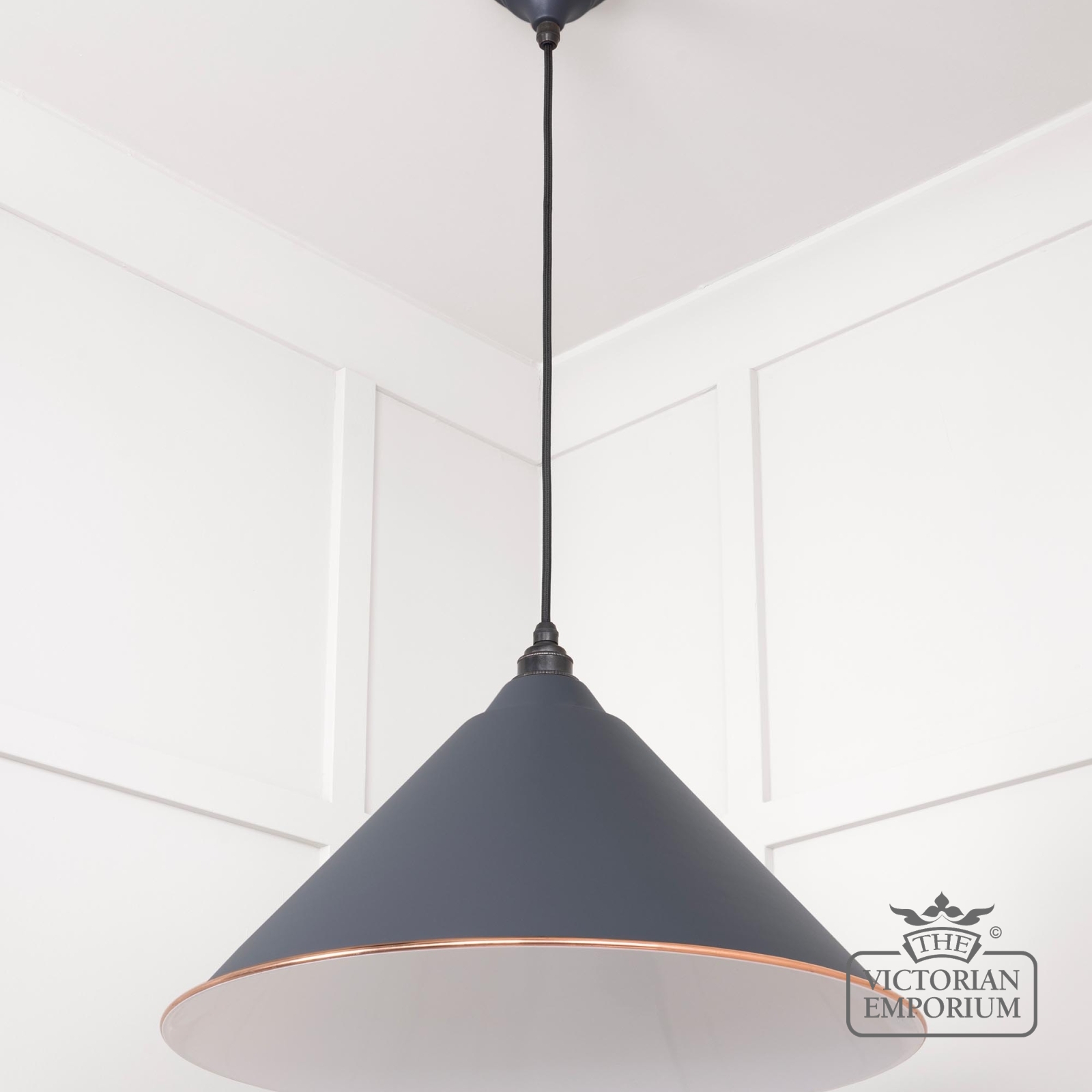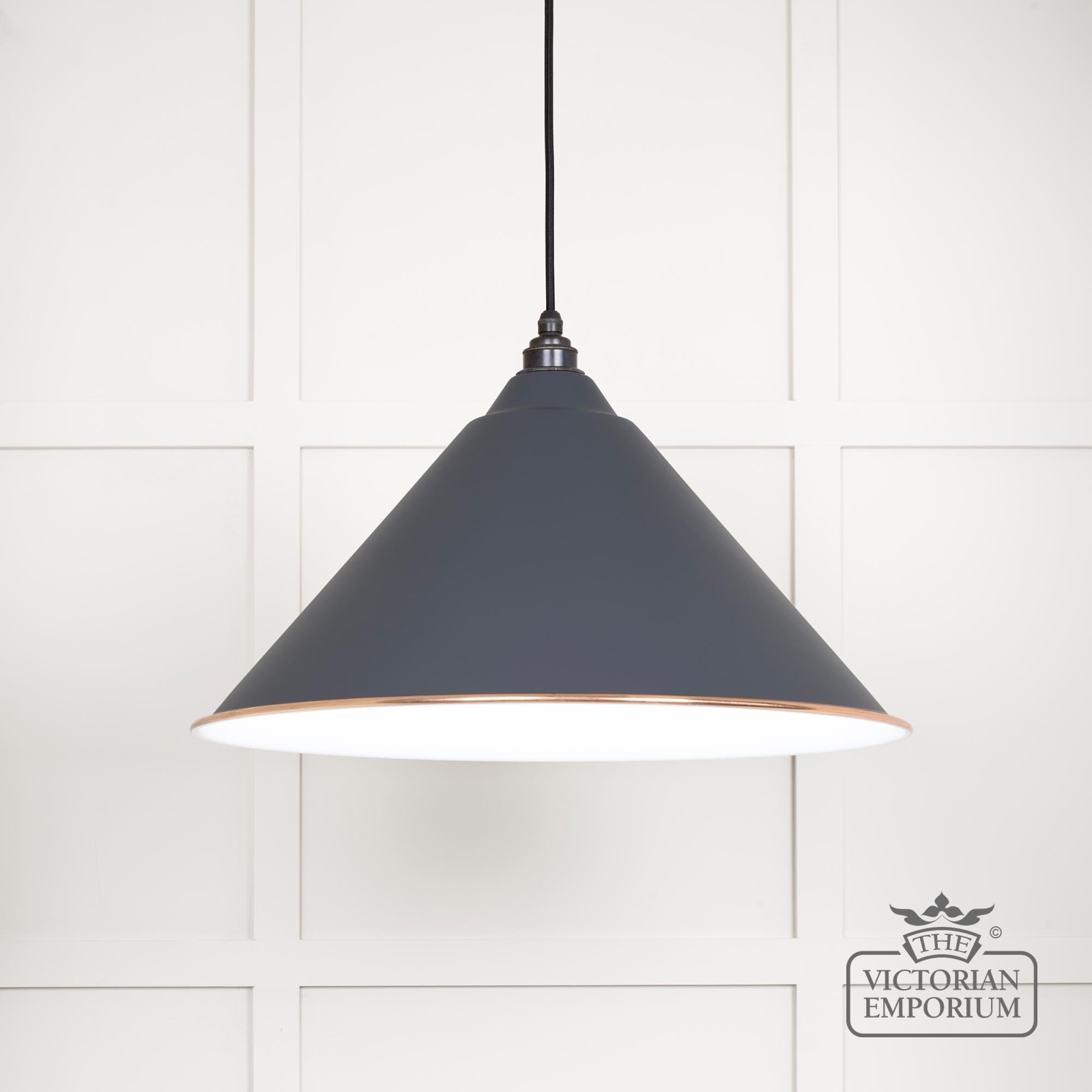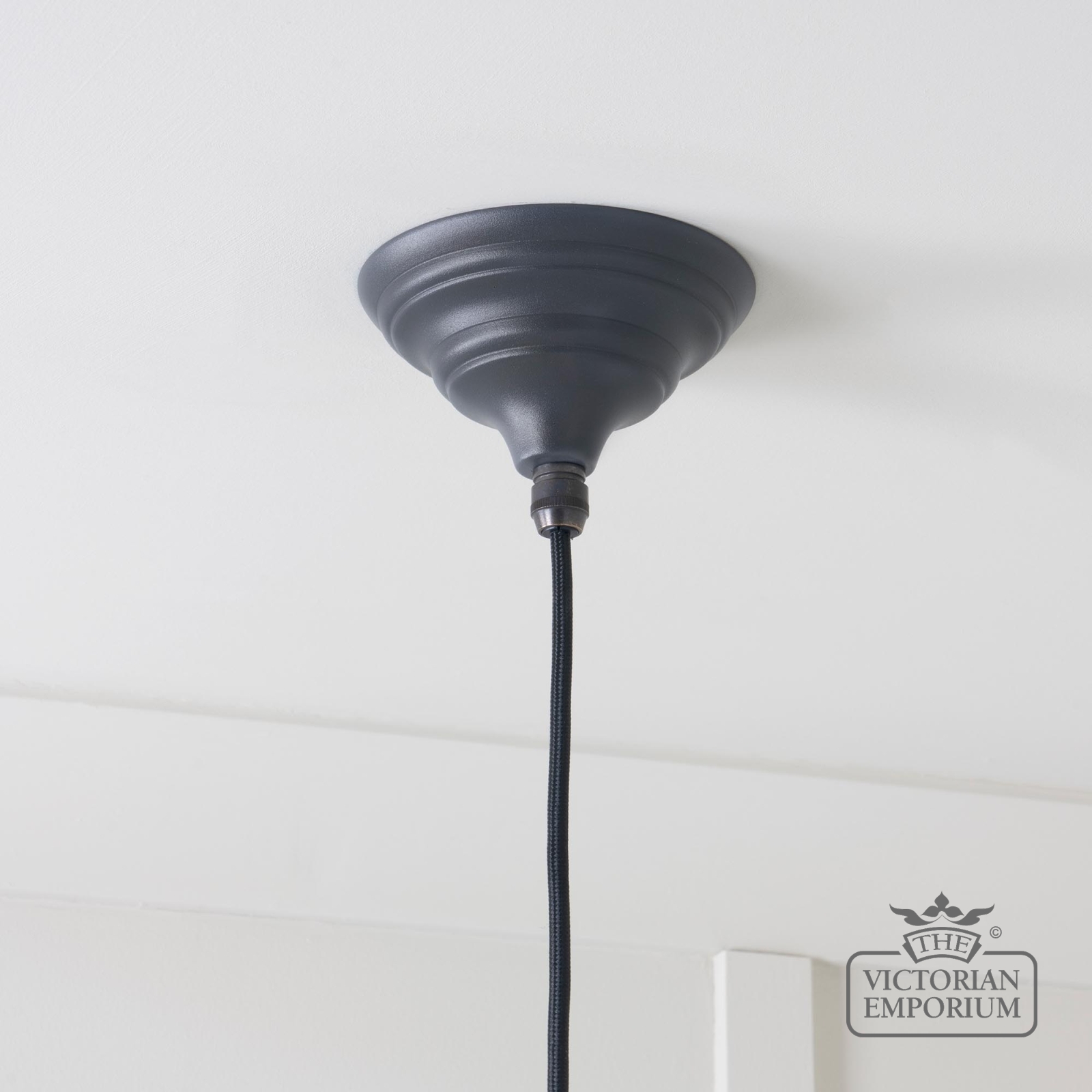 The Hockliffe’s conical shape creates a more modern feel in painted Slate exterior and white gloss interior. It can be hung as a centrepiece or grouped to create a statement