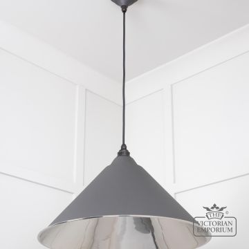 The Hockliffe’s conical shape creates a more modern feel in smooth nickel inside and Bluff outside. It can be hung as a centrepiece or grouped to create a statement