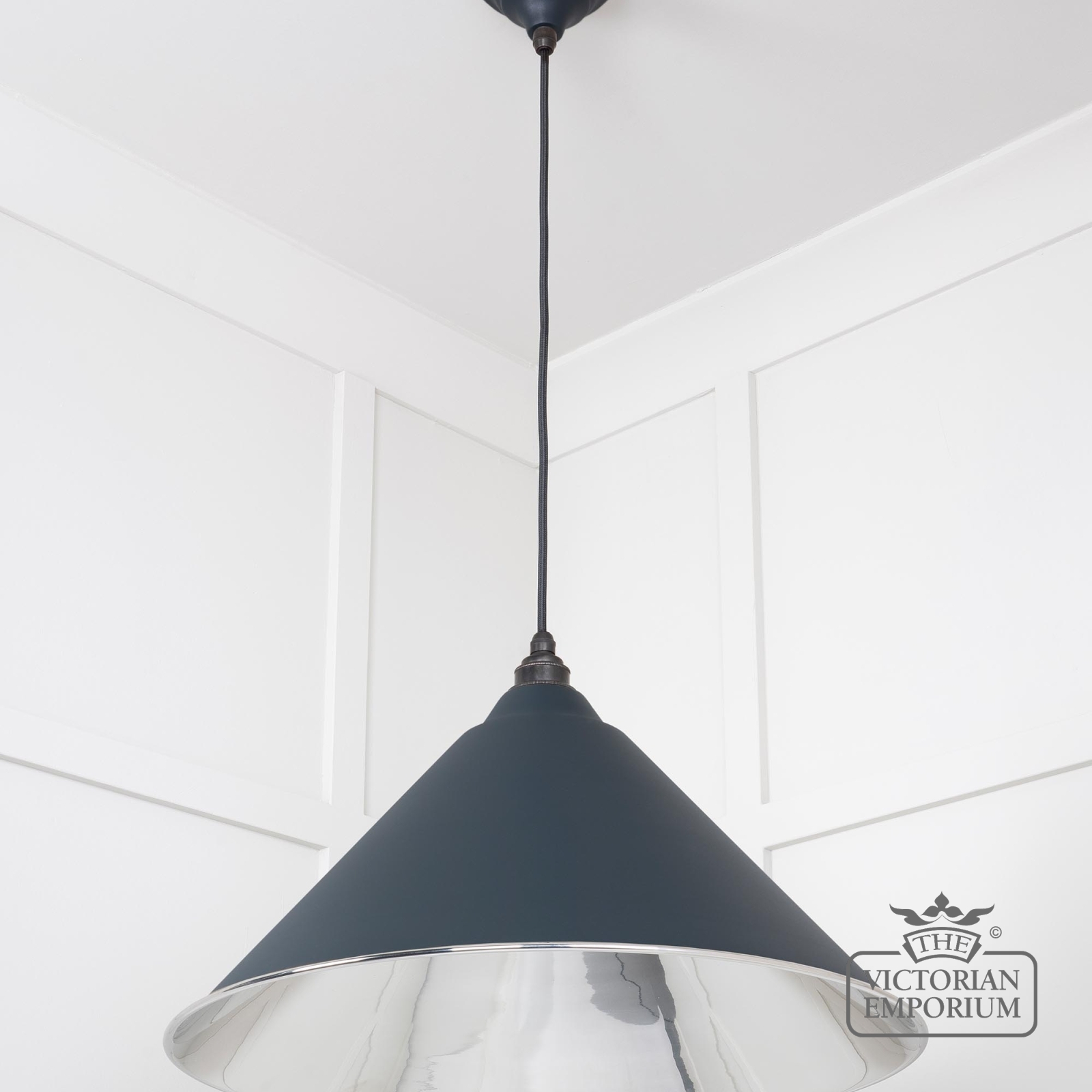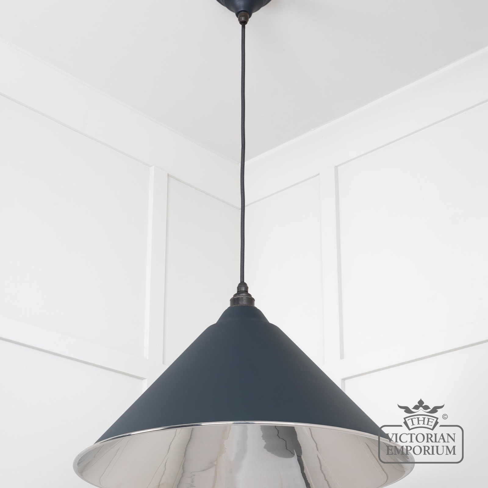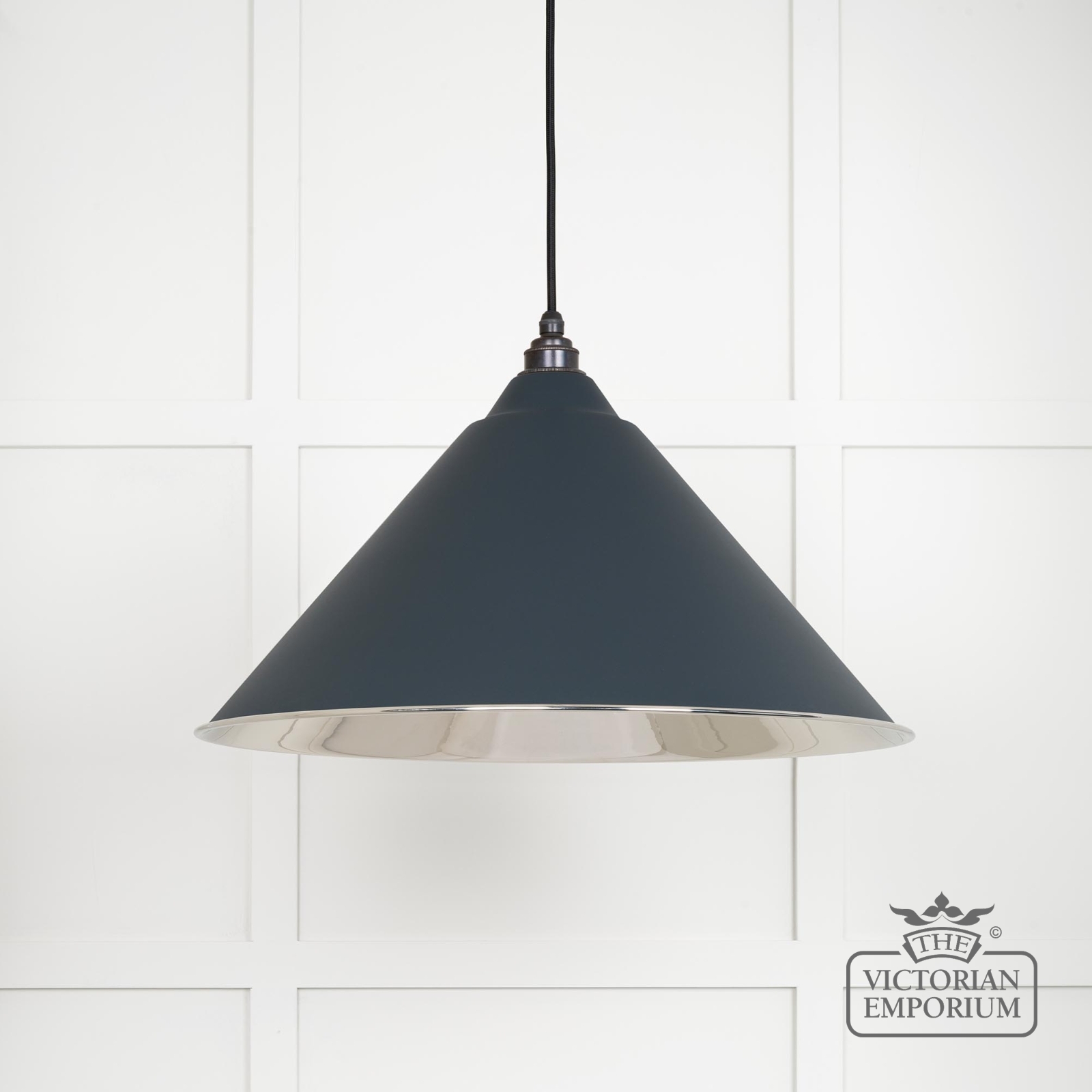 The Hockliffe’s conical shape creates a more modern feel in smooth nickel inside and Soot outside. It can be hung as a centrepiece or grouped to create a statement