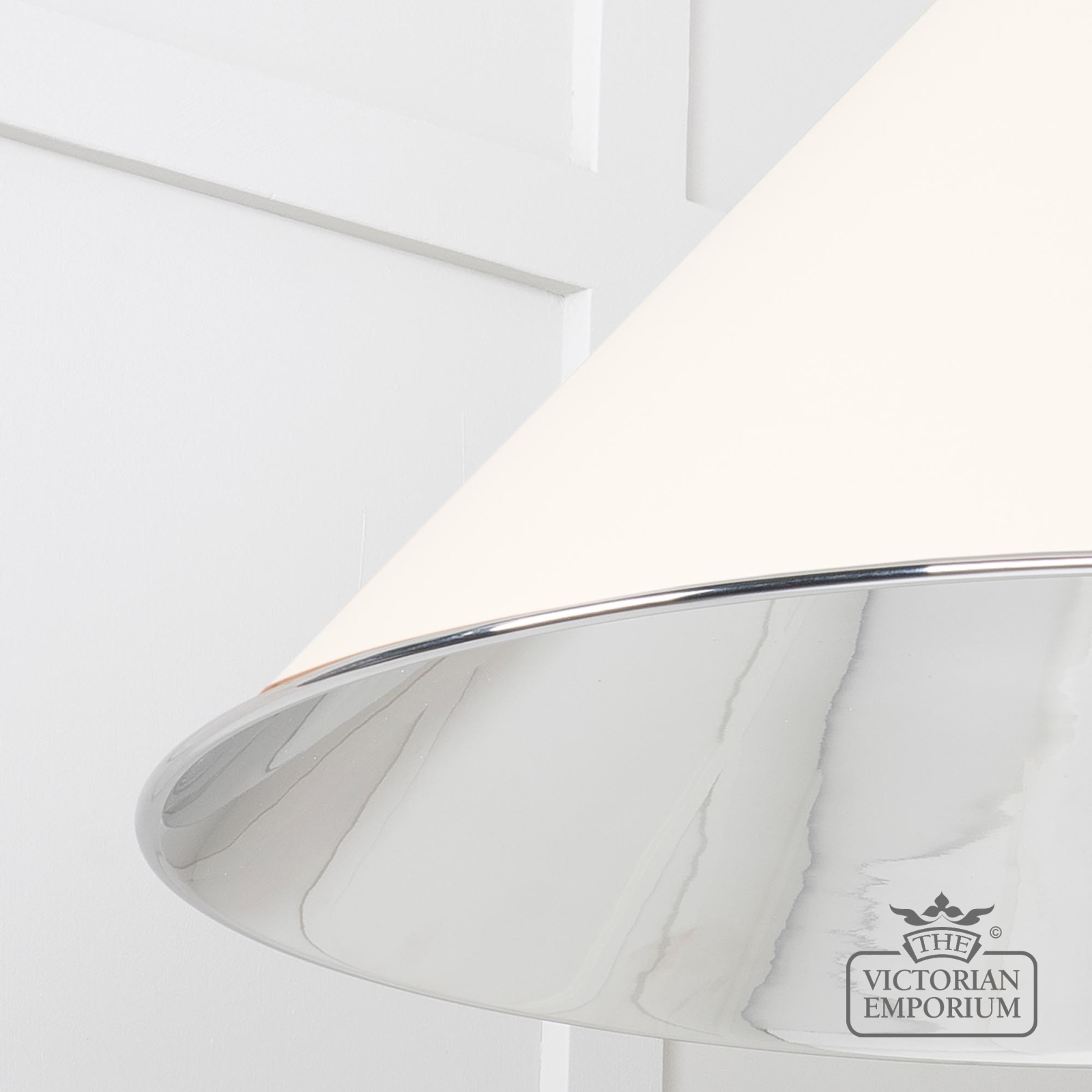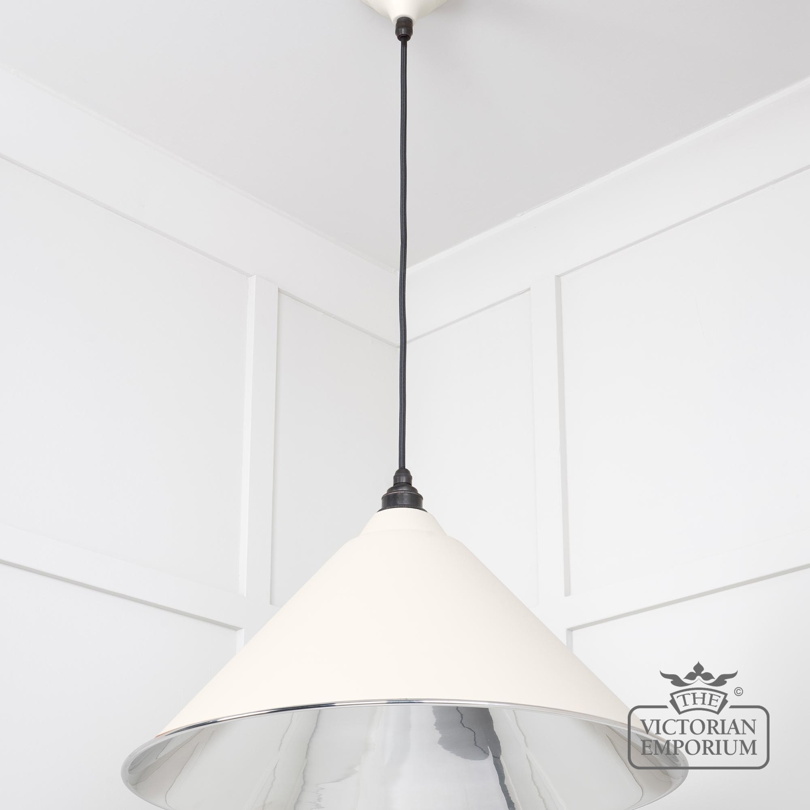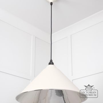 The Hockliffe’s conical shape creates a more modern feel in smooth nickel inside and Teasel outside. It can be hung as a centrepiece or grouped to create a statement