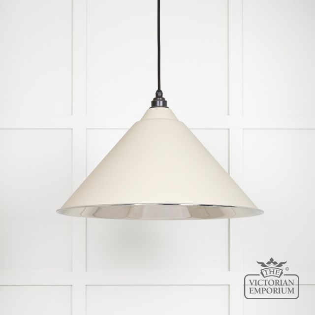 The Hockliffe’s conical shape creates a more modern feel in smooth nickel inside and Teasel outside. It can be hung as a centrepiece or grouped to create a statement