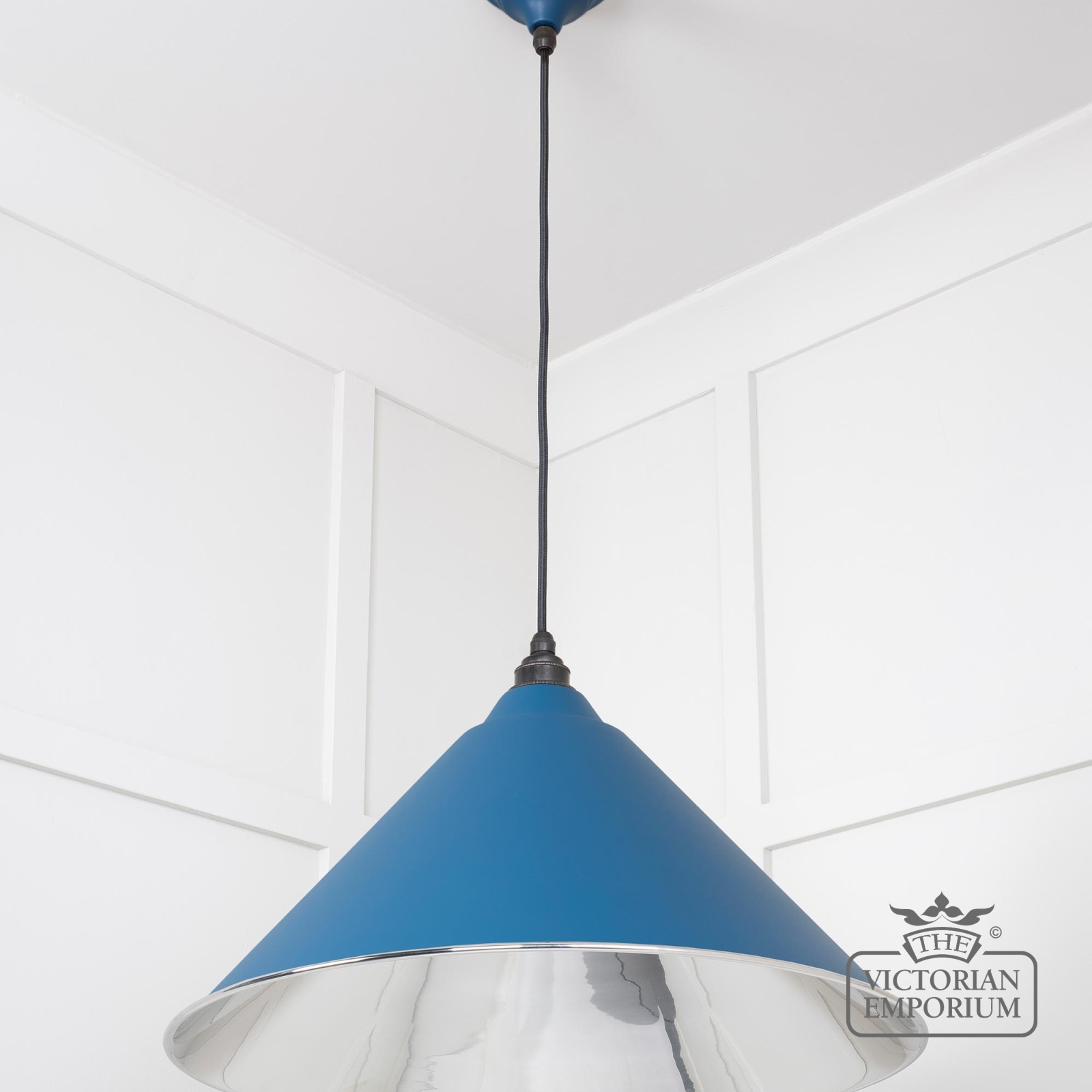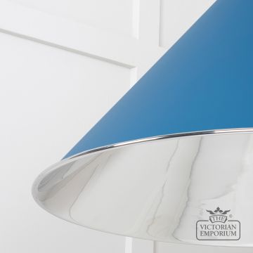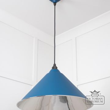The Hockliffe’s conical shape creates a more modern feel in smooth nickel inside and Upstream outside. It can be hung as a centrepiece or grouped to create a statement
