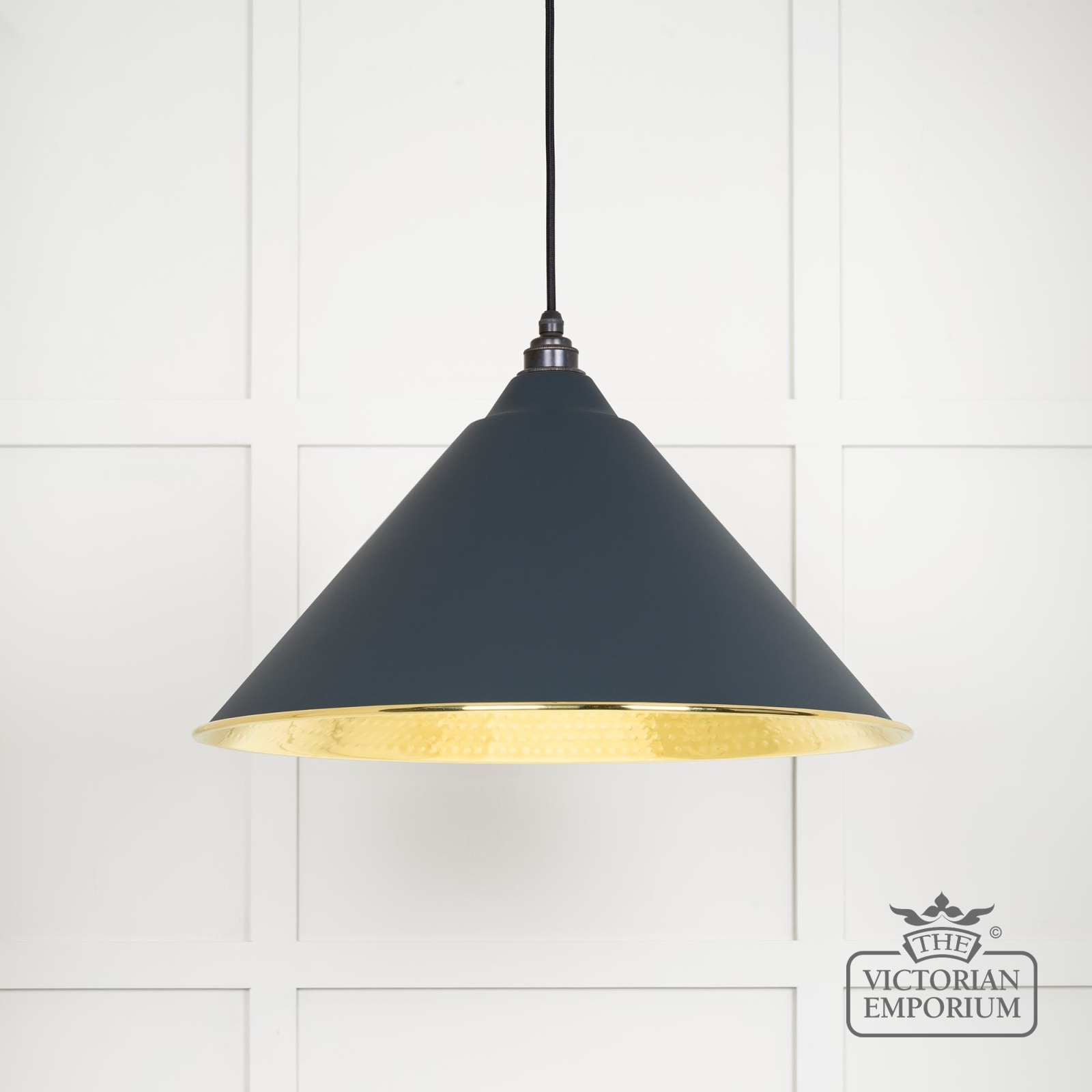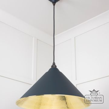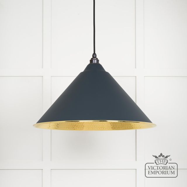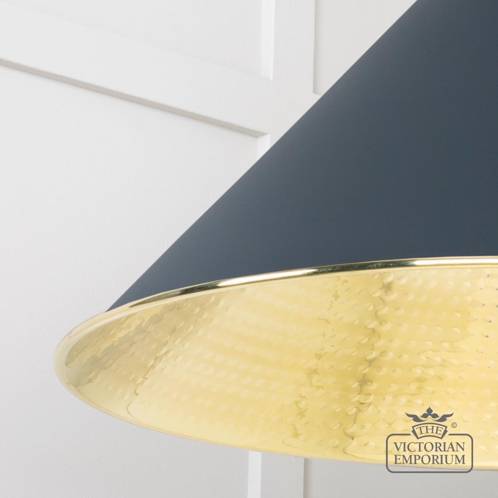 The Hockliffe’s large conical shape creates a more modern feel in traditional brass with a Soot exterior. It can be hung as a centrepiece or grouped to create a statement