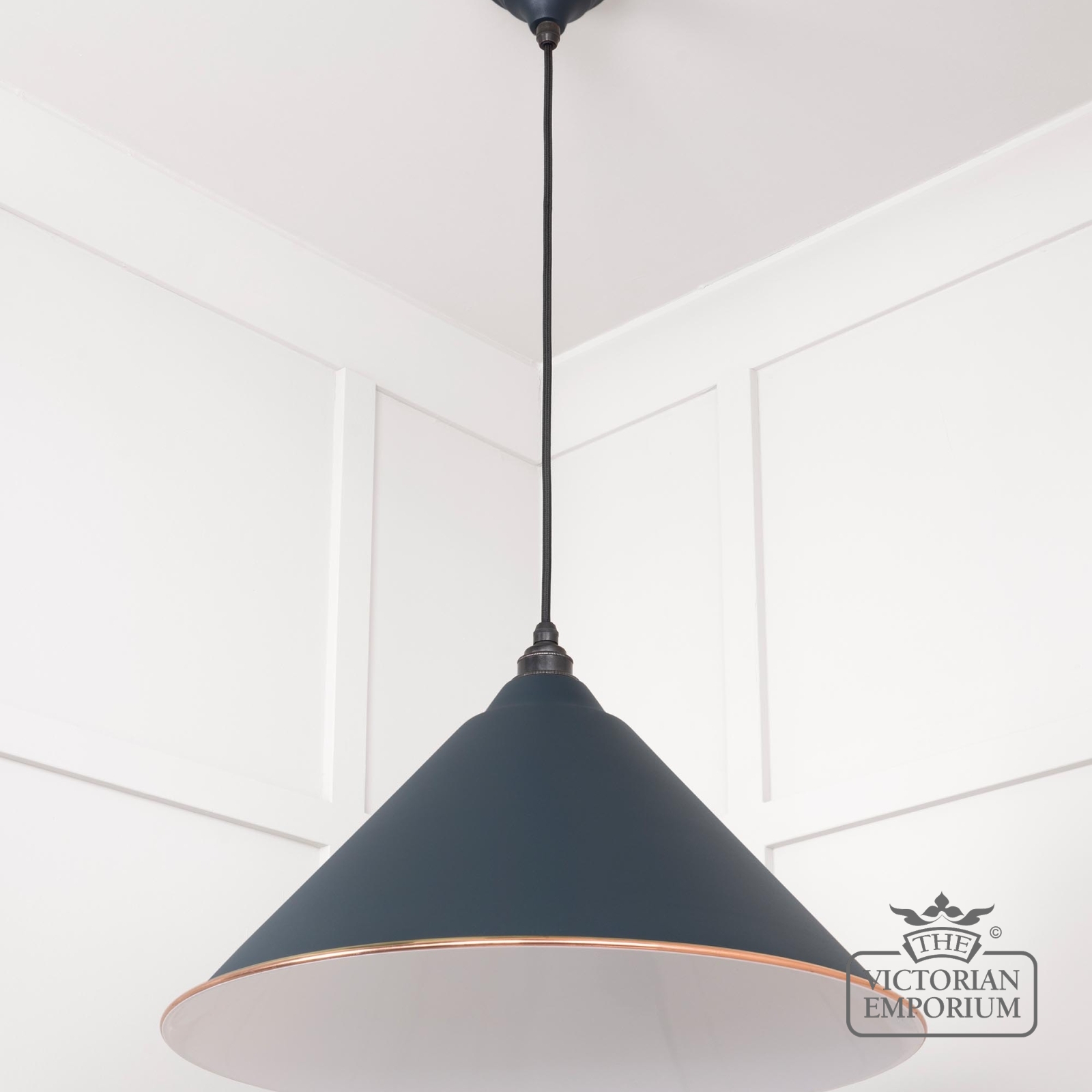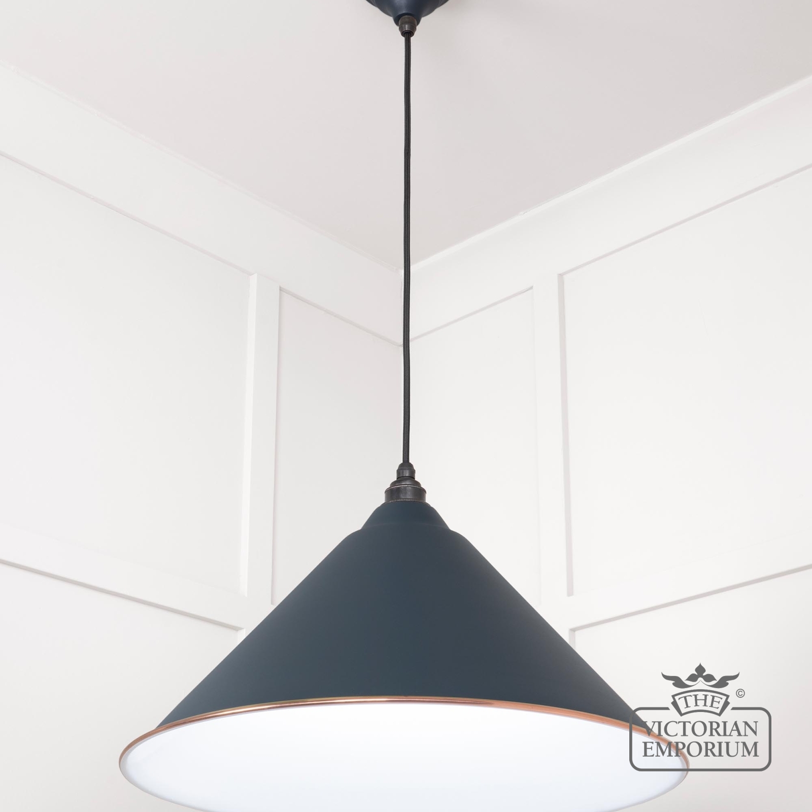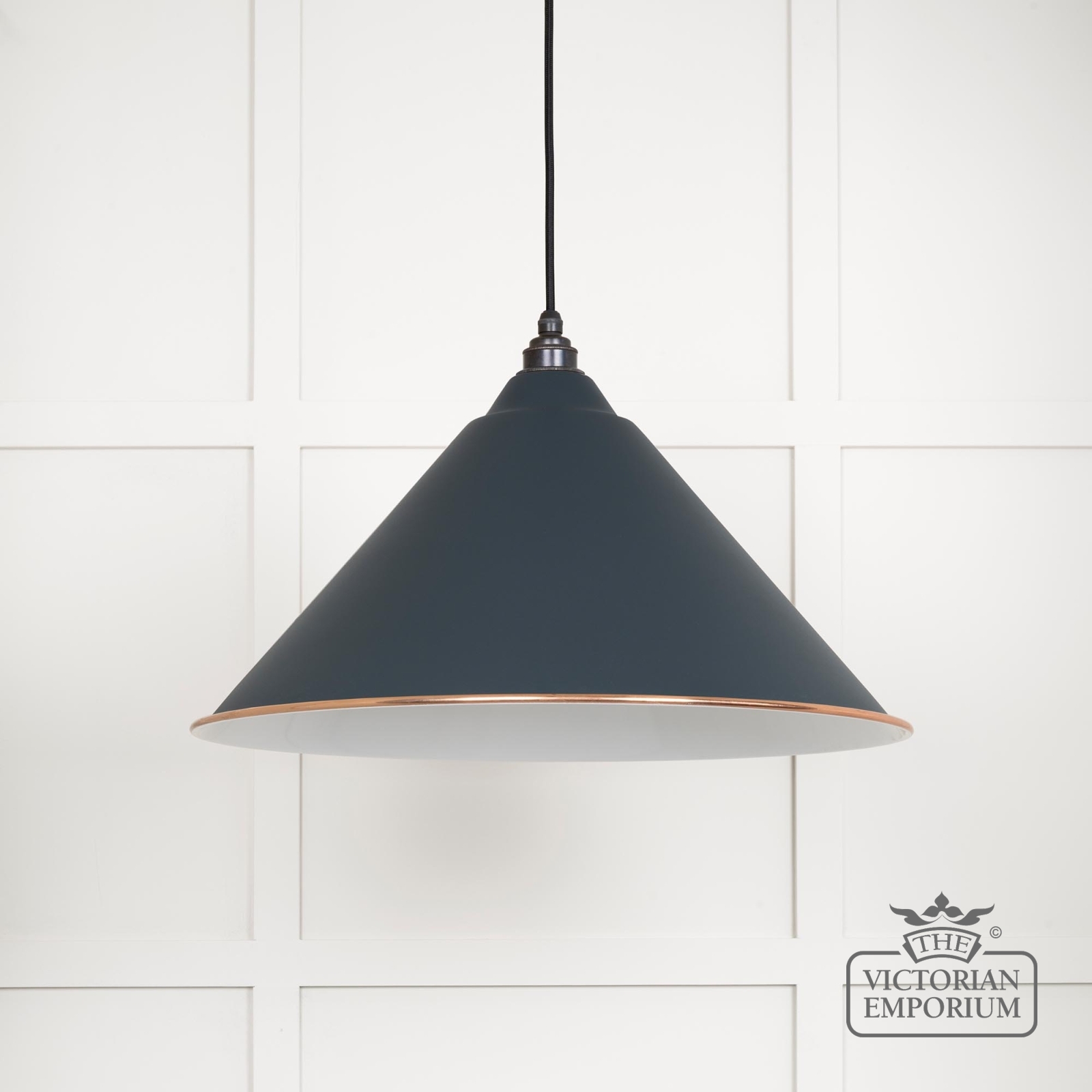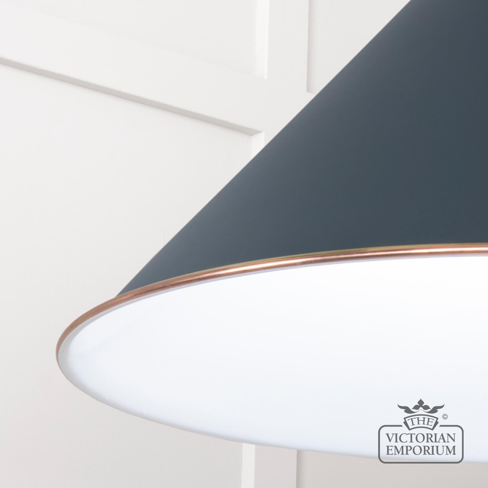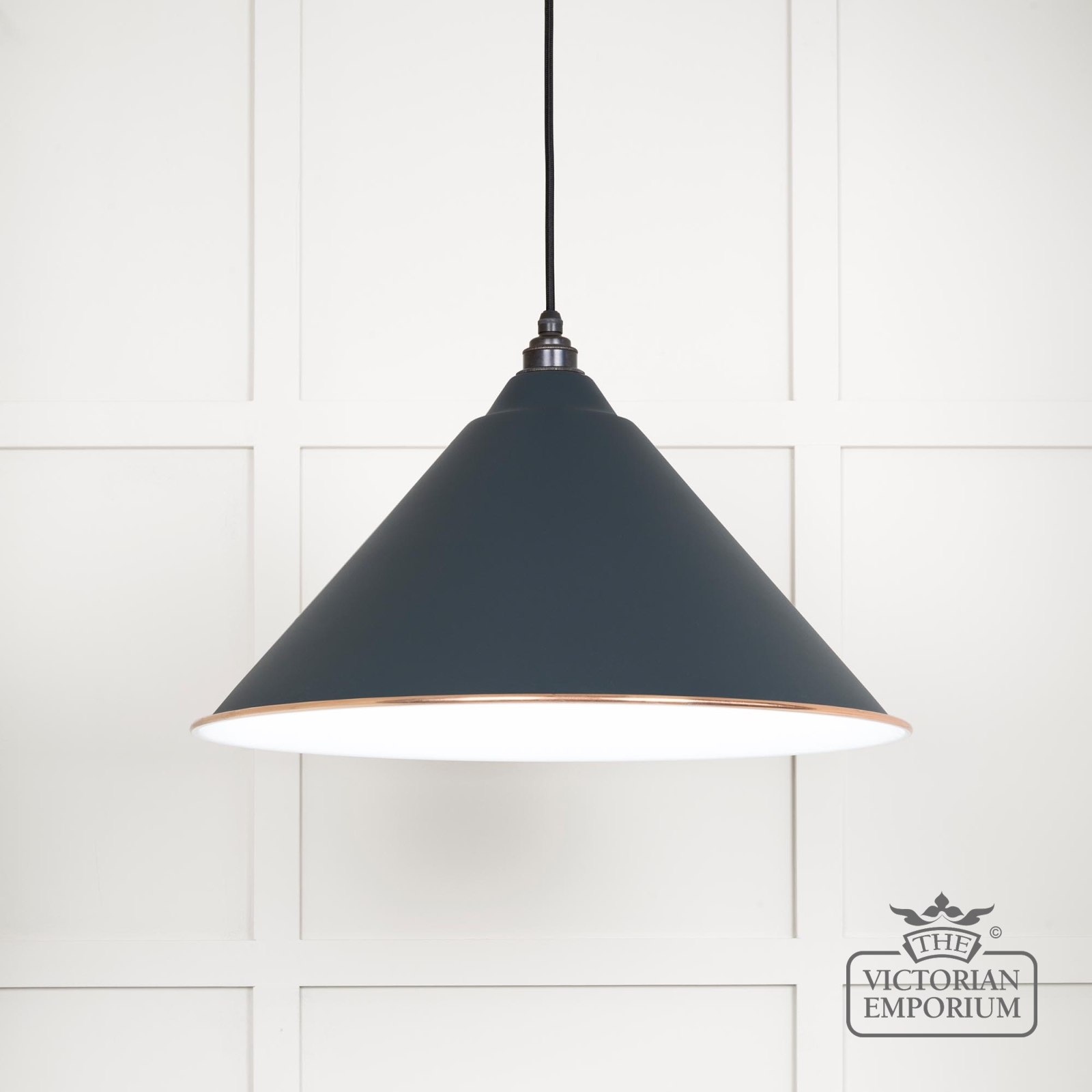 The Hockliffe’s conical shape creates a more modern feel in painted Soot exterior and white gloss interior. It can be hung as a centrepiece or grouped to create a statement