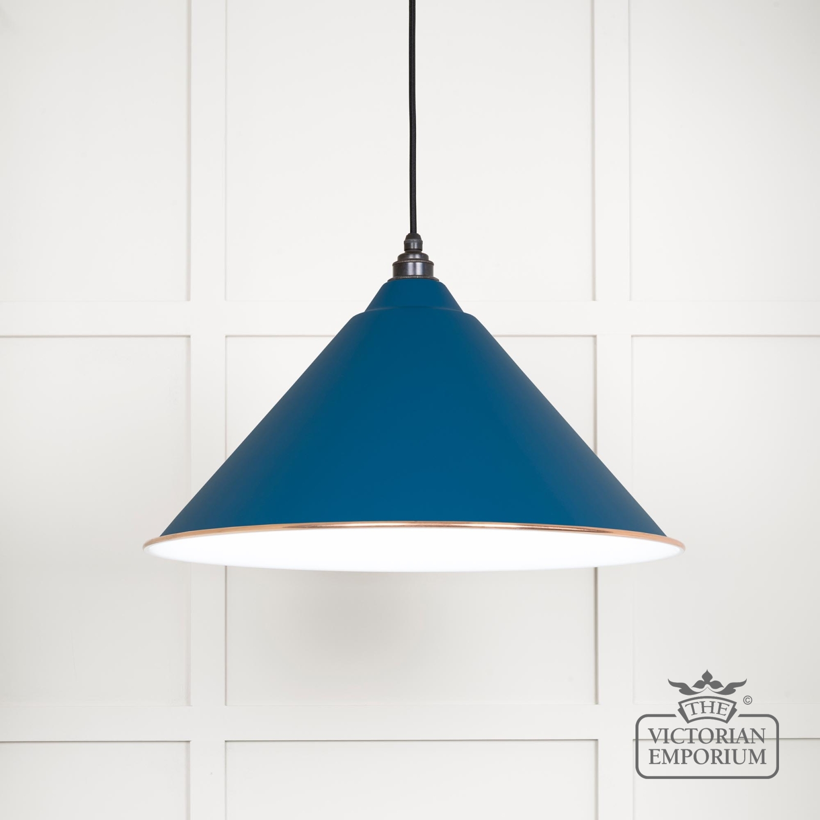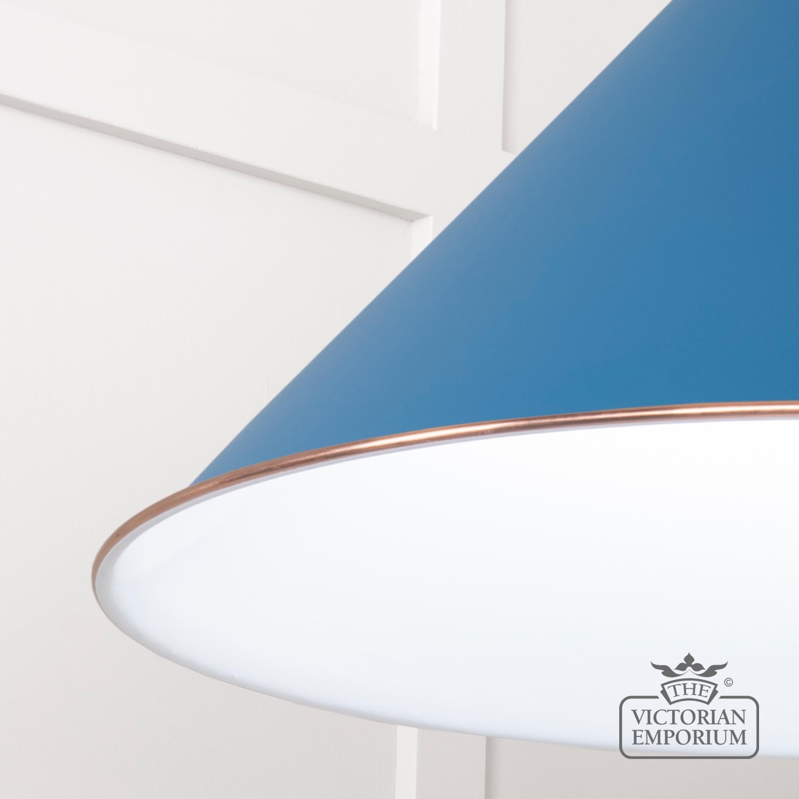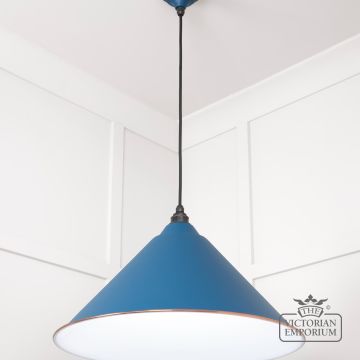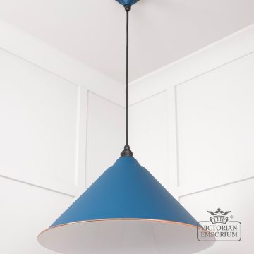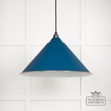 The Hockliffe’s conical shape creates a more modern feel in painted Upstream exterior and white gloss interior. It can be hung as a centrepiece or grouped to create a statement
