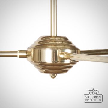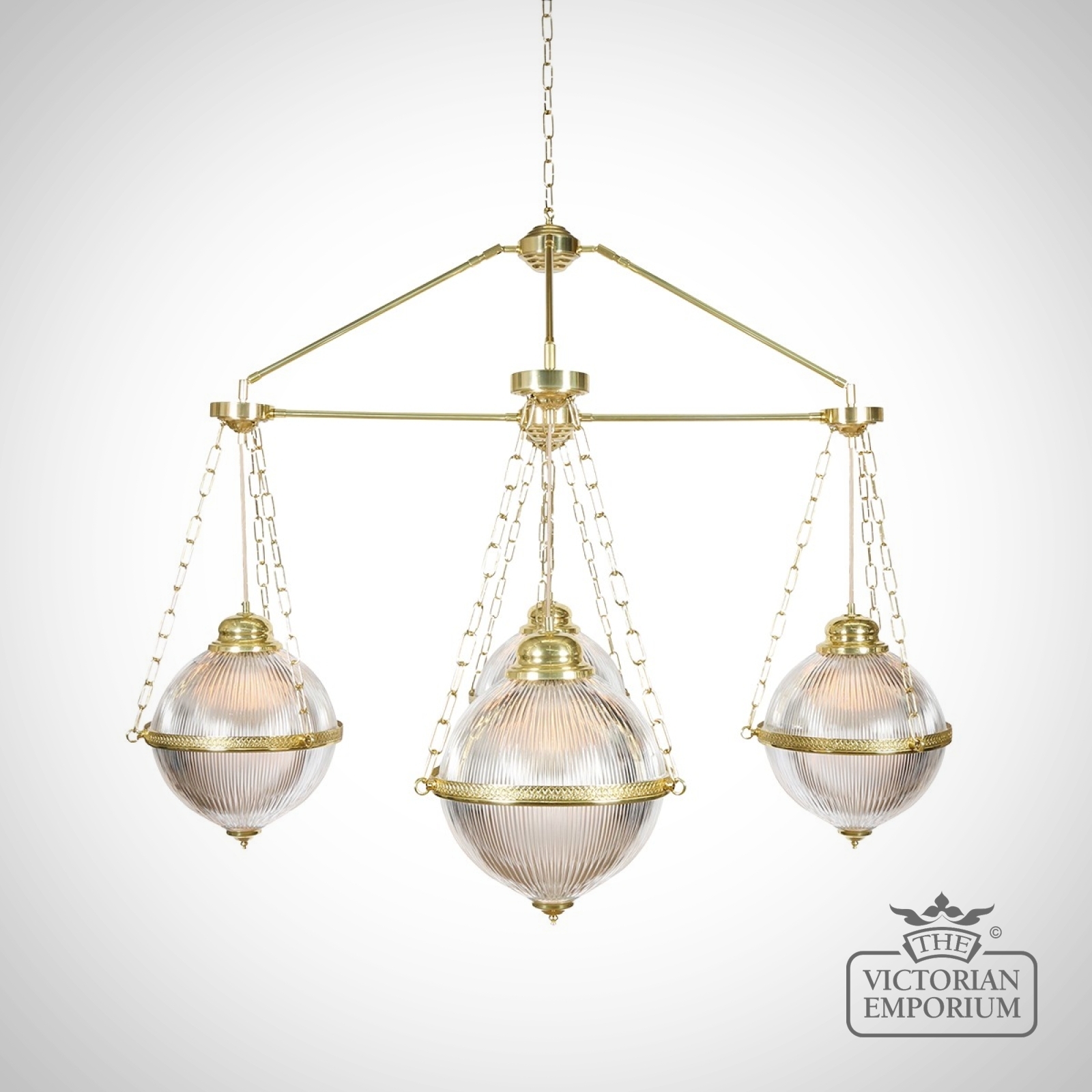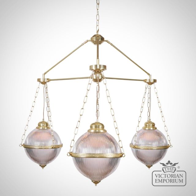 The three-arm chandelier features three Victorian pendants suspended from a single brass fixture.