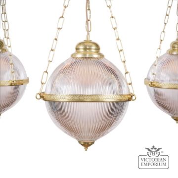 Each pendant features a Holophane spherical glass lamp shade that refracts and disperses light beautifully. Inside each glass enclosure is a single E27 lamp holder.