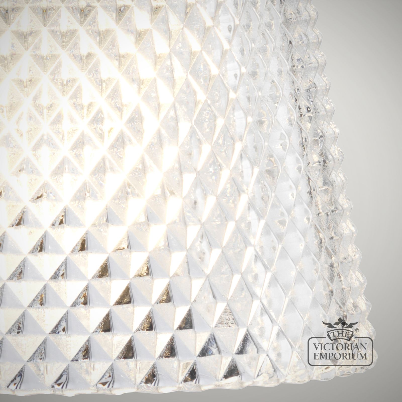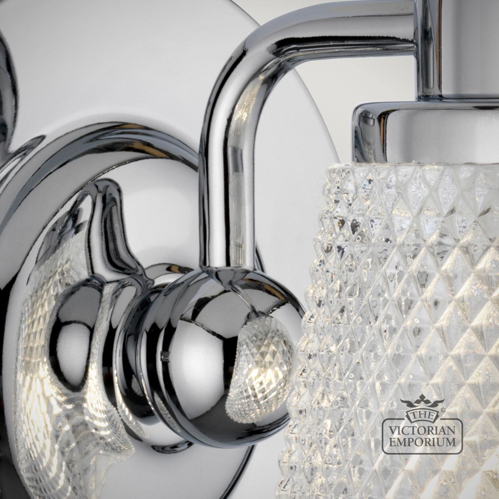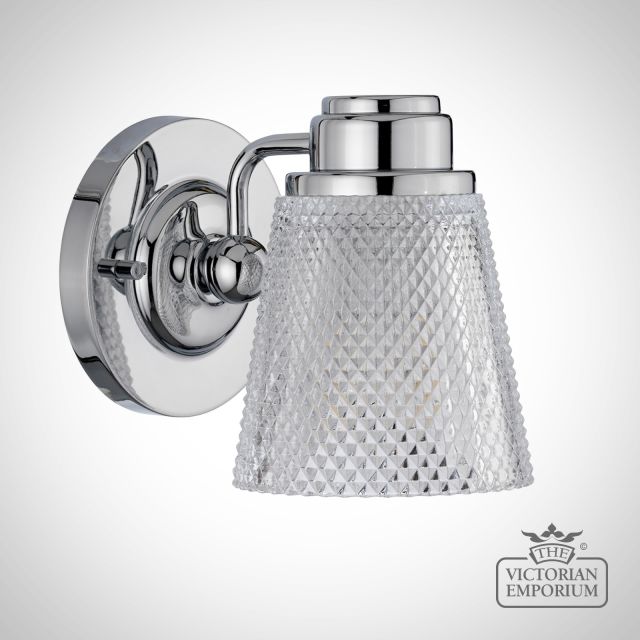 Single Bathroom Wall Light featuring clean lines and refined details in chrome and Clear Cut Glass inspired by classic bathroom lighting design. This light can be used facing up or downwards.