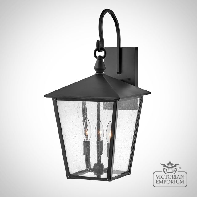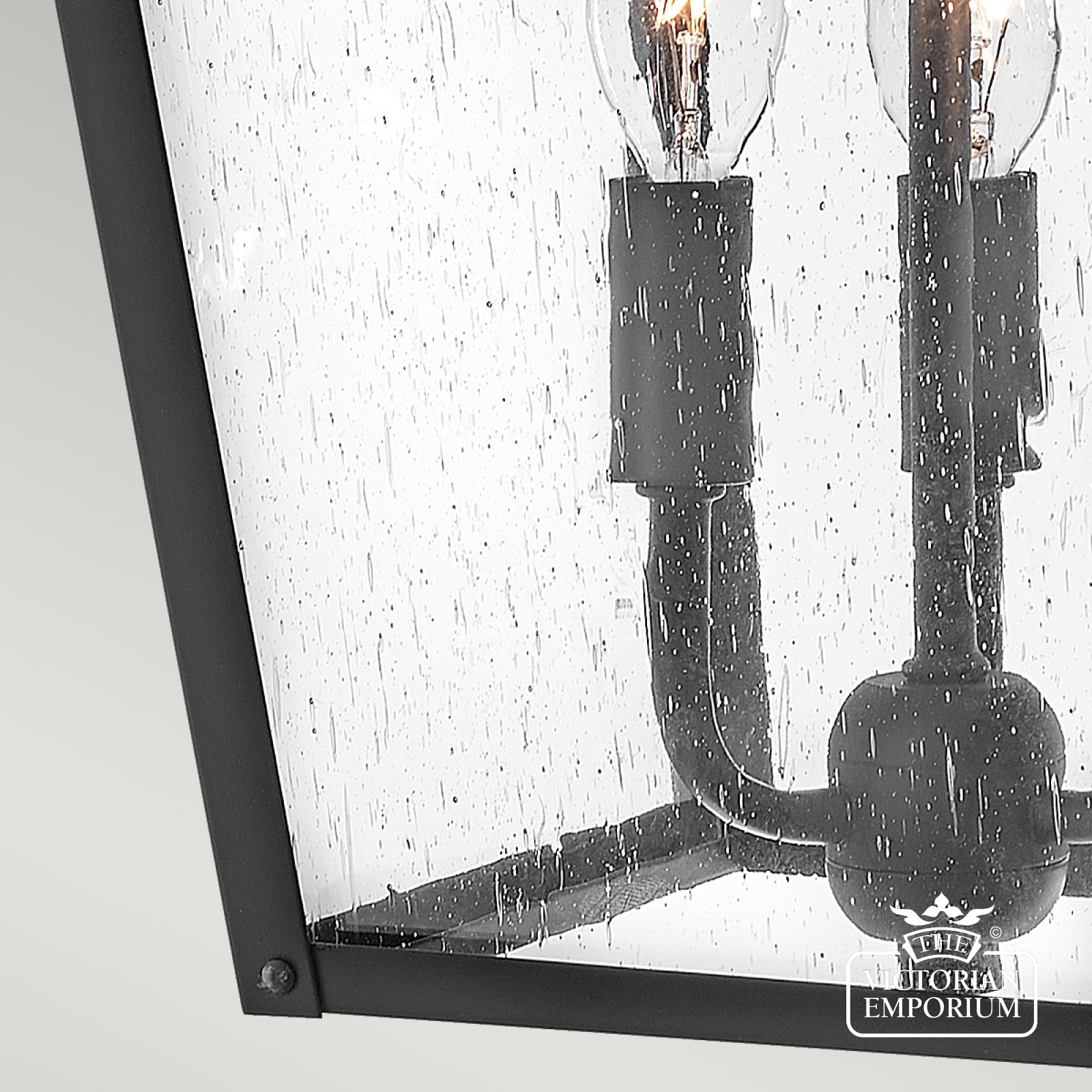 The Huntersfield 3 Light Large Wall Lantern has clean lines and elegant seeded glass. Built from Aluminium, Brass and finished in black. IP44 rated.