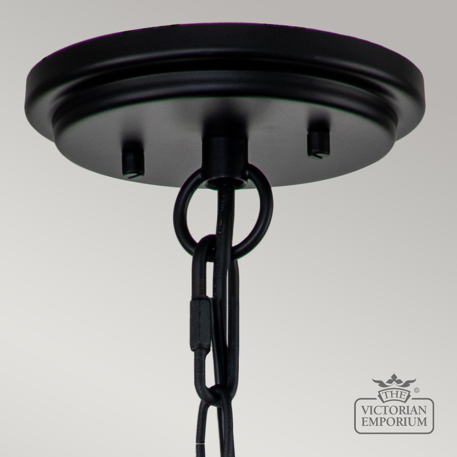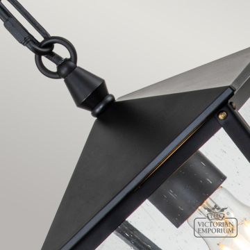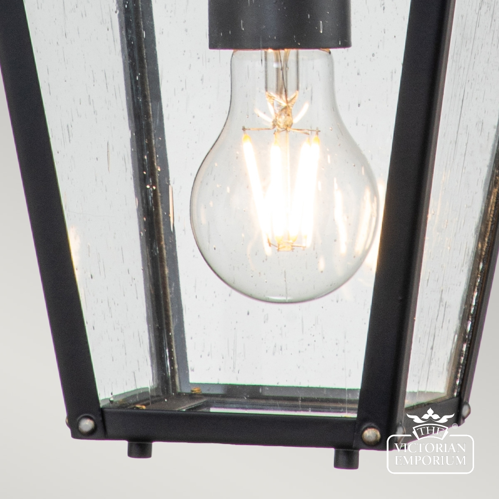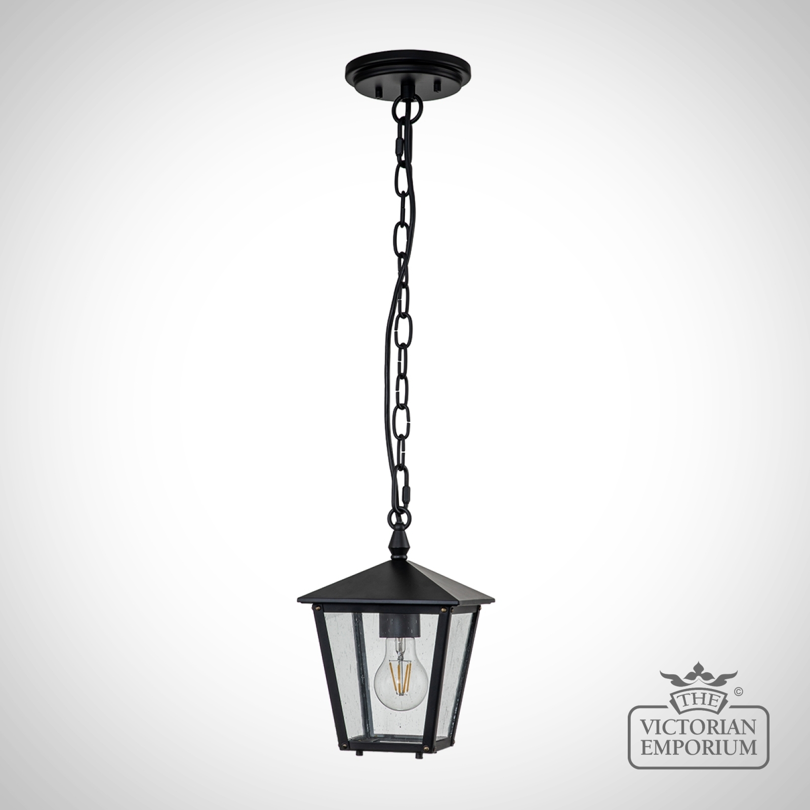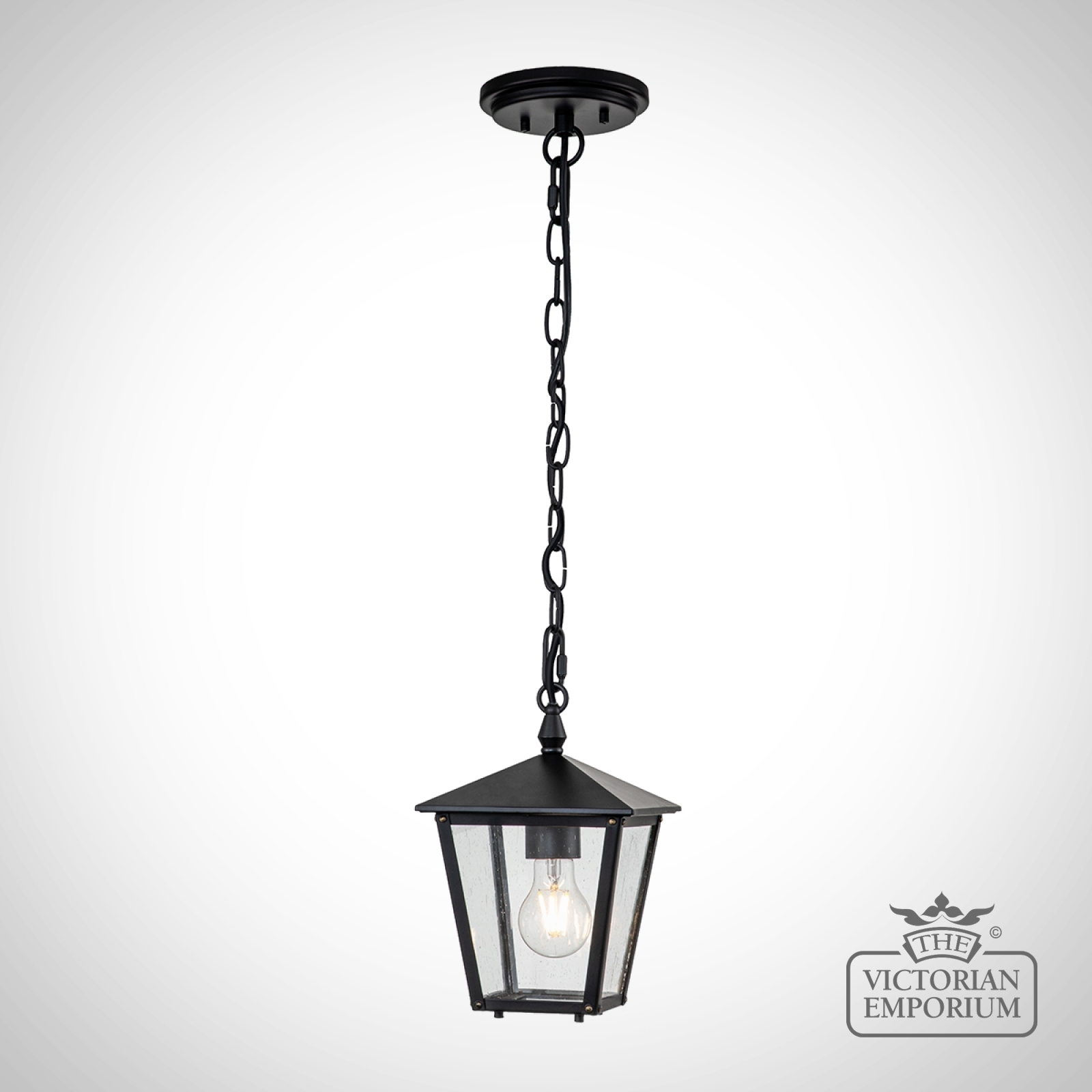 The Huntersfield Small Chain Lantern has clean lines and elegant seeded glass. Built from Aluminium, Brass and finished in black. IP44 rated.
