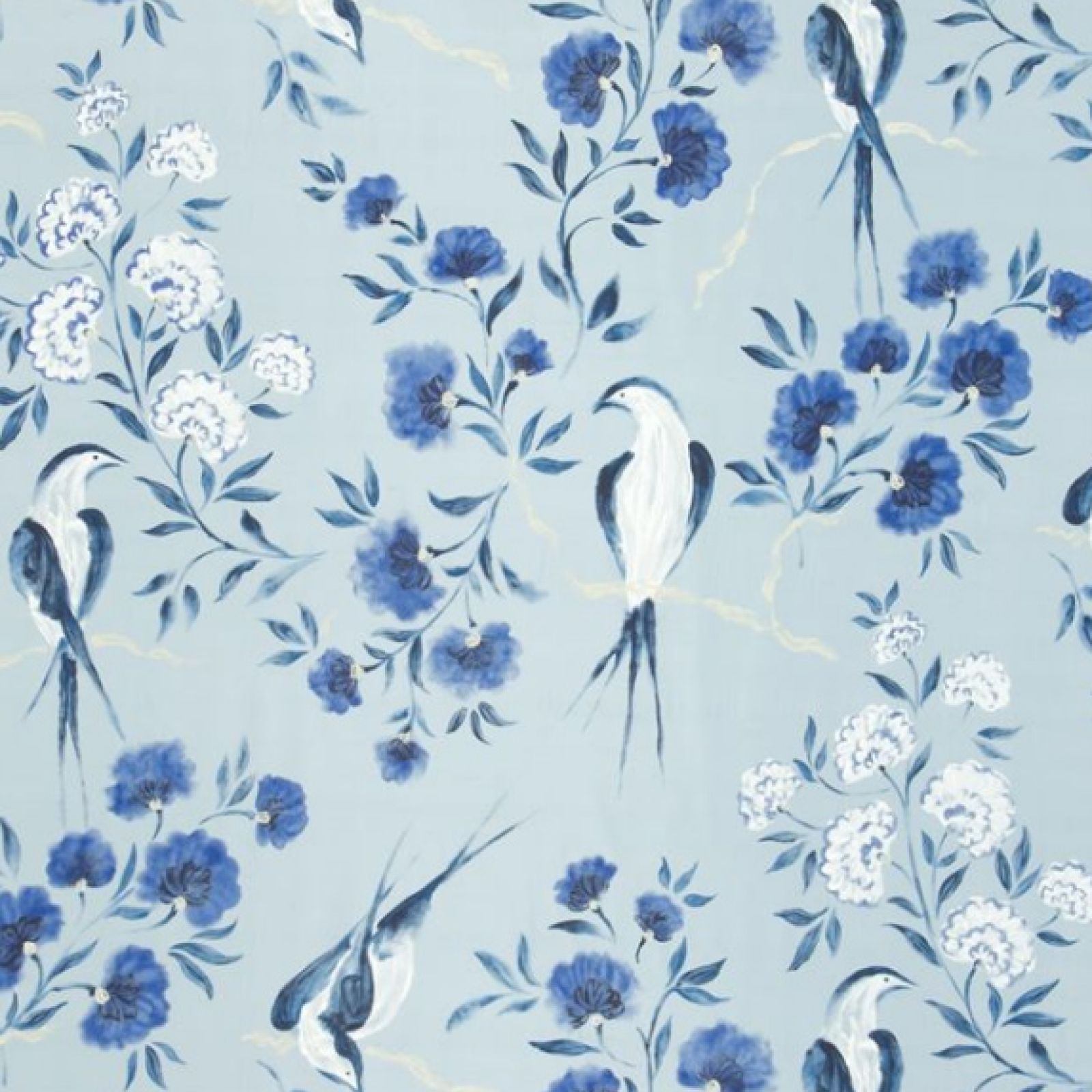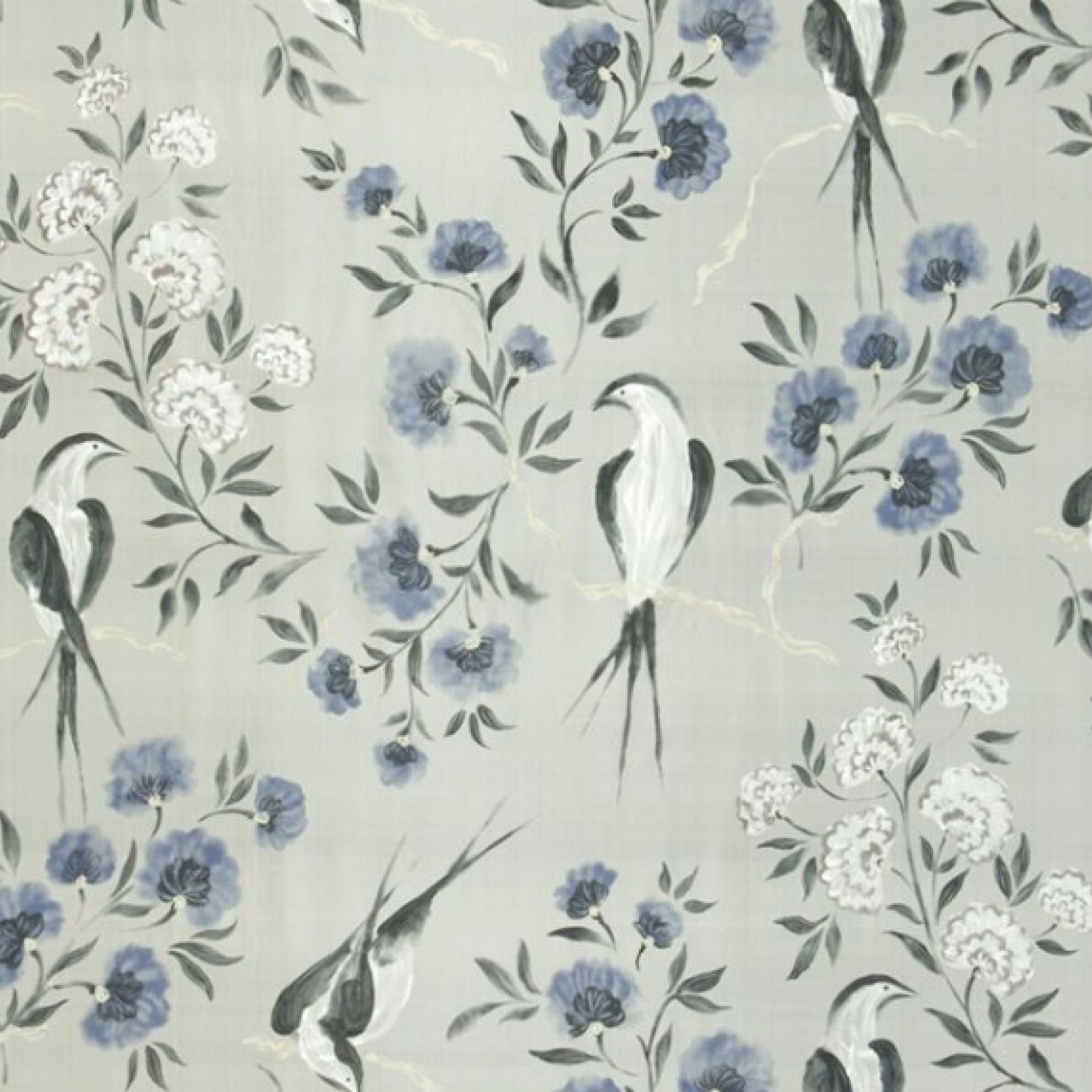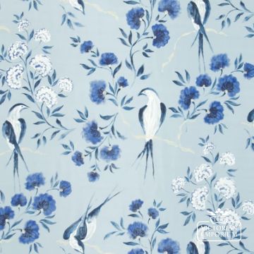 Elegant birds perch on delightfully painted branches of oriental blossom to create this vibrant printed silk fabric