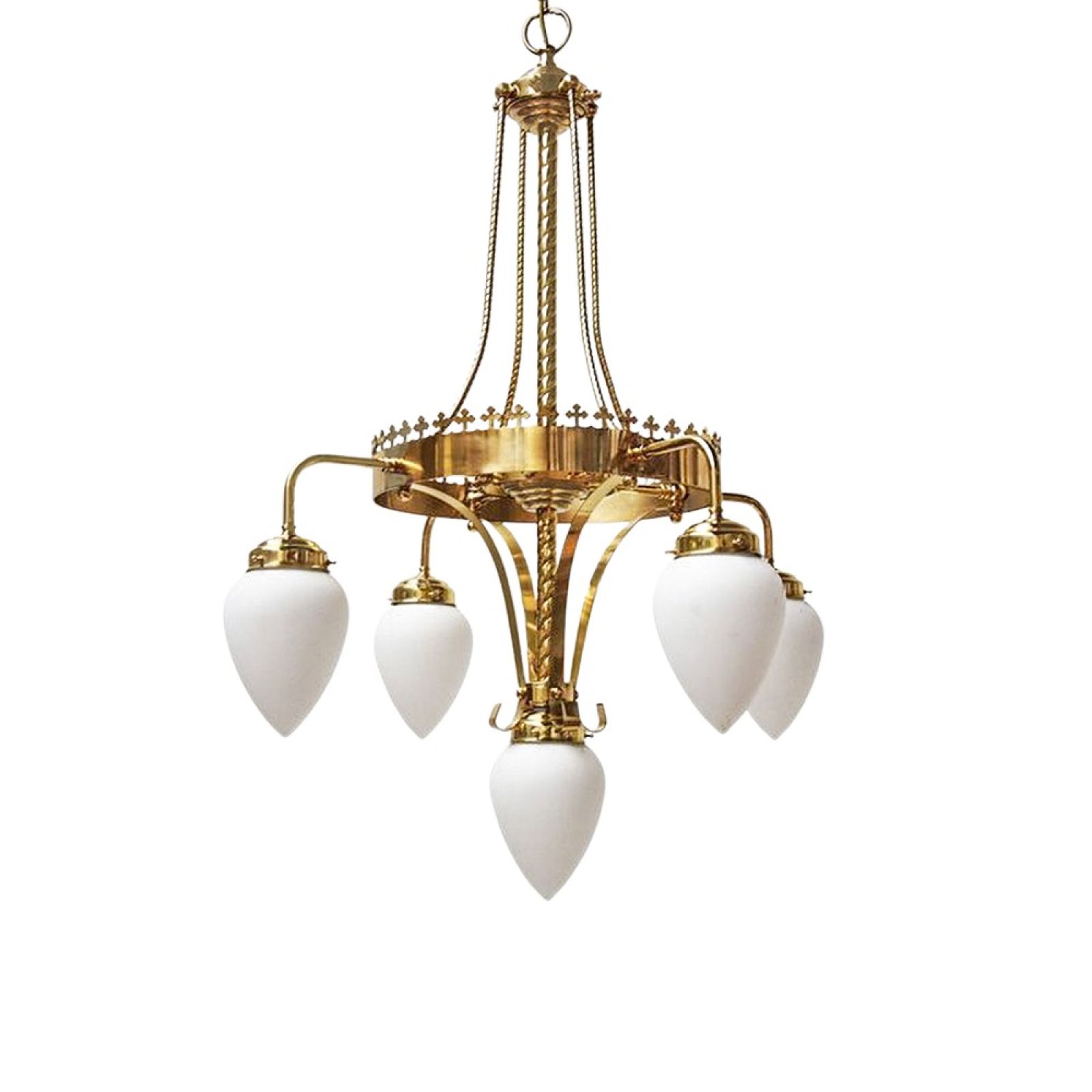 Solid brass chandelier featuring four arms and five lights with opal pineapple glass lamp shades.