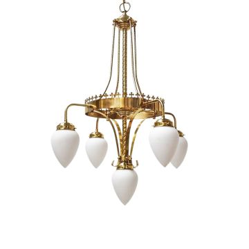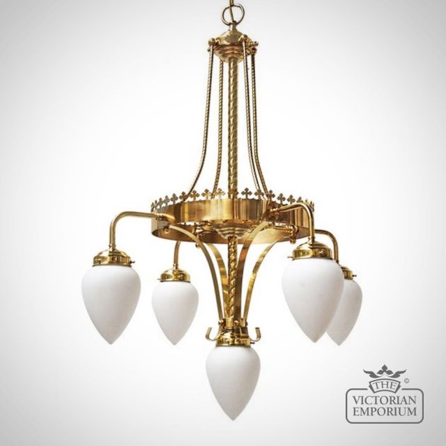 This solid brass chandelier is suspended using five brass rods moulded like ropes. Each brass rope is attached to a circular frame with crosses carefully shaped into its top surface.