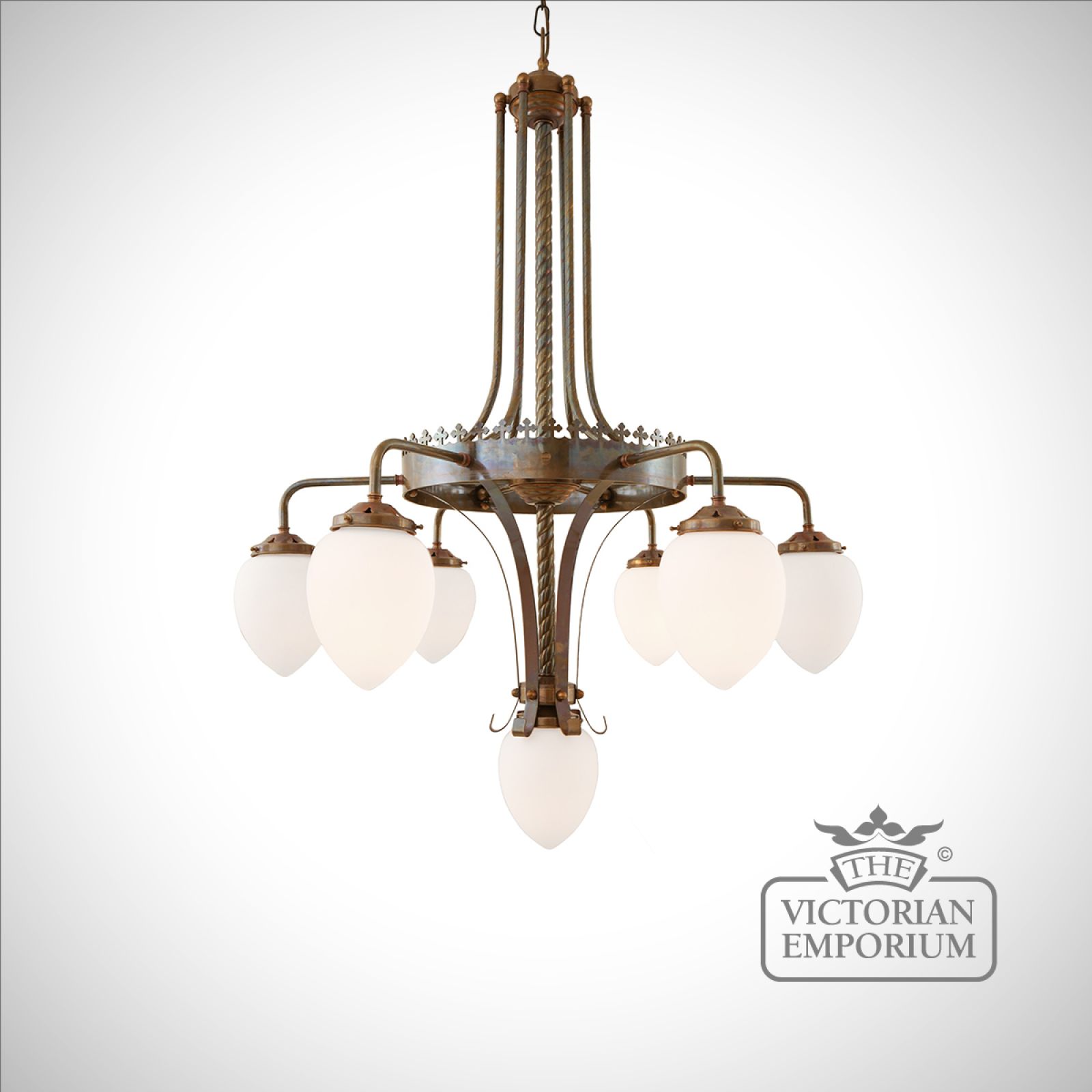 The Killarney chandelier is an ornate, traditional chandelier ideally suited to buildings with high ceilings such as churches and grand hotels. This solid brass chandelier features six arms and seven lights with opal pineapple glass lamp shades.