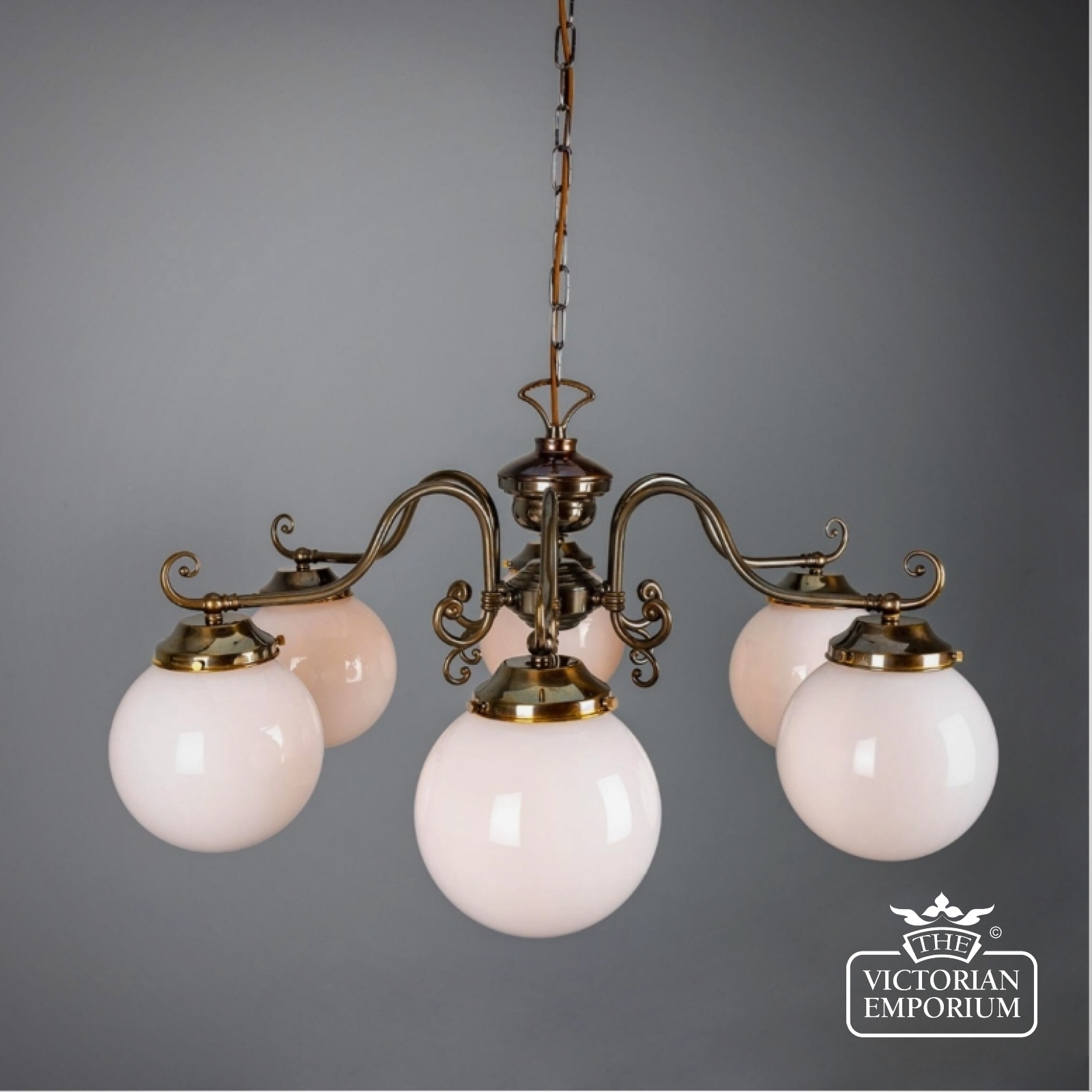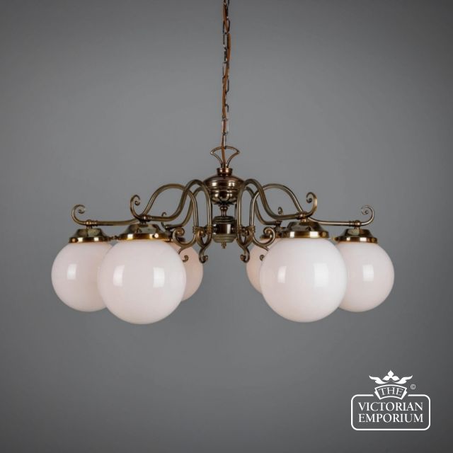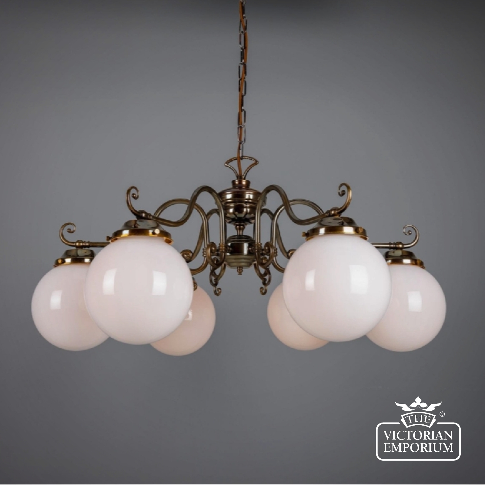 The Kilturk chandelier features a traditional ornate brass frame with six curved brass arms with opal glass globe shades. This traditional chandelier has an impressive size.