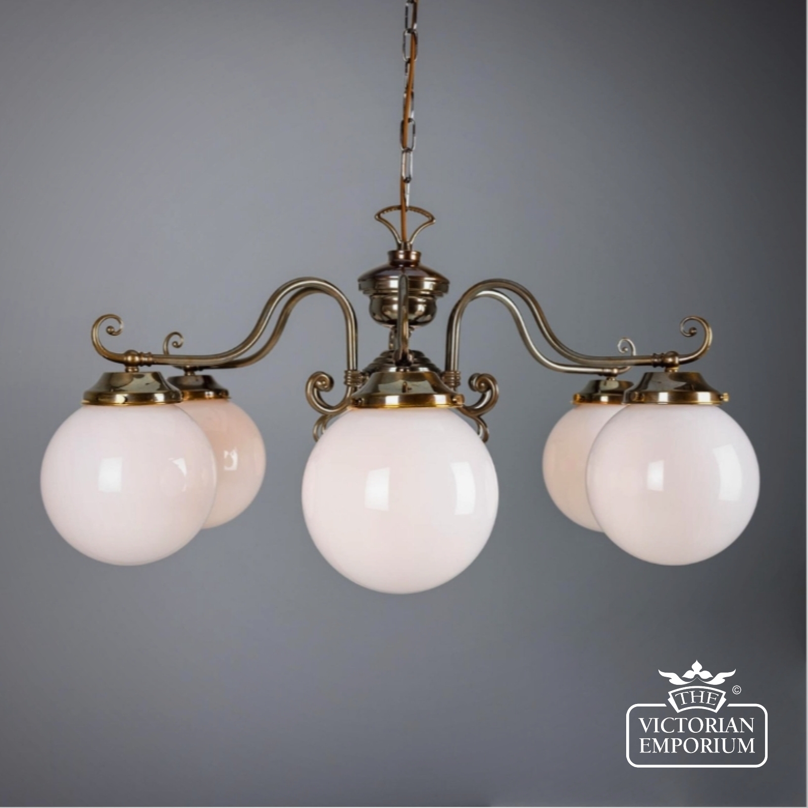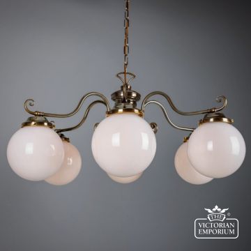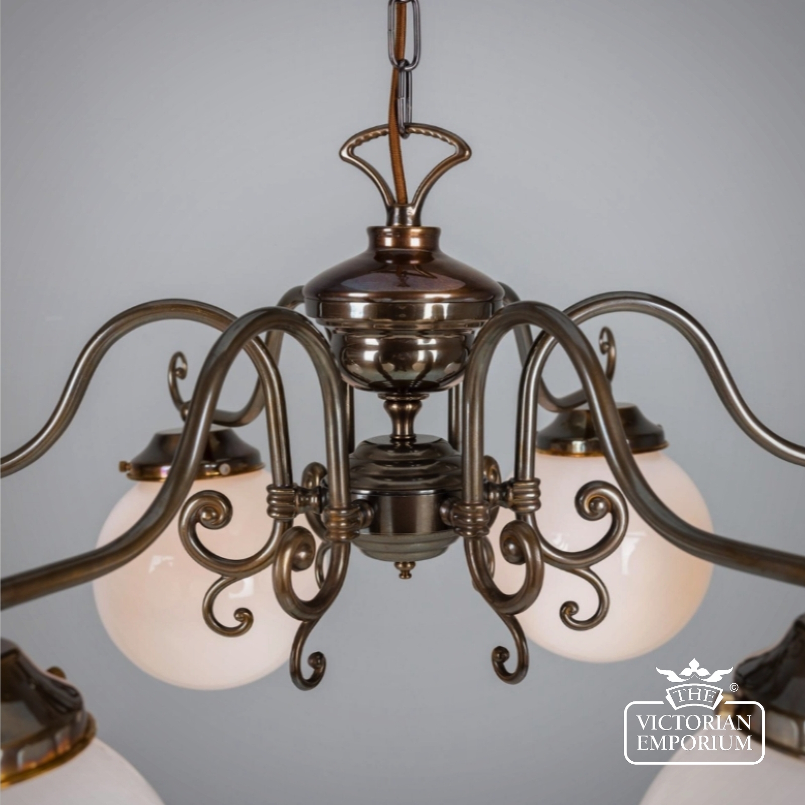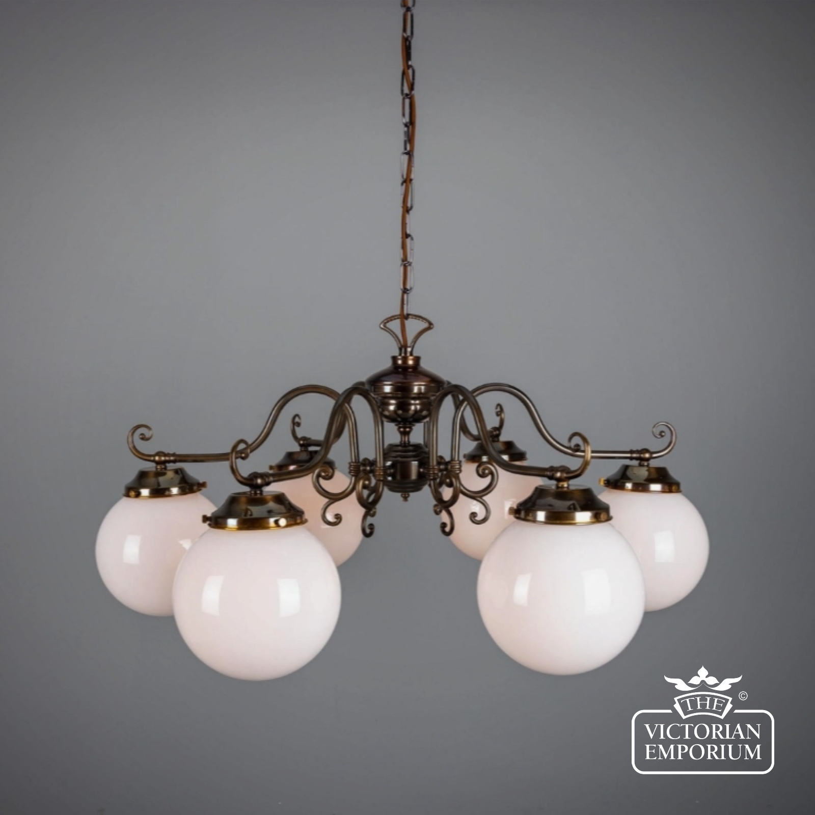 The Kilturk chandelier features a traditional ornate brass frame with six curved brass arms with opal glass globe shades. This traditional chandelier has an impressive size.