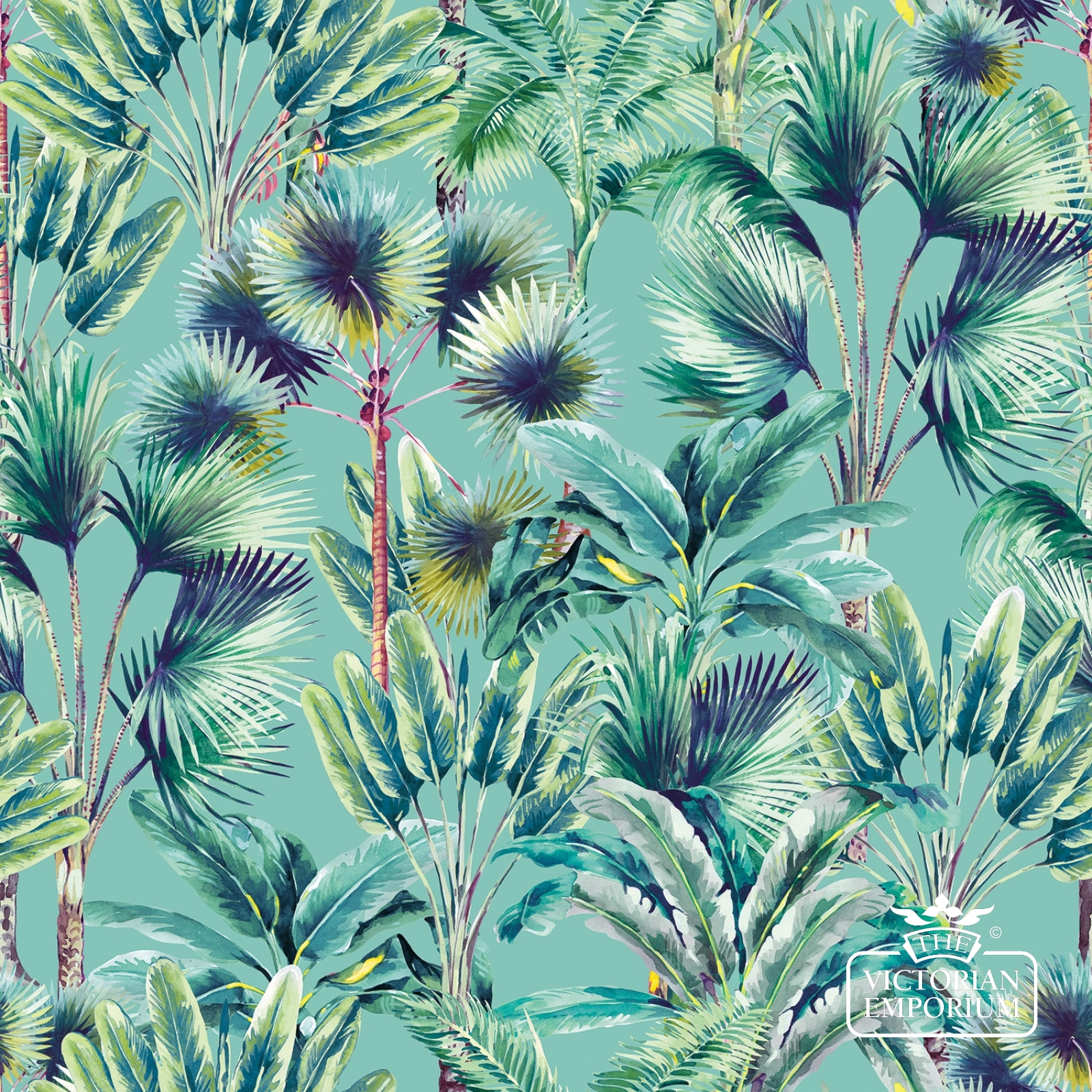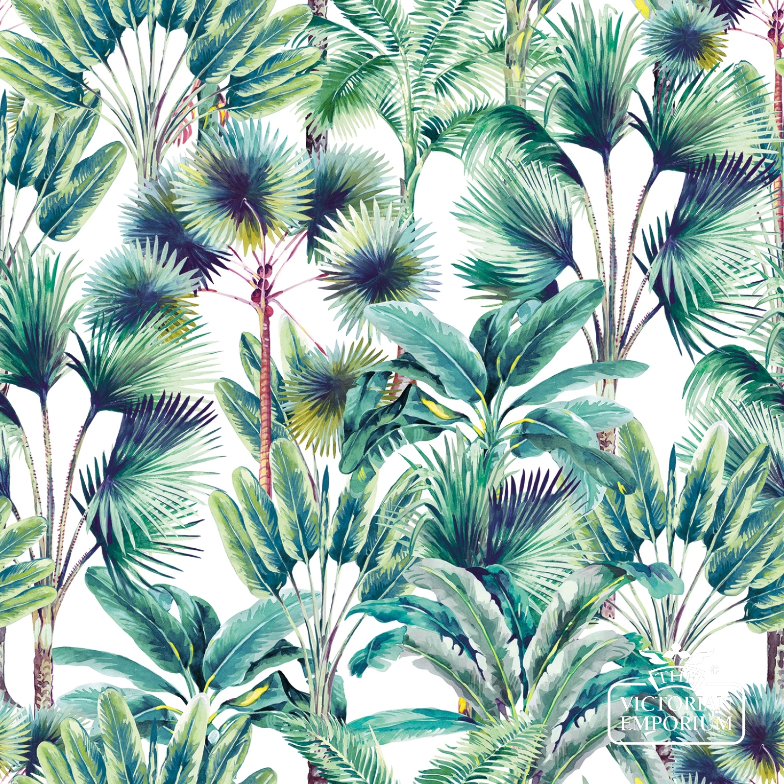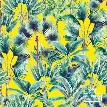A really stunning fabric from the Tropical Velvets collection featuring exotic ferns and green leafy plants in vibrant colours.