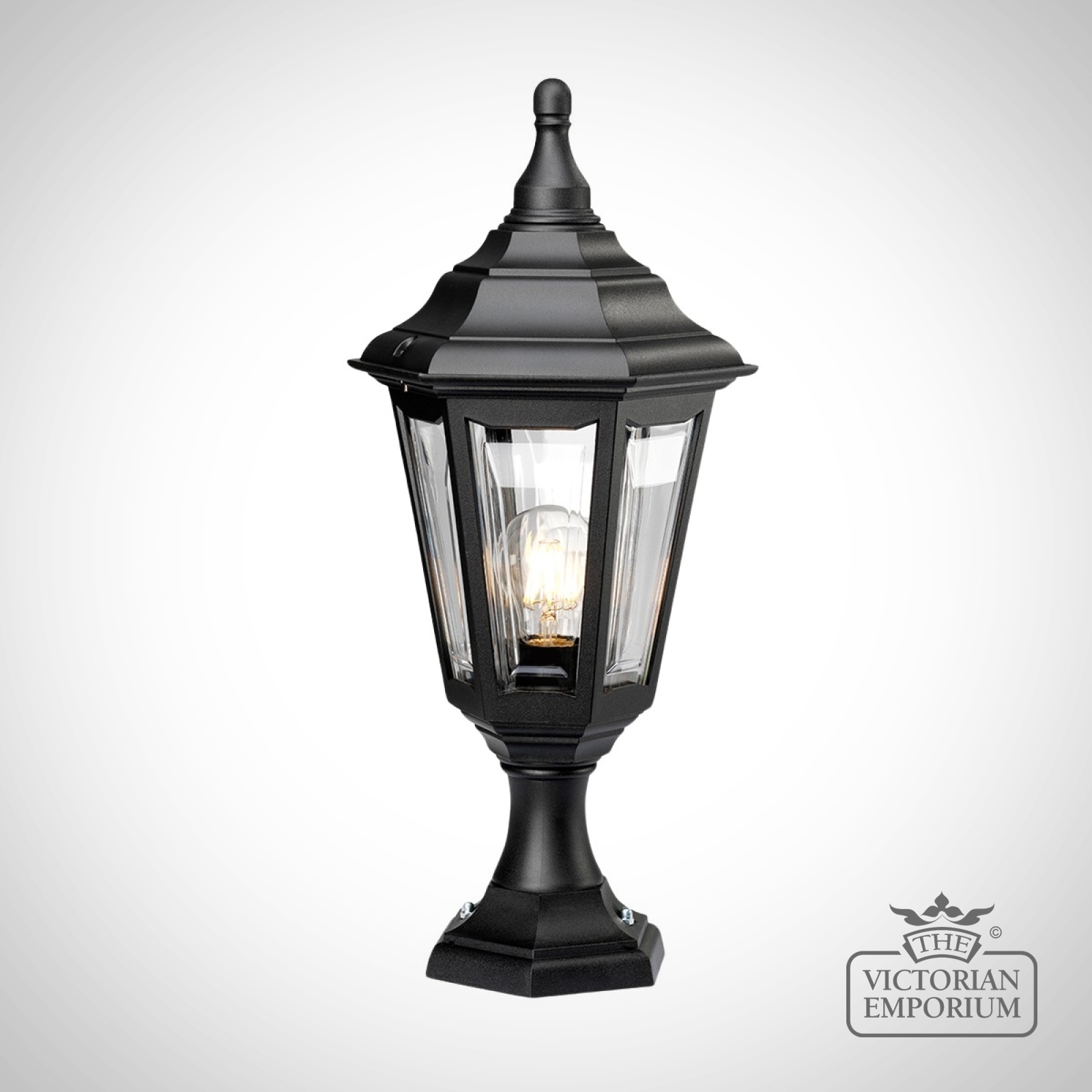 The Kinsale 6 sided pedestal or porch lantern is designed to be corrosion proof and impact resistant, made from Black Polymer with transparent polycarbonate diffusers.