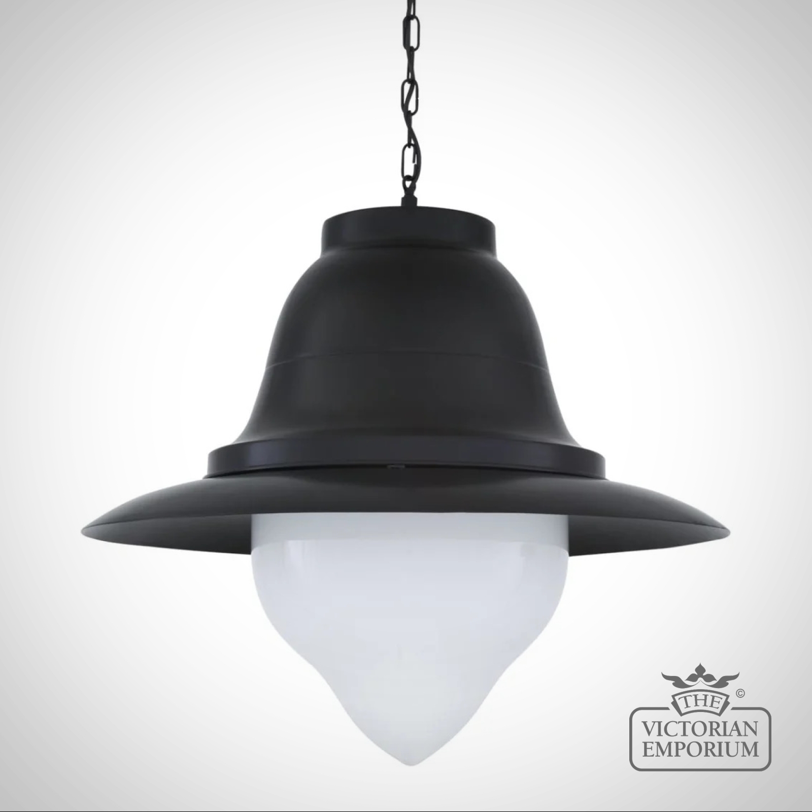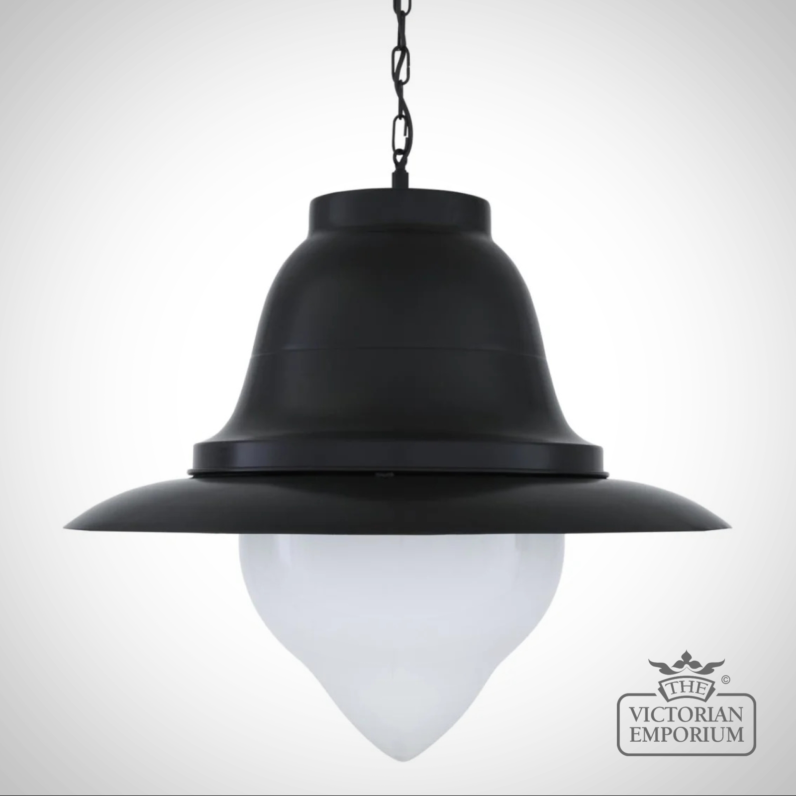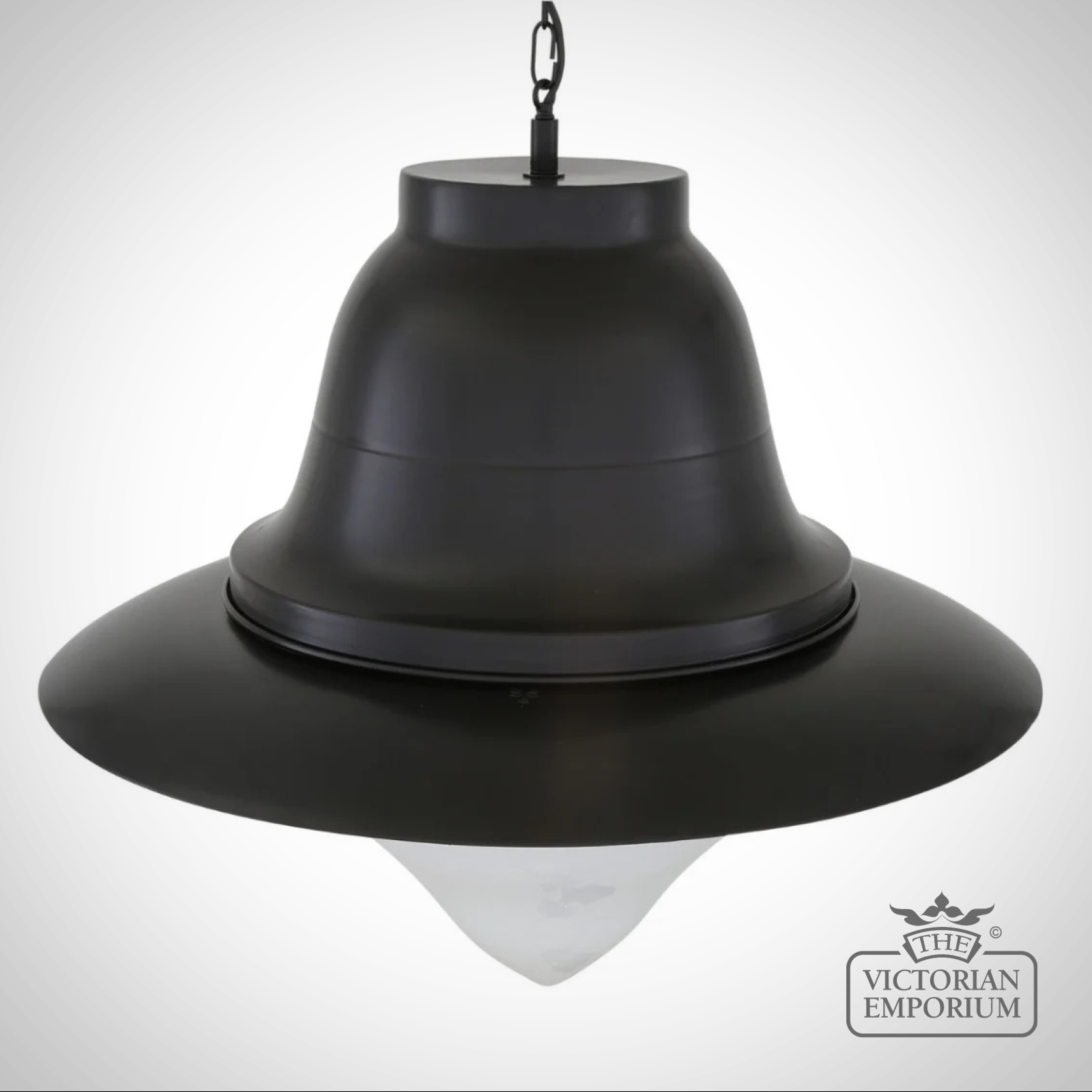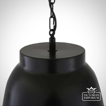 The Knightsdale pendant is a large nautical-style pendant with a large, matte-black aluminium shade that encloses a cone-shaped glass shade. The glass shade can be clear or opal as desired.