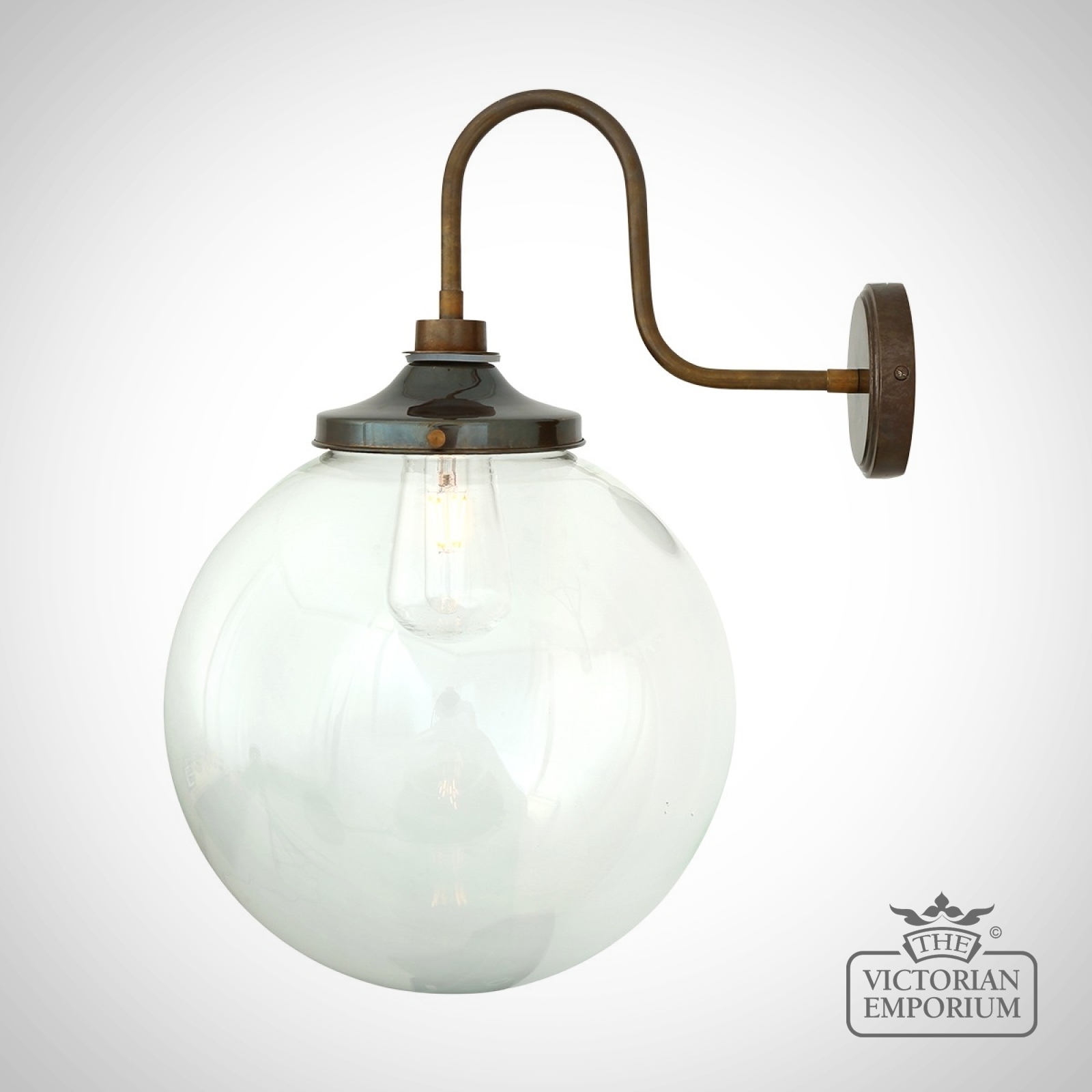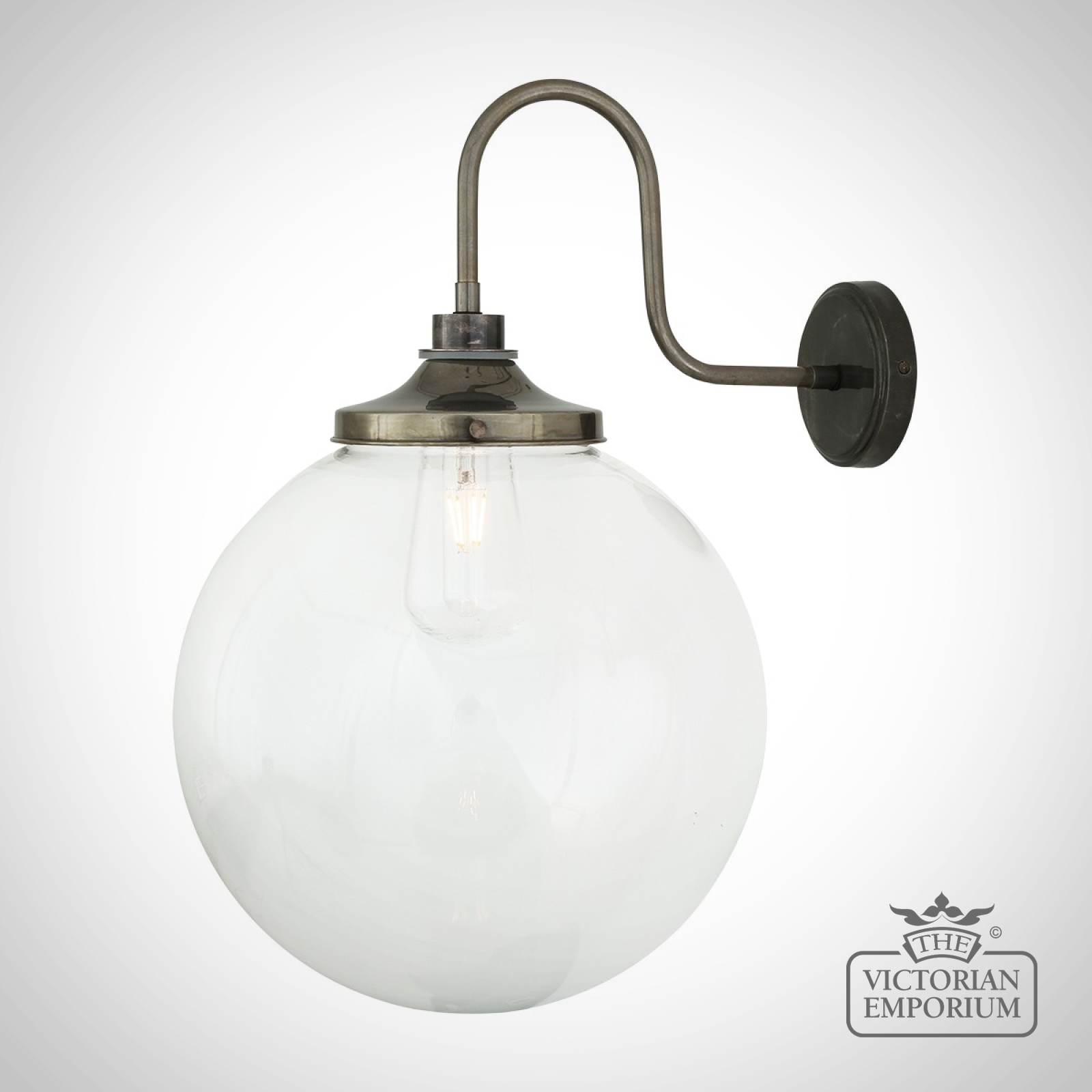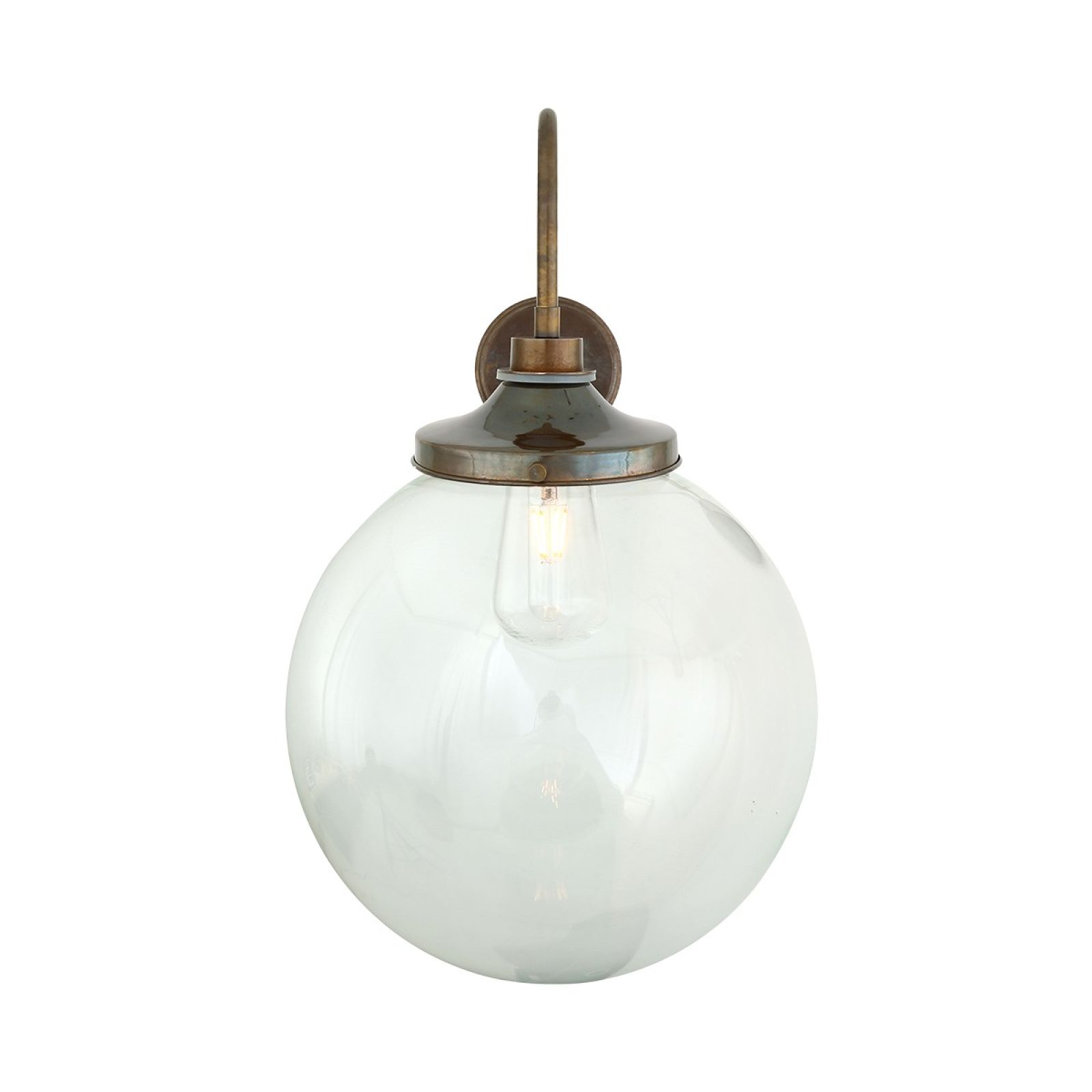 The Lagoon Bathroom or Outdoor Wall Light is a simple globe wall light with elegant swan neck and a clear glass globe shade and can be used in most bathroom locations or outdoors as a porch wall light.