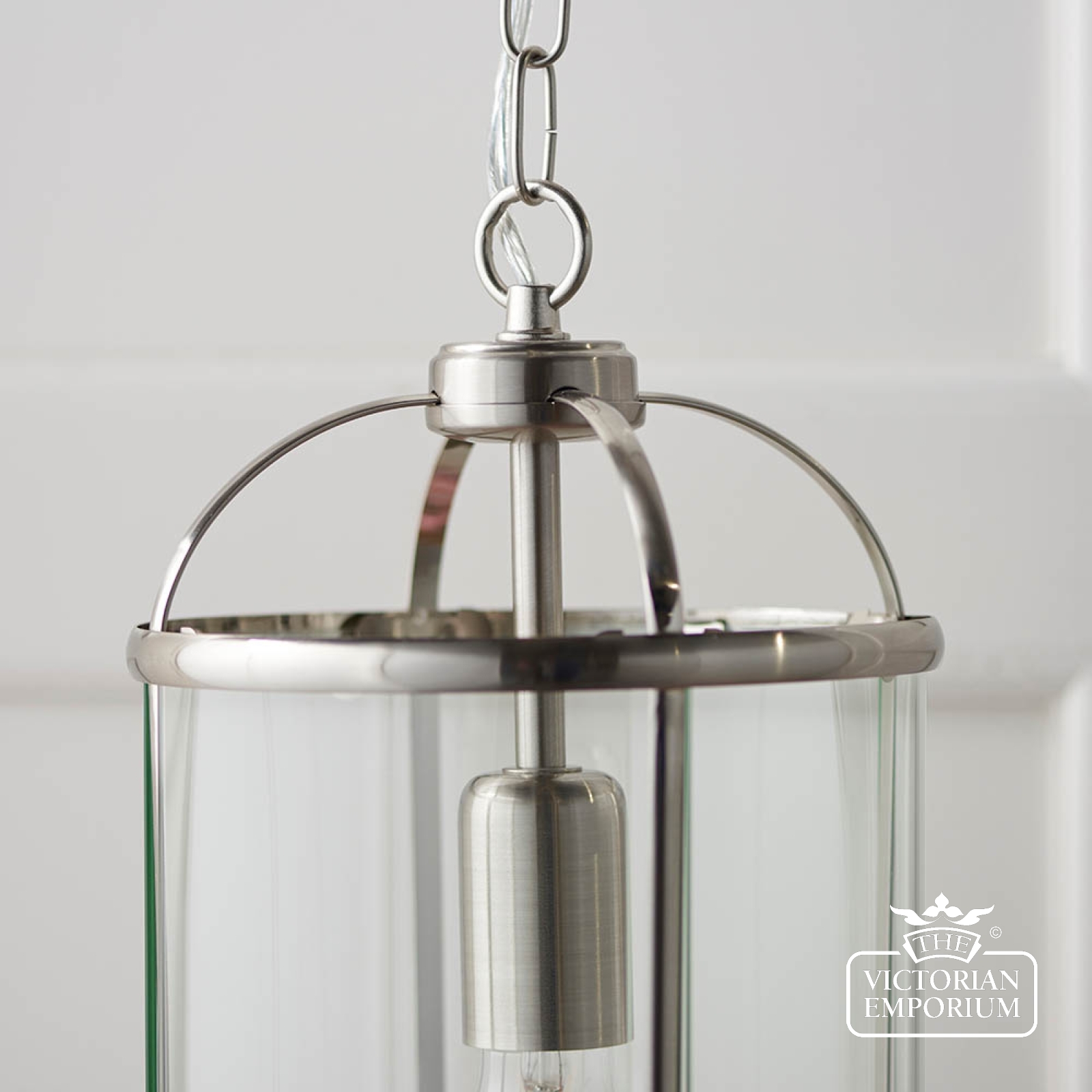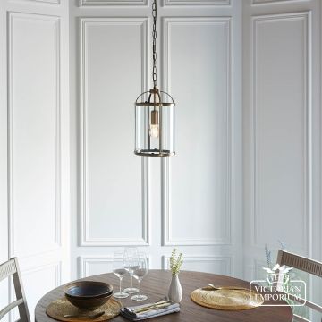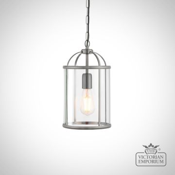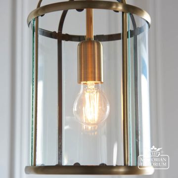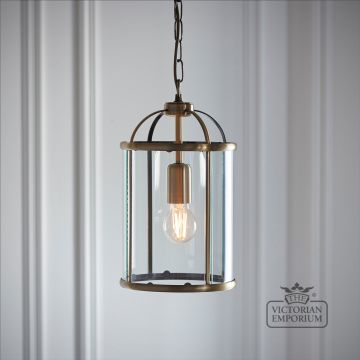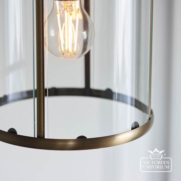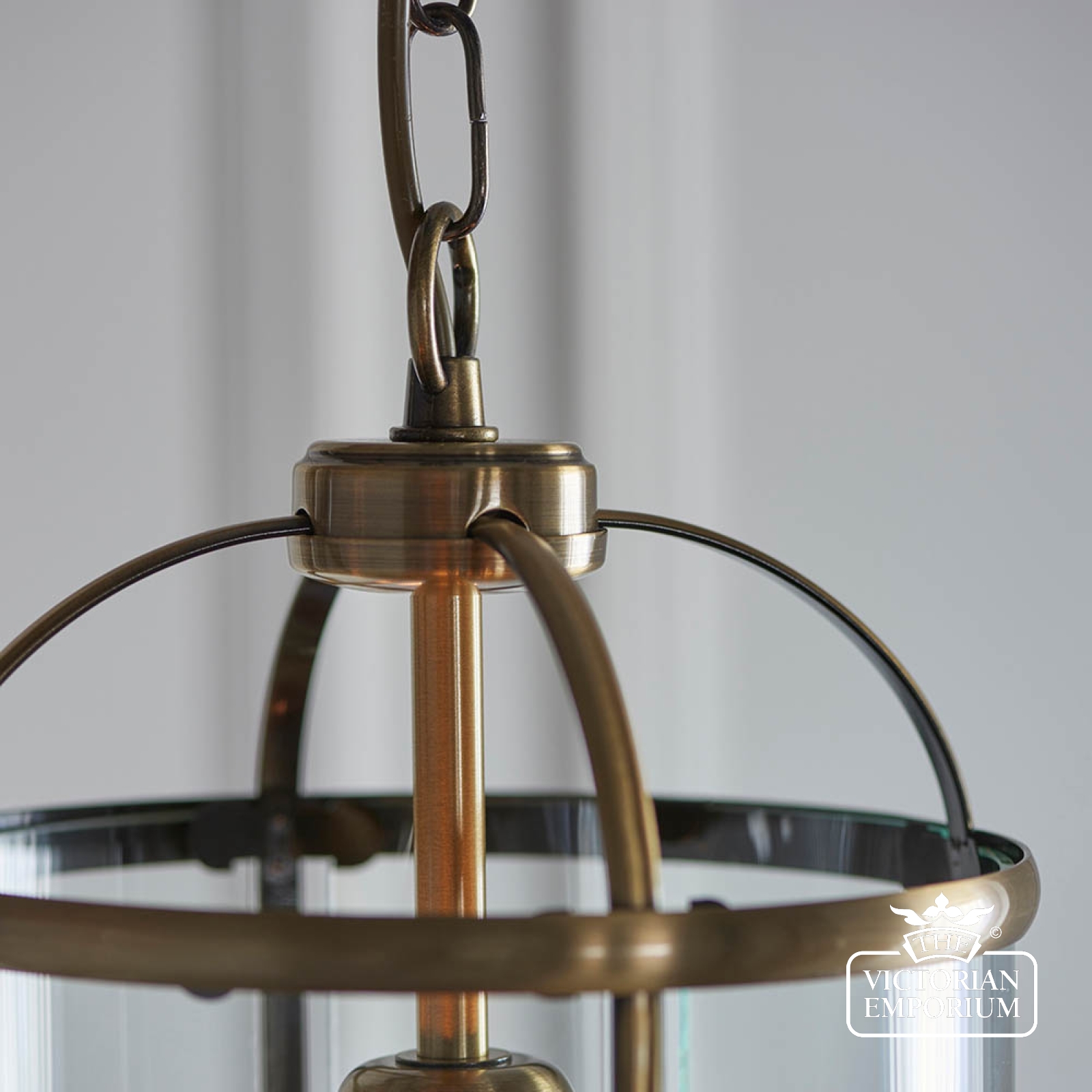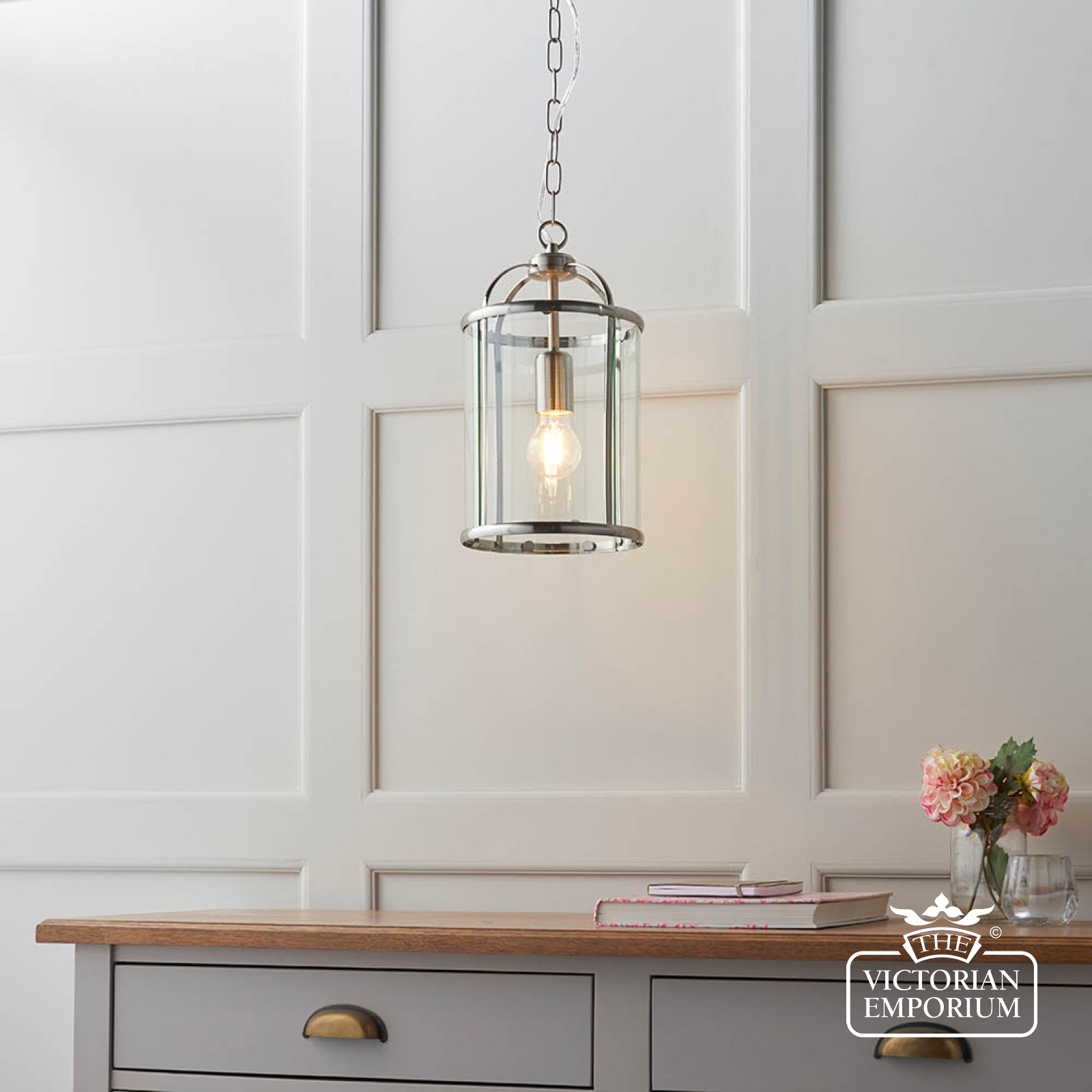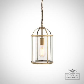The Lambeth one light pendant has an adjustable drop and combines a metal frame work with an antique brass or satin nickel finish and clear glass panels.