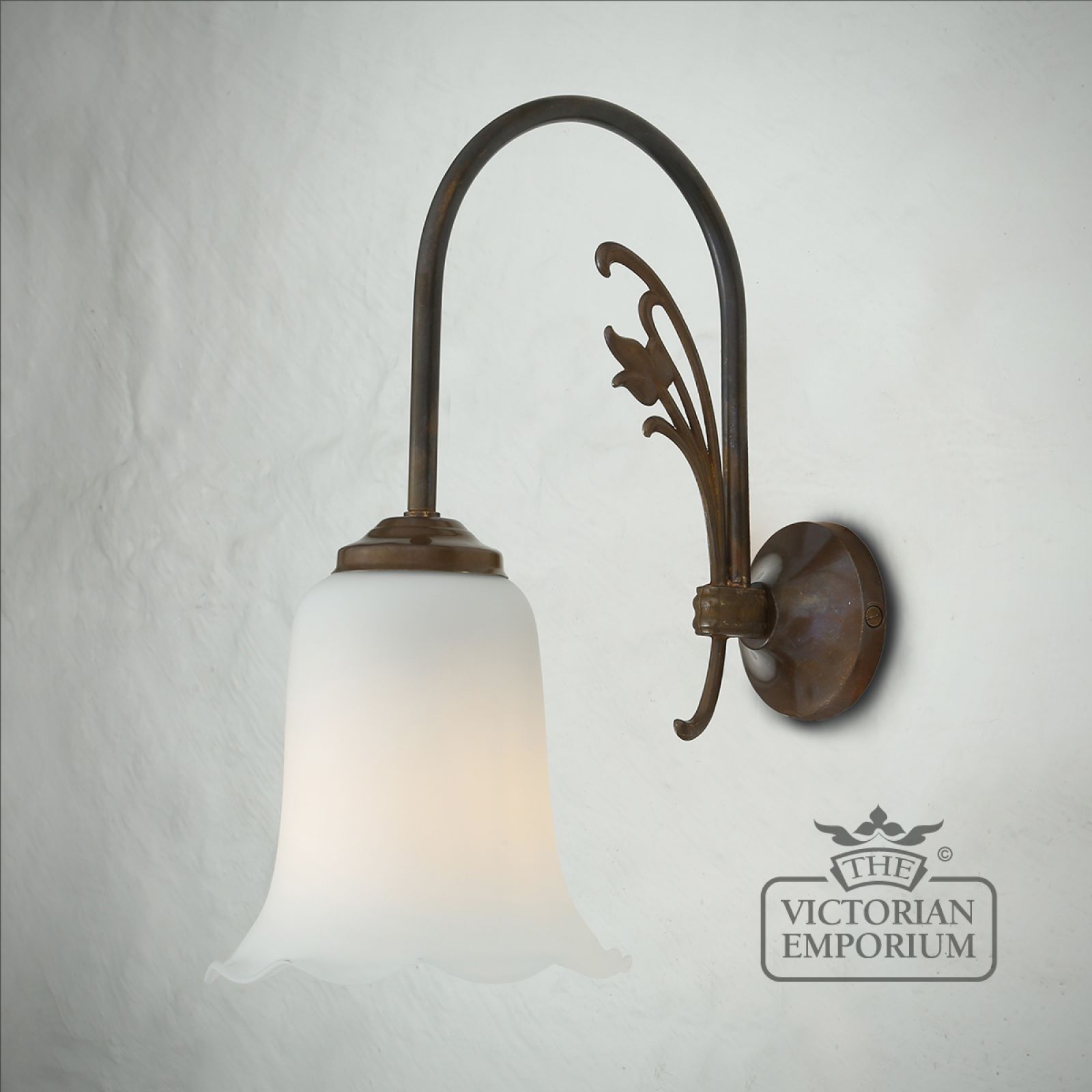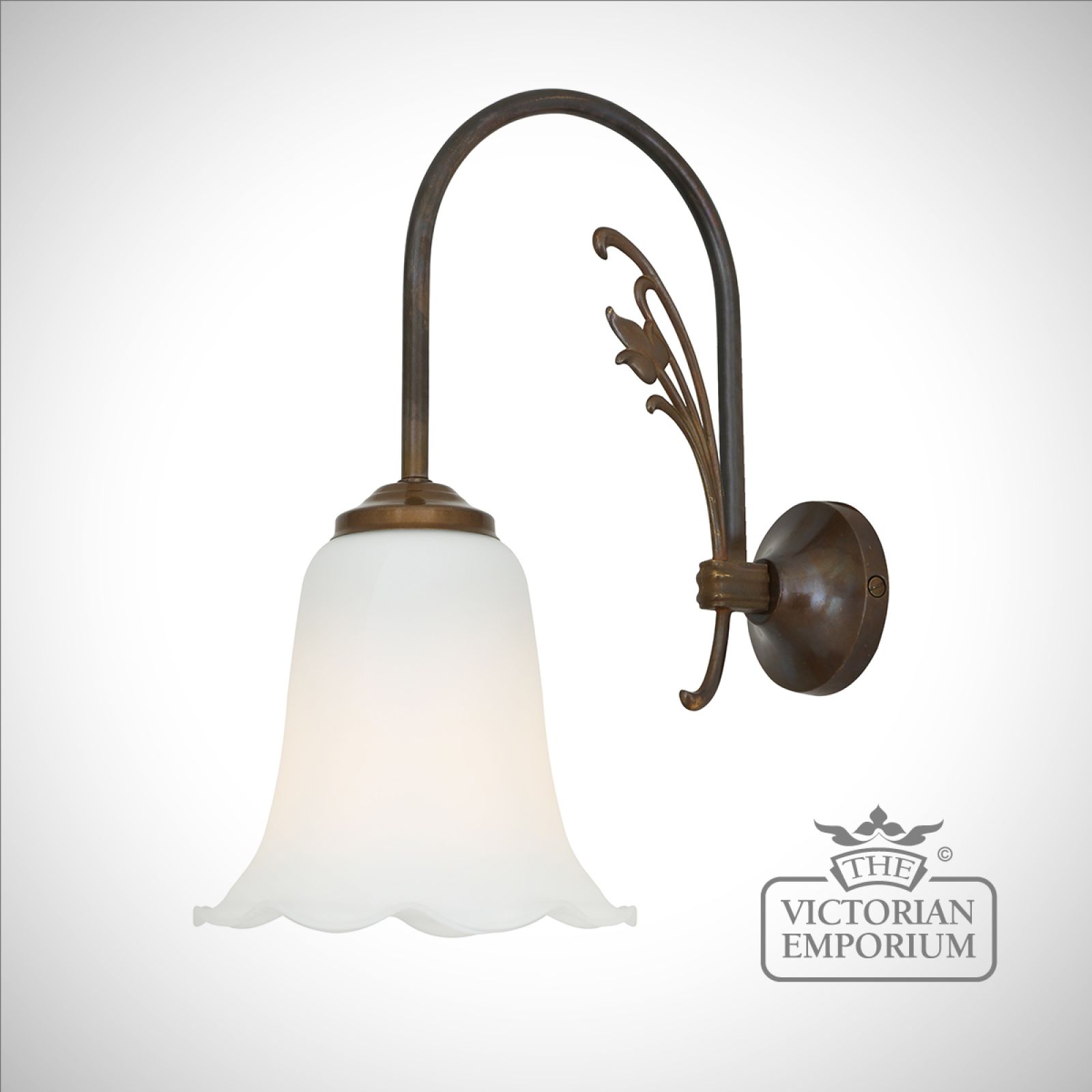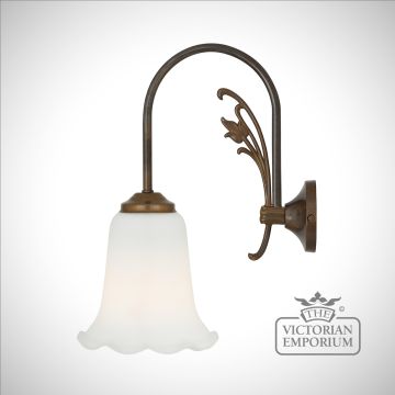 The Lane wall light is a traditional brass light featuring a single swan neck arm attached to a concave brass wall rose on one side and a crimped edge opal bell glass lamp shade on the other