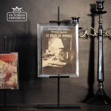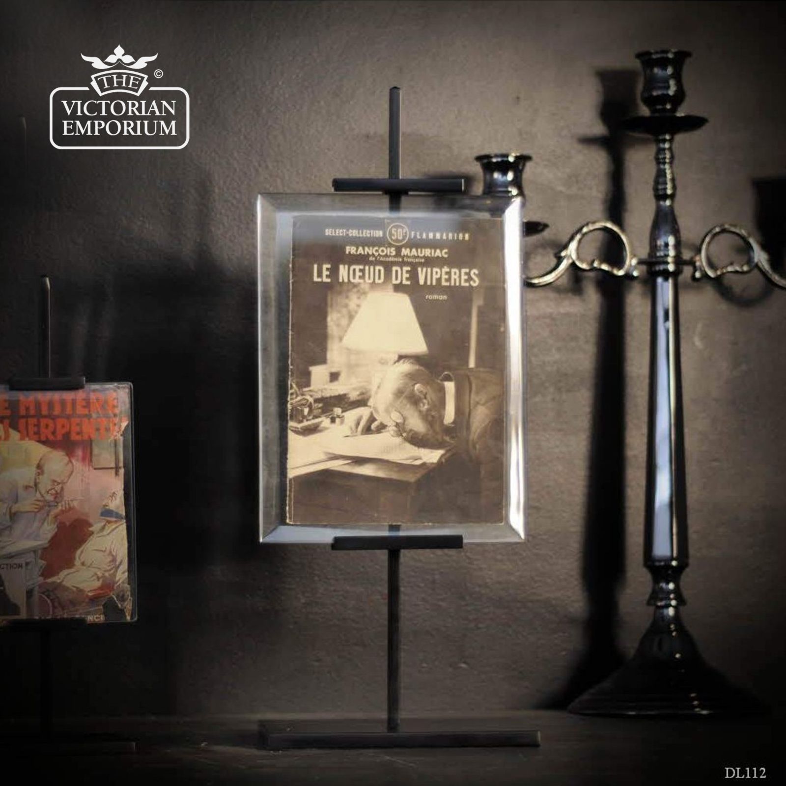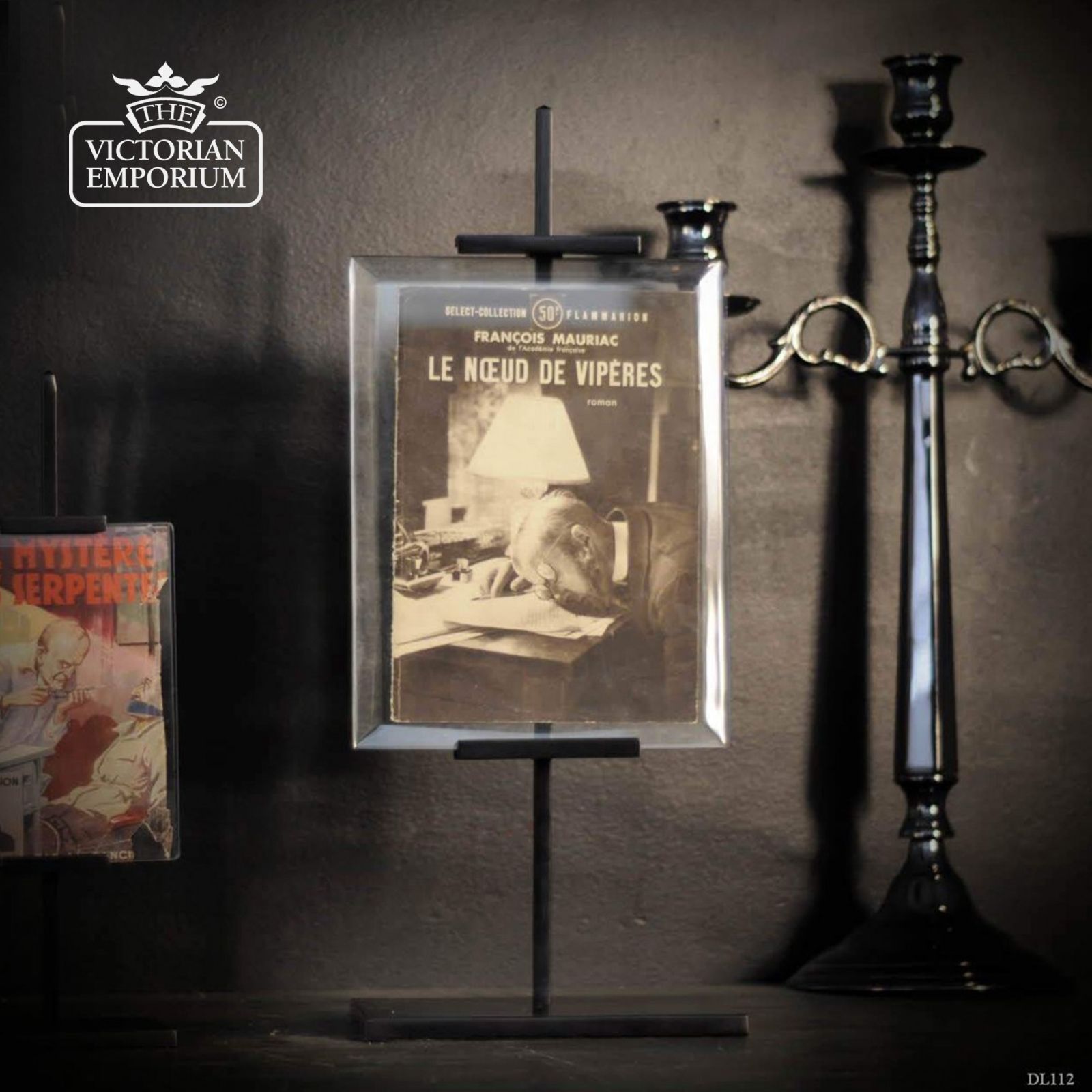Superb and elegant easel made from aluminium and painted black. The beveled glass that holds the image measures 27cmx21cm.