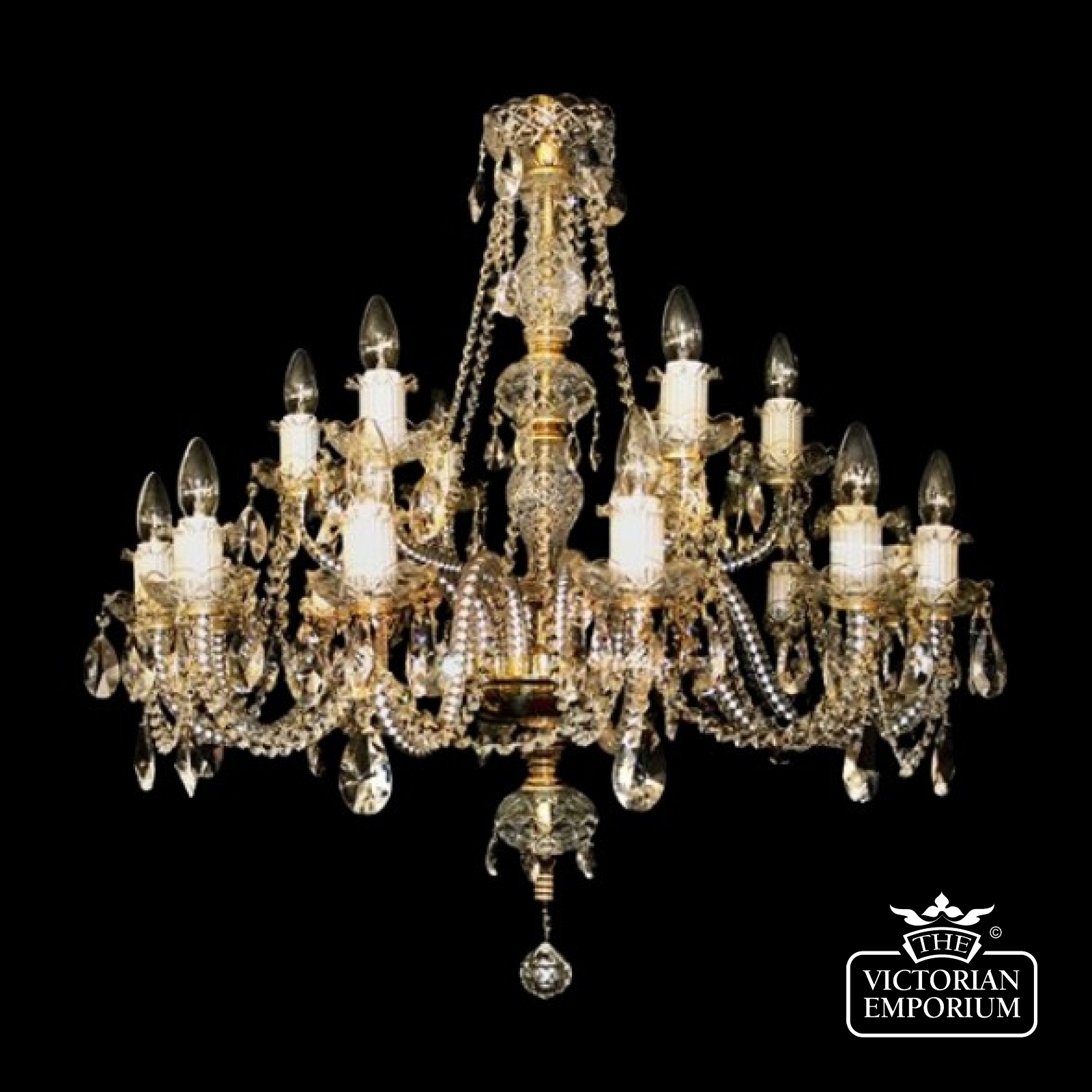 The crystal trimmings on our chandeliers are as follows: Exclusive Bohemian Crystal (Czech republic 30%PbO). The machine cut trimmings are characteristic with a brilliant polish and decompose the light beams in a light spectrum. Preciosa crystal (Czech republic 30%PbO).