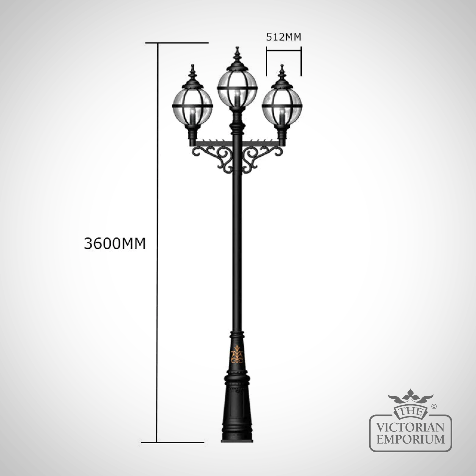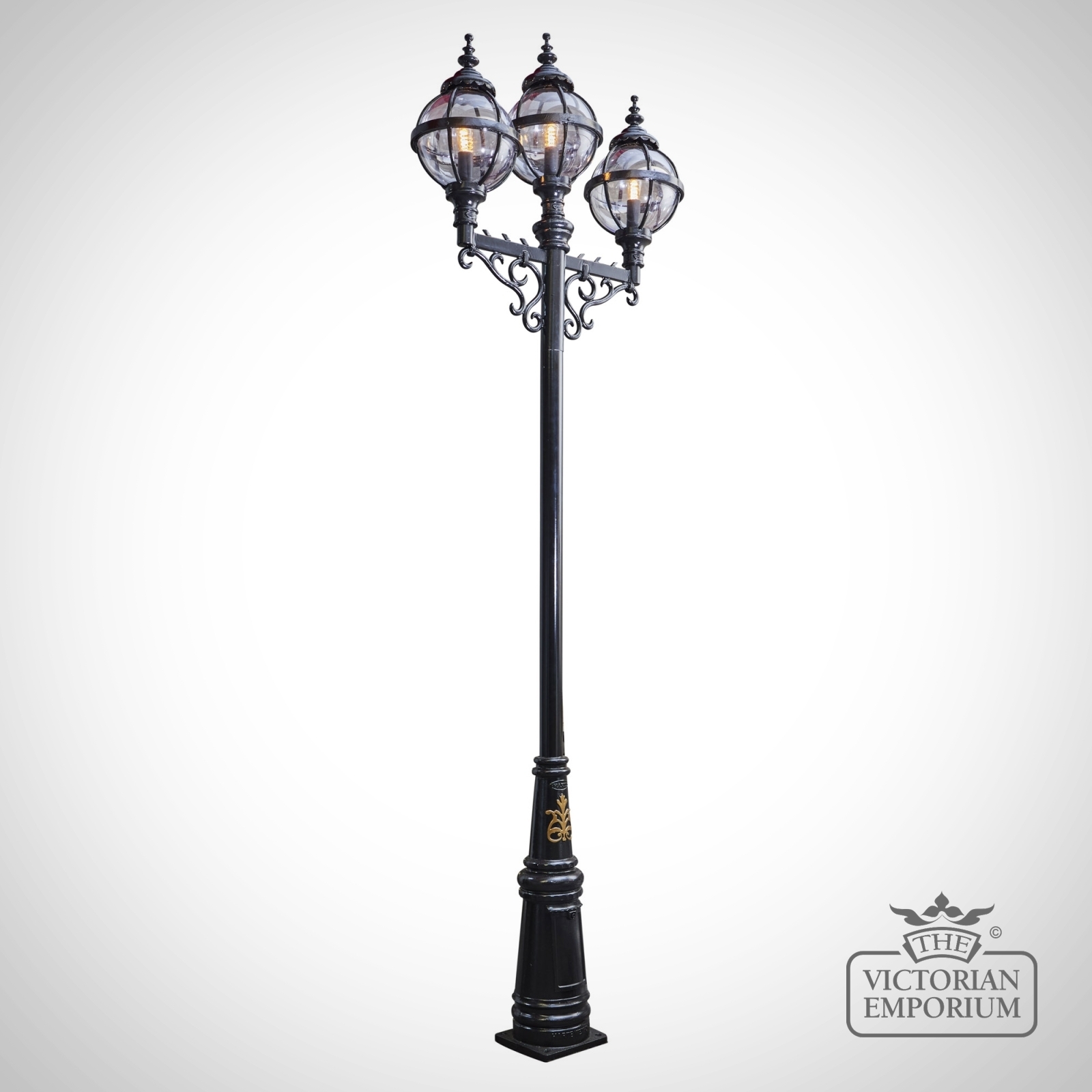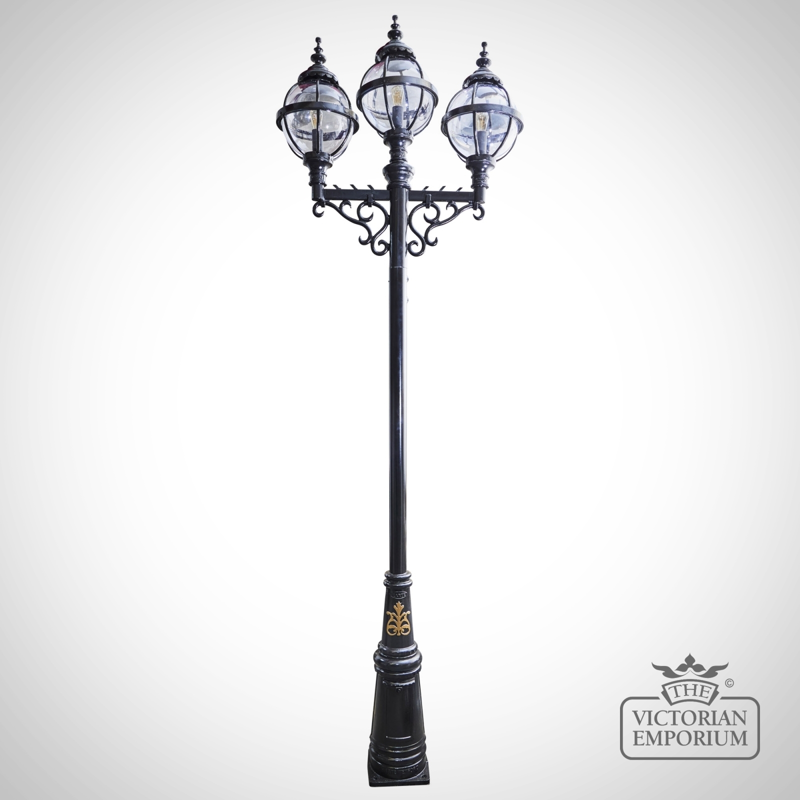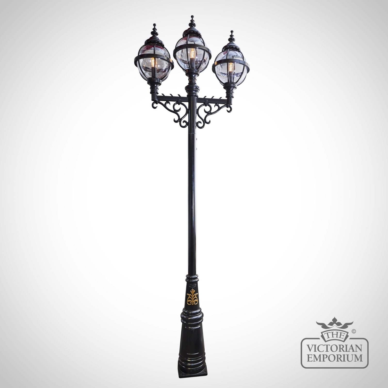 Large traditional Victorian outdoor cast iron lamp post topped with traditional globe lanterns in triple formation, ideal for large driveways or larger open spaces. It has an excellent lighting spread